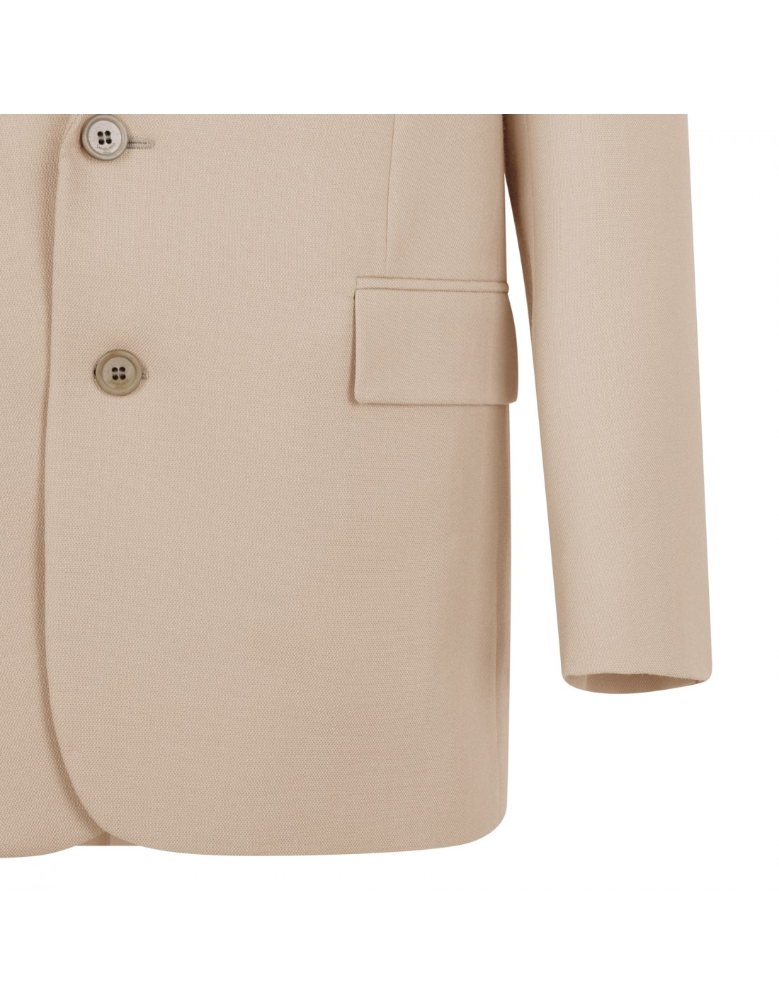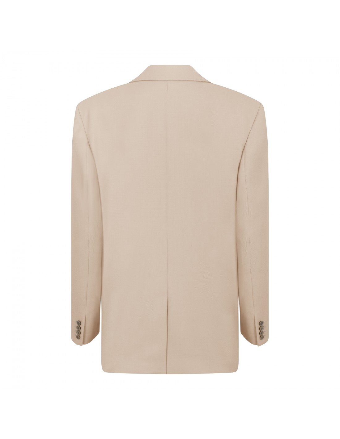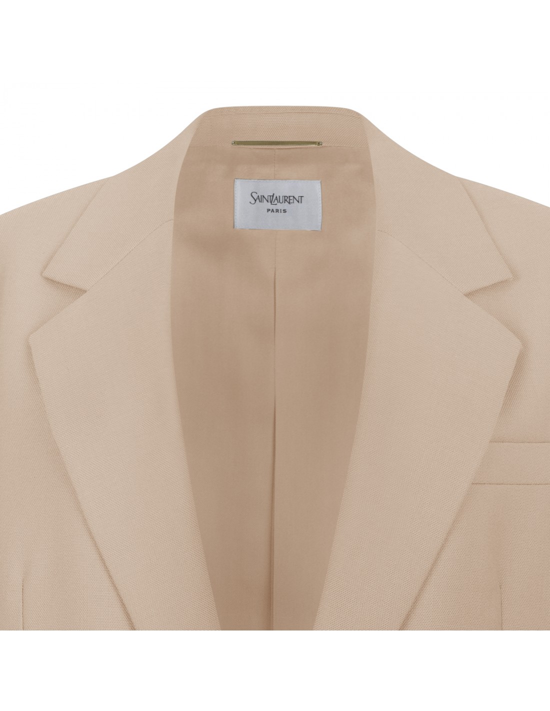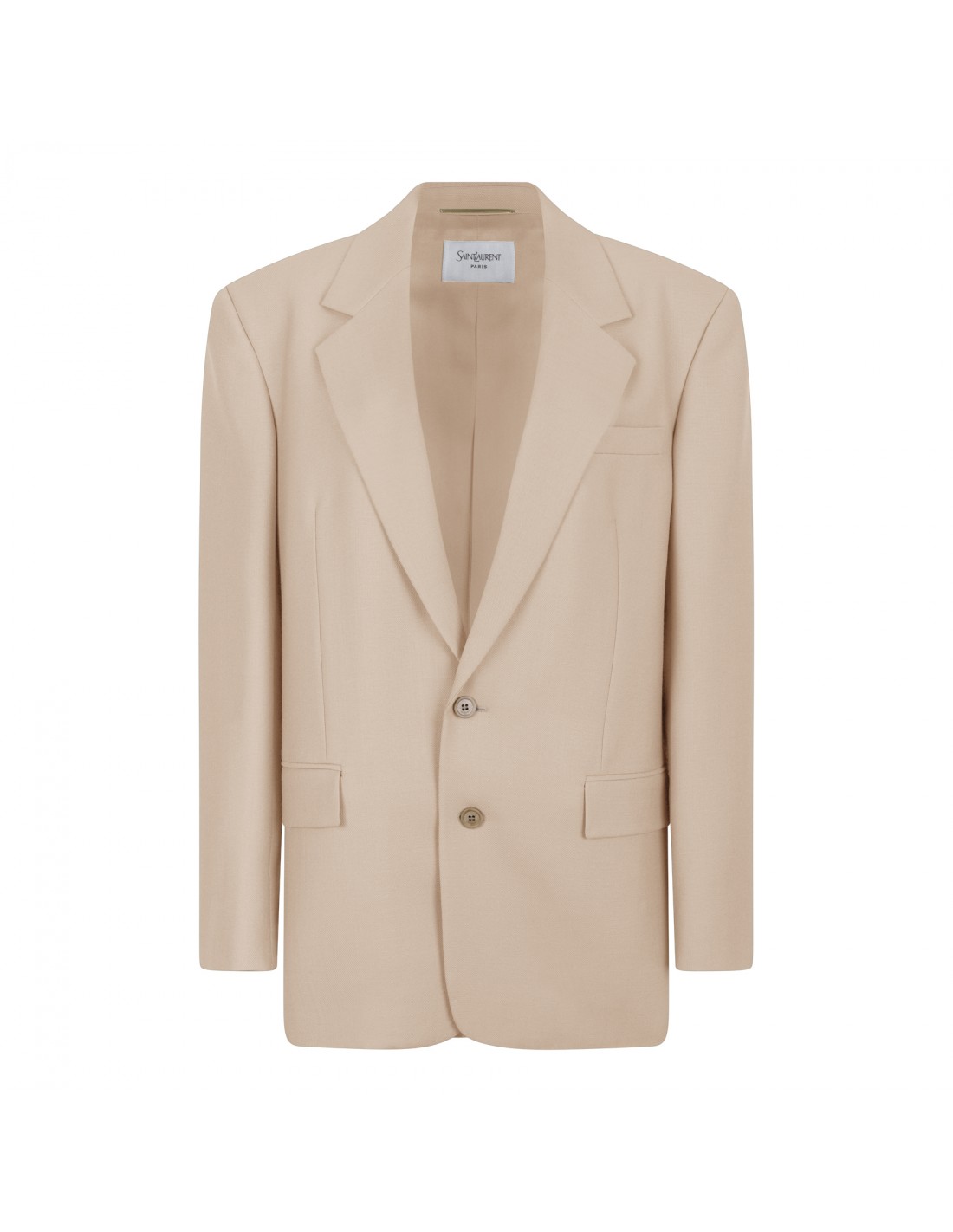 Beige wool and silk blend jacket from Saint Laurent featuring single-breasted silhouette, button closure on front, notched collar, front flap pockets, welt chest pocket, buttoned cuffs, padded shoulders, back vent.