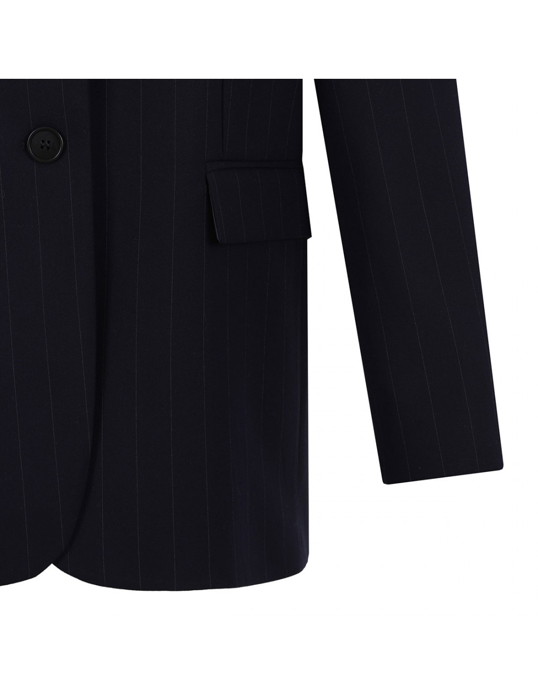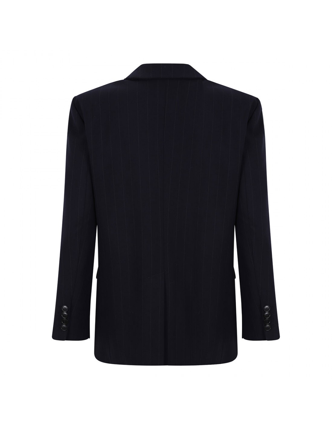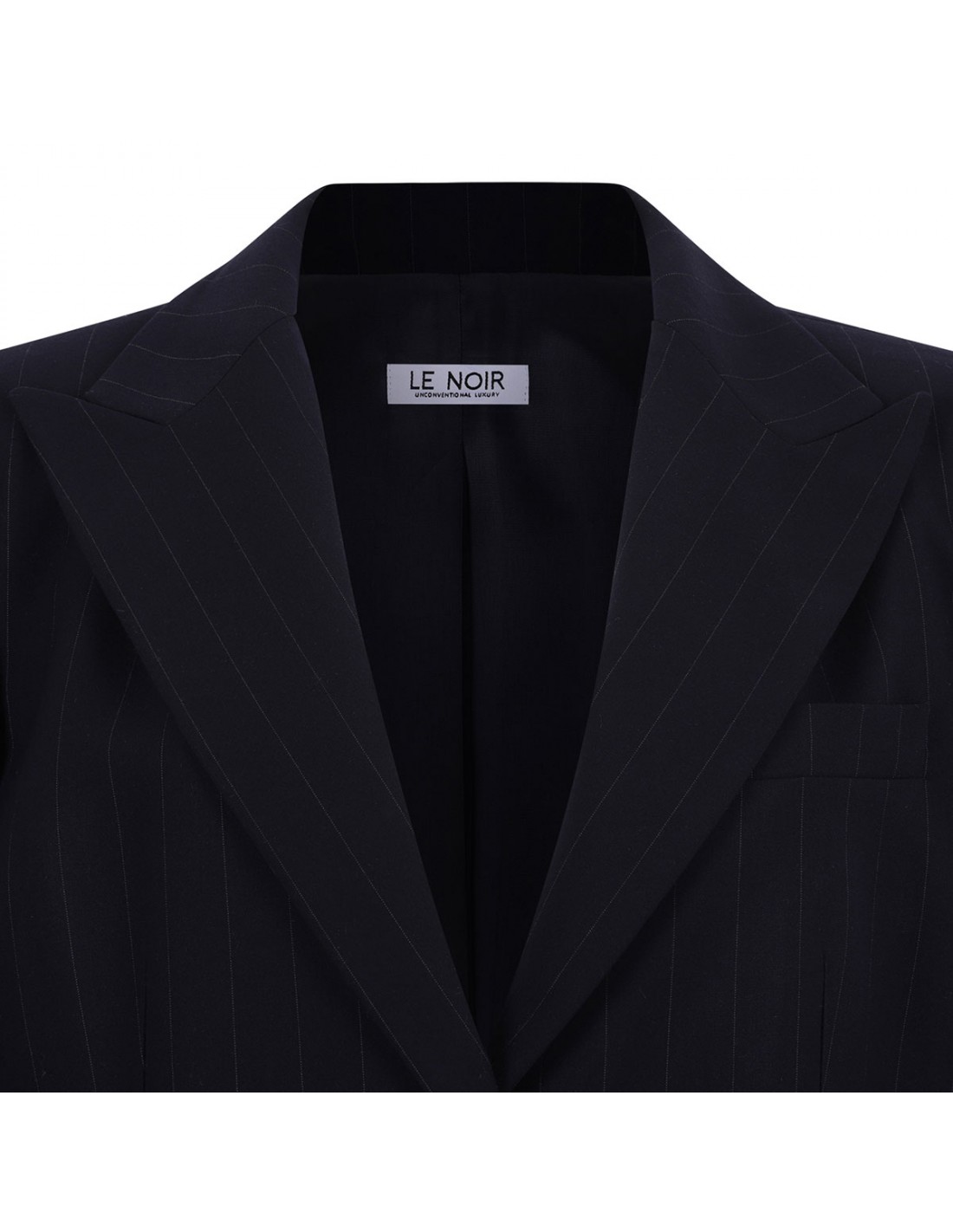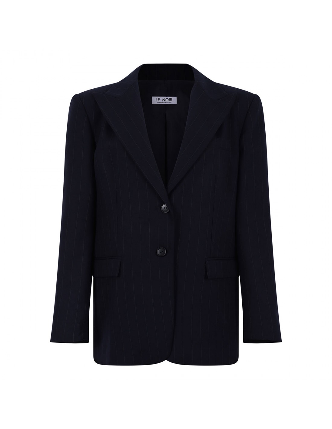 Navy viscose blend blazer from Le Noir featuring pinstriped motif, single-breasted style, classic lapel, button closure, side flap pockets, back vent, chest pocket and buttoned cuffs.