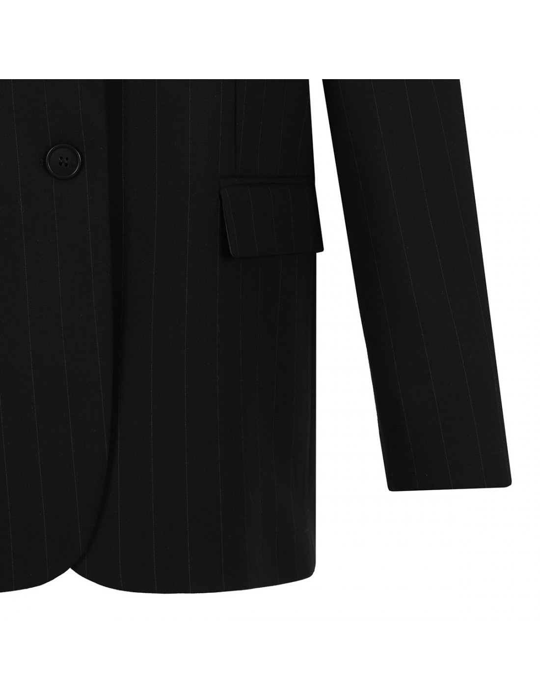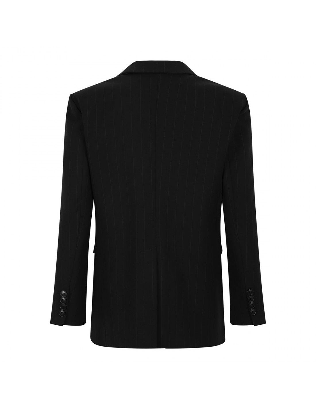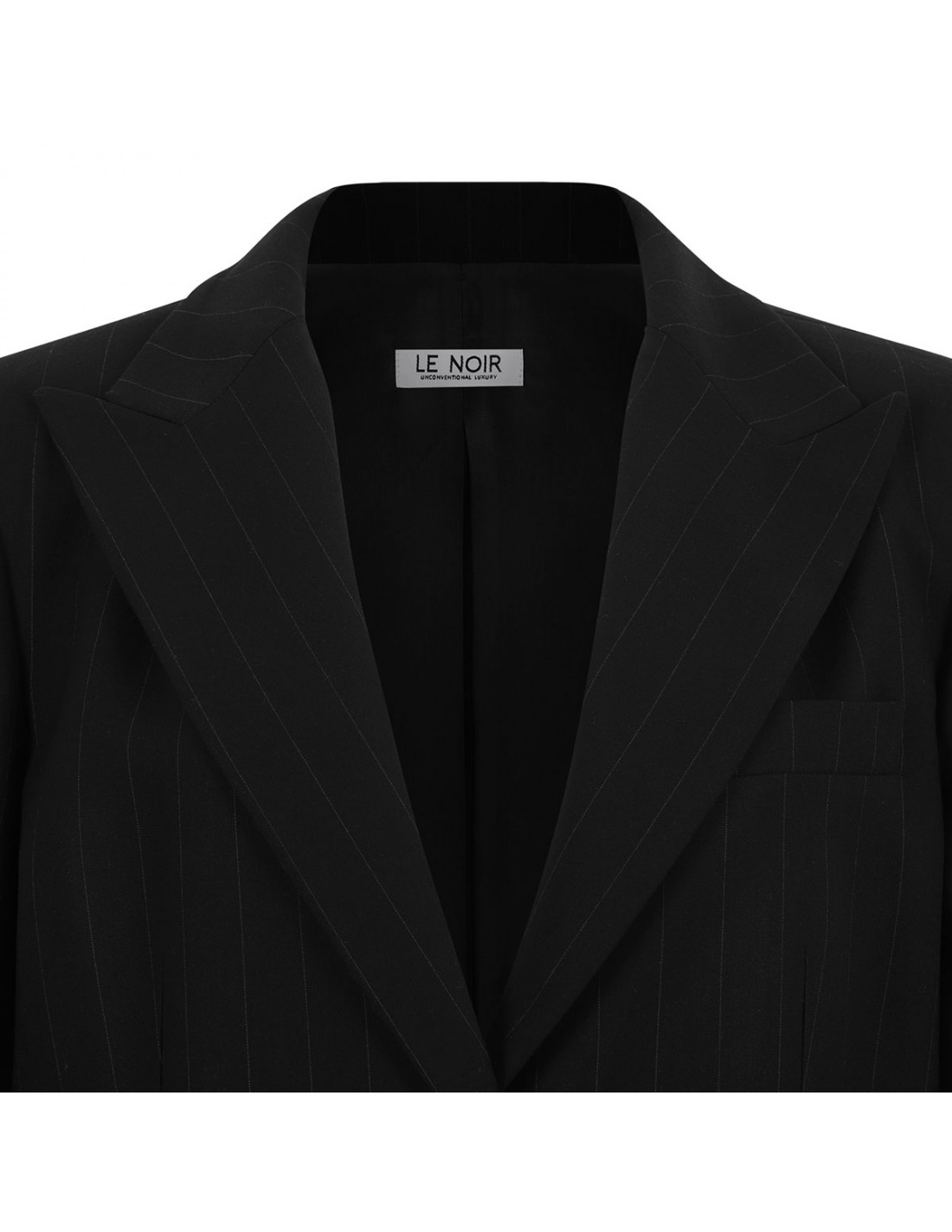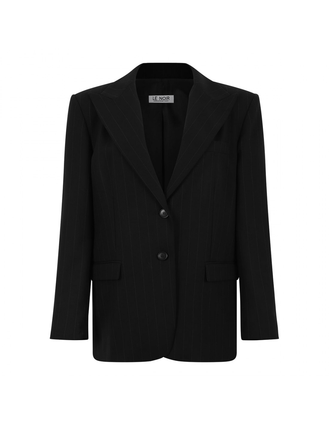 Black viscose blend blazer from Le Noir featuring pinstriped motif, single-breasted style, classic lapel, button closure, side flap pockets, back vent, chest pocket and buttoned cuffs.