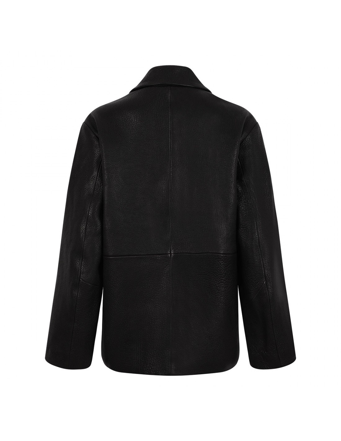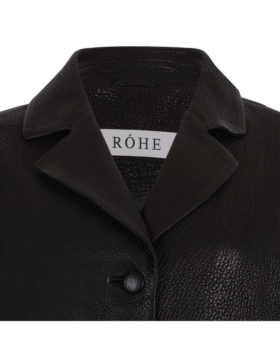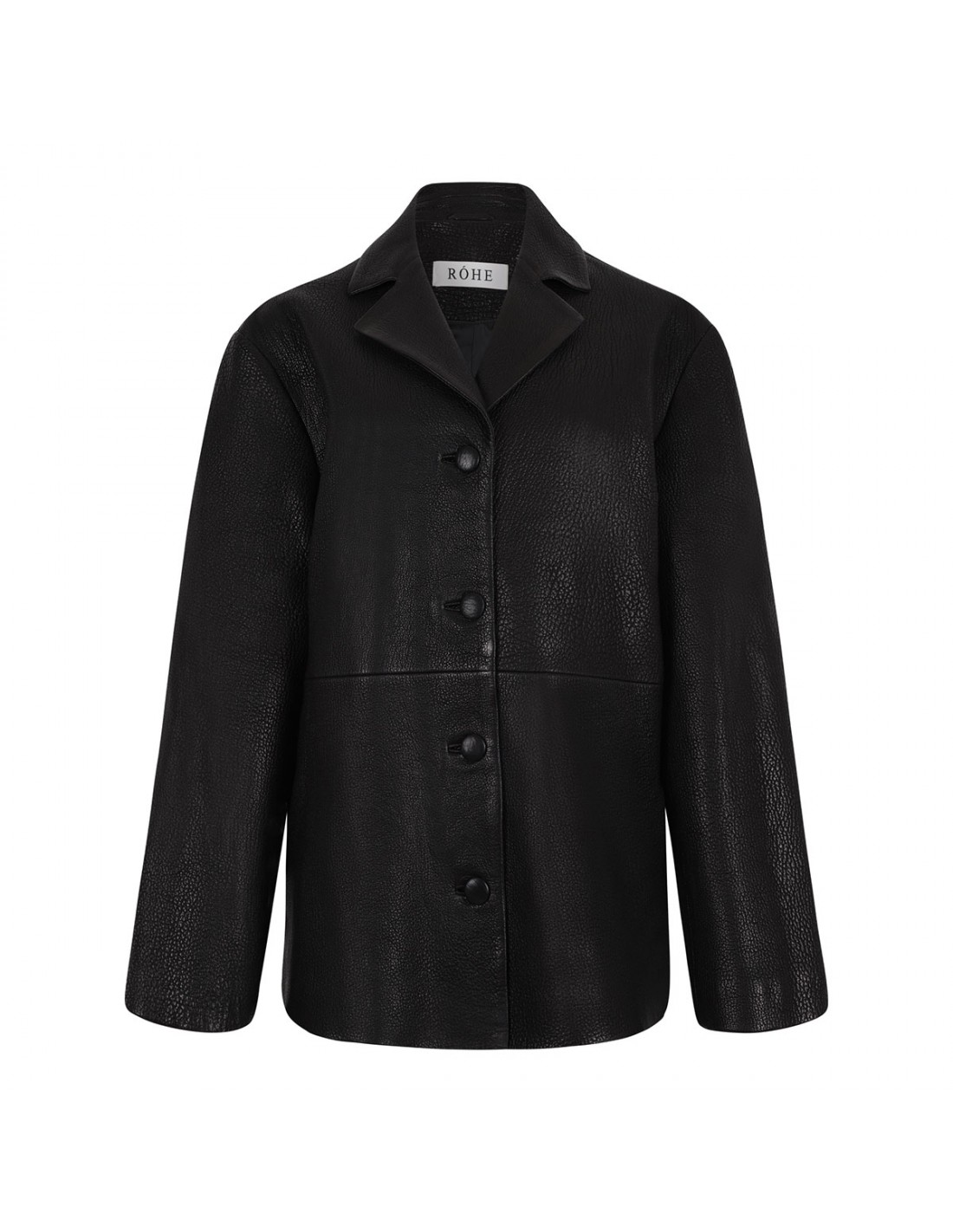 Black grainy leather jacket from Rohe featuring small lapel, structured boxy silhouette, single-breasted style, leather covered button closure, side pockets, small side splits.