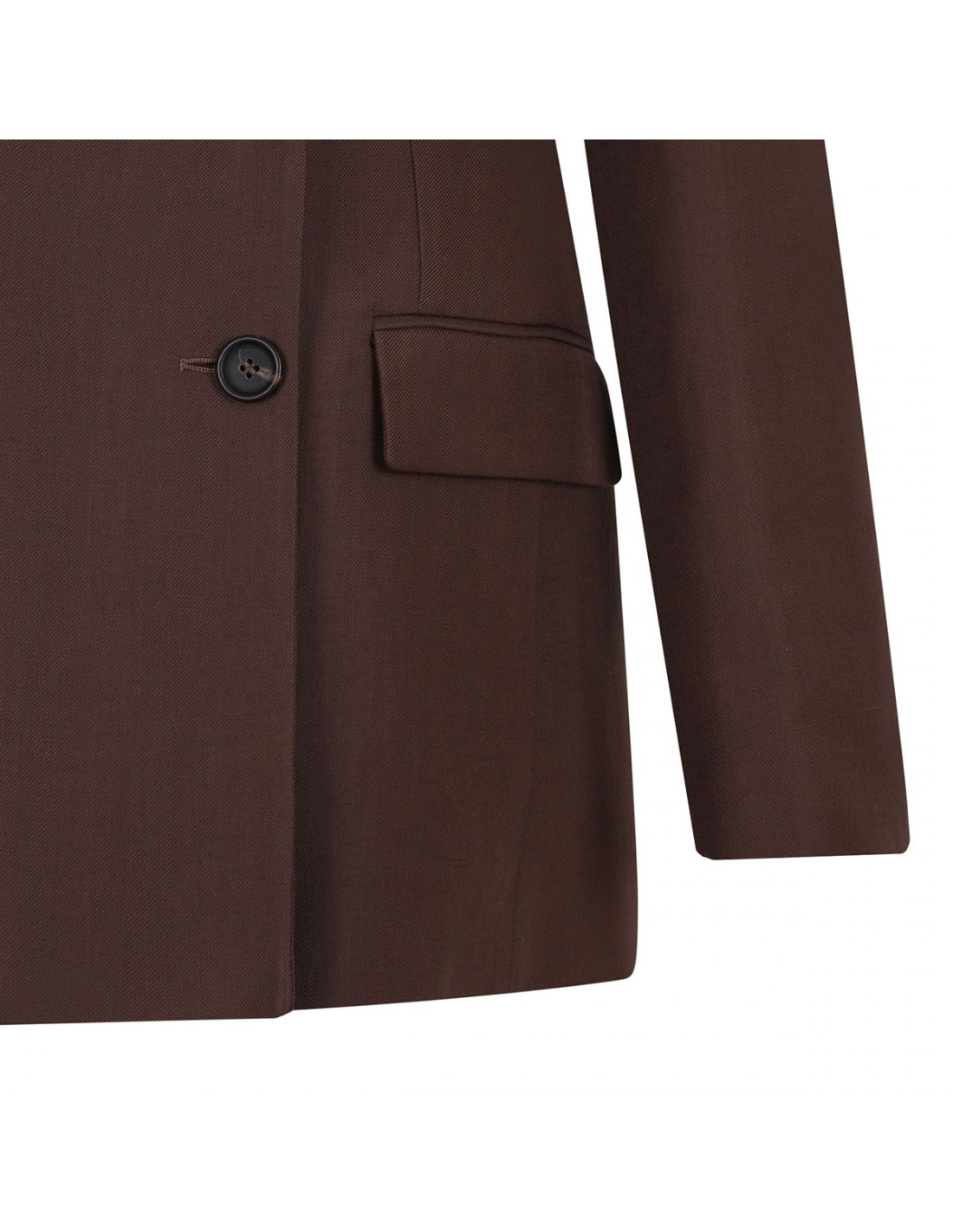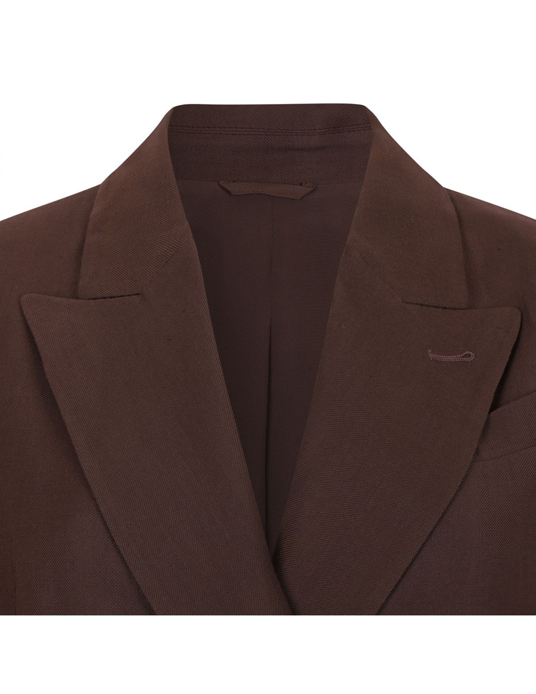 Chocolate brown viscose and linen fluid twill blazer from Brunello Cucinelli featuring double-breasted silhouette, shiny monili decoration on neck, horn button closure, peak lapel, buttoned cuffs, front flap pockets, single back vent, chest pocket, silk-blend crêpe lining.