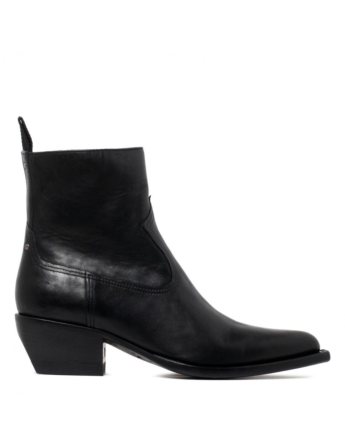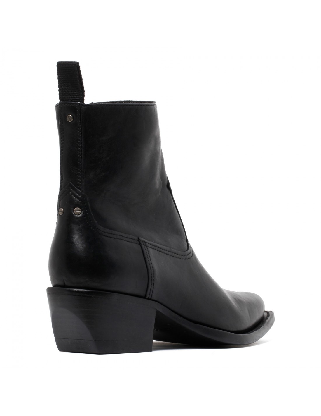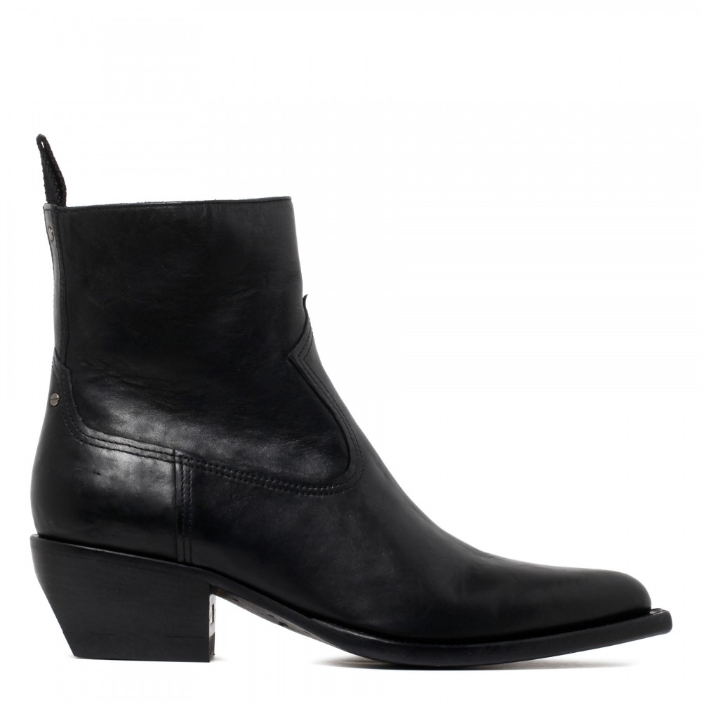 Black leather Debby booties from Golden Goose featuring zip fastening along side, tone-on-tone stitching, metal studs on back, golden metal plaque engraved with signature on heel, pointed toe, slanted heel, leather insole and sole.