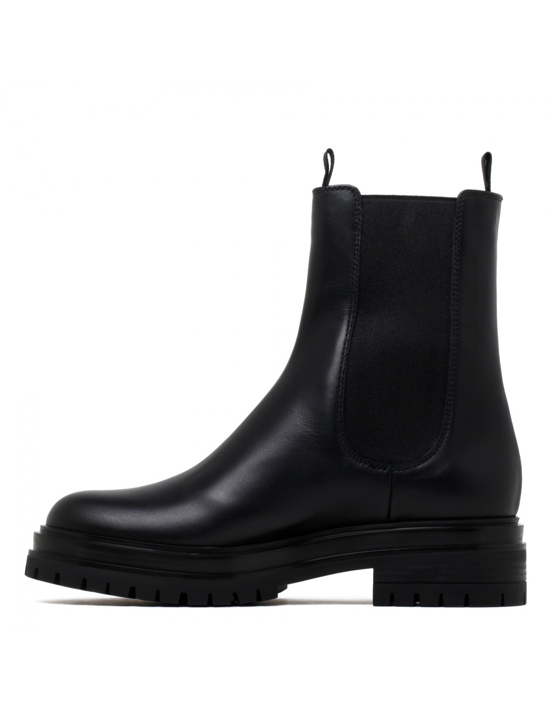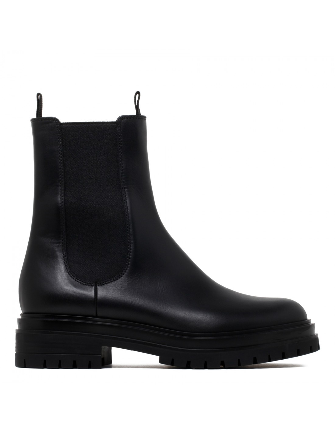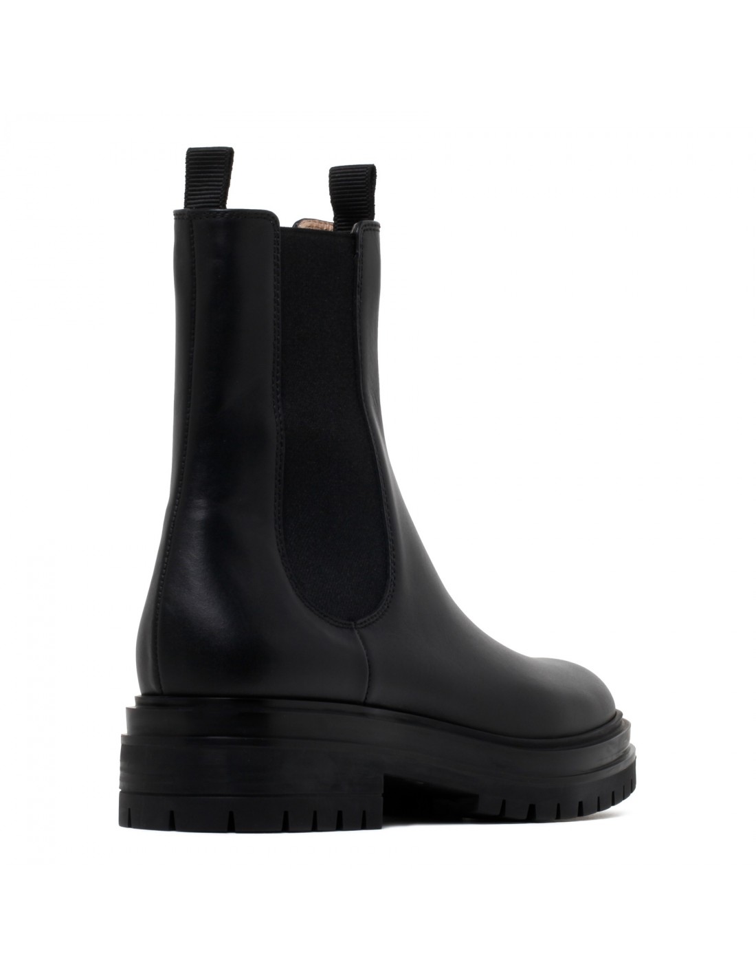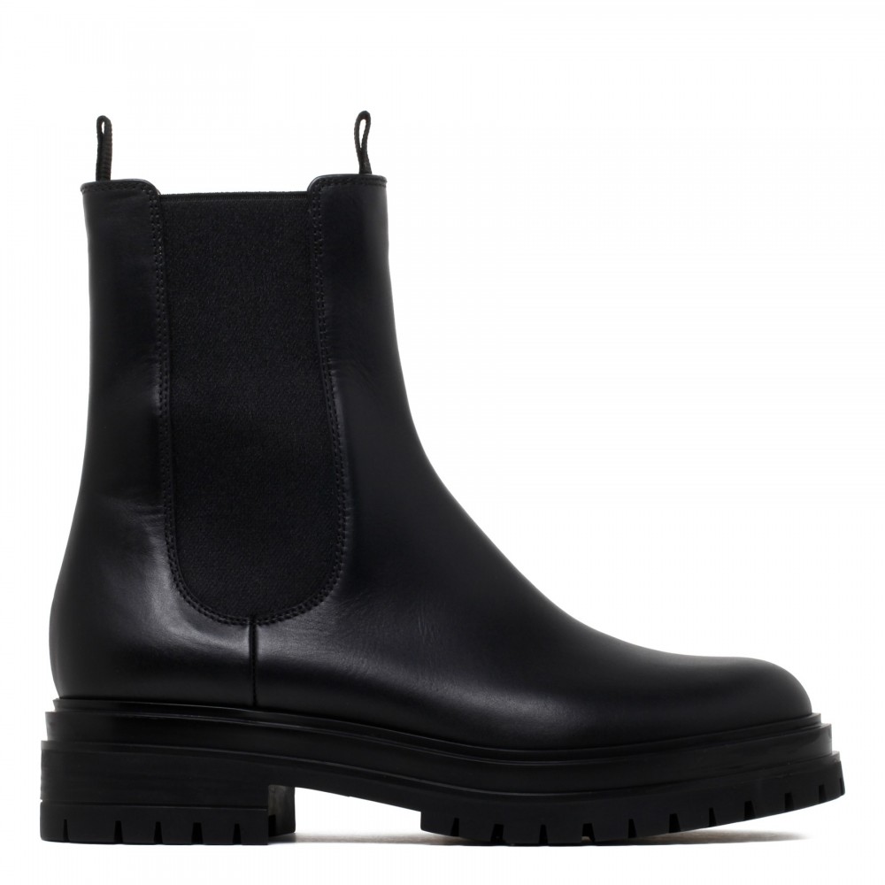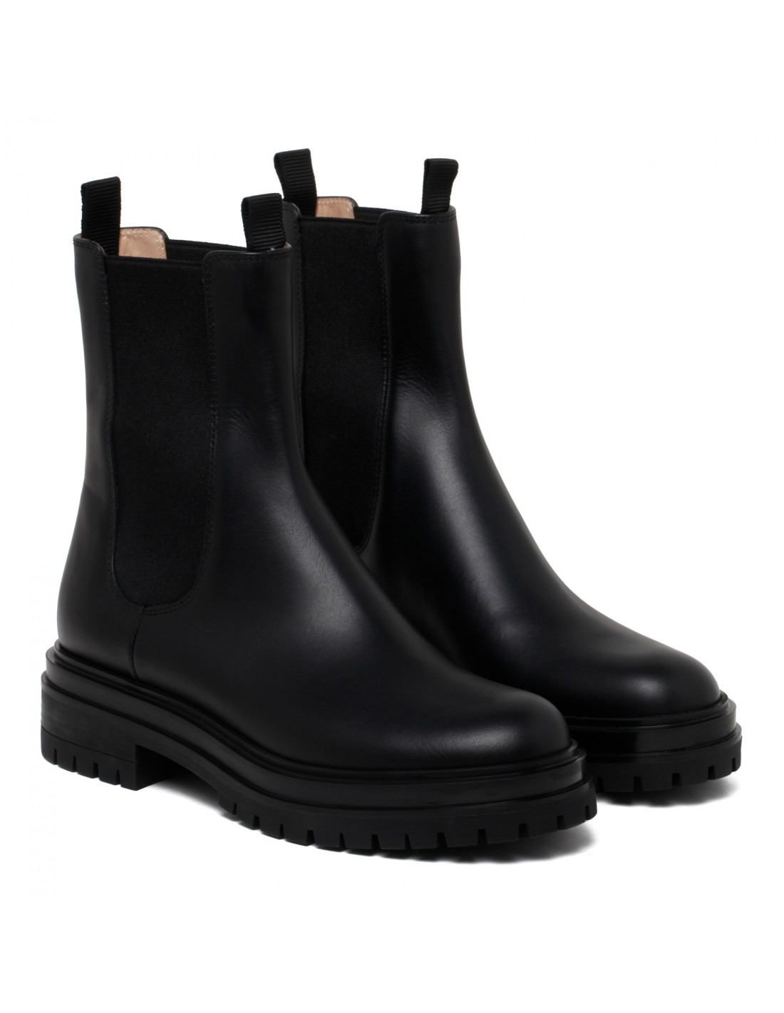 Black leather Chester Chelsea boots from Gianvito Rossi featuring elastic side panels, double loop, rounded toe, leather lining and black rubber lug sole.