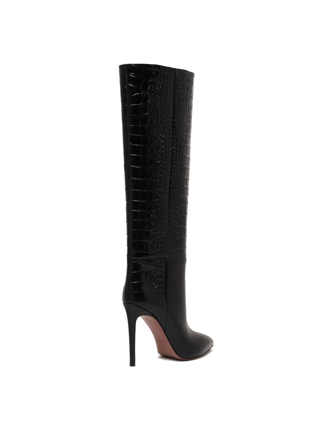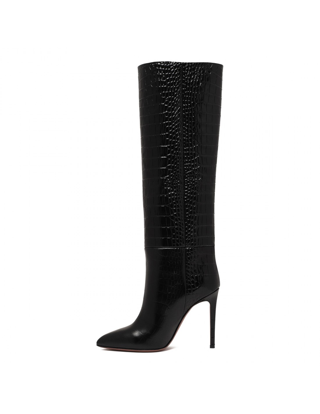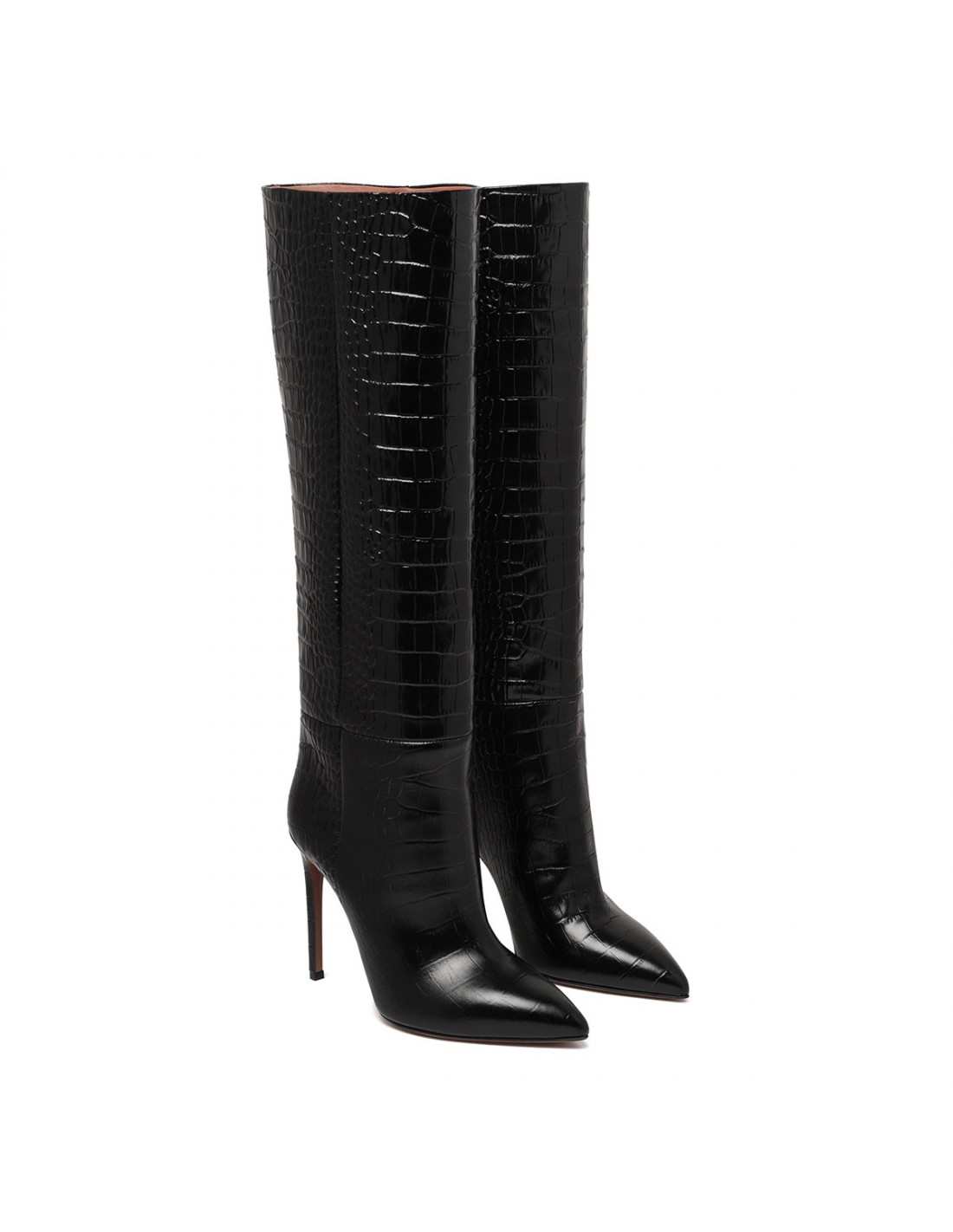 Charcoal hue croc-embossed leather stiletto boots from Paris Texas featuring barrel shaft, pointed toe, 105 stiletto heel, leather insole and sole.