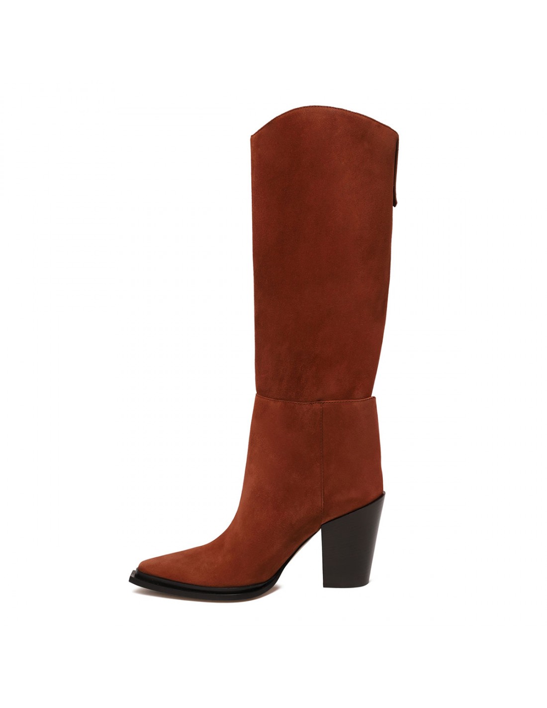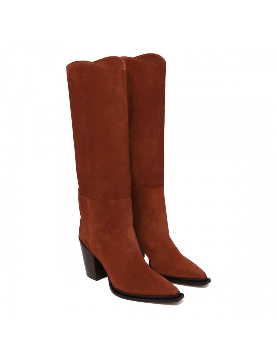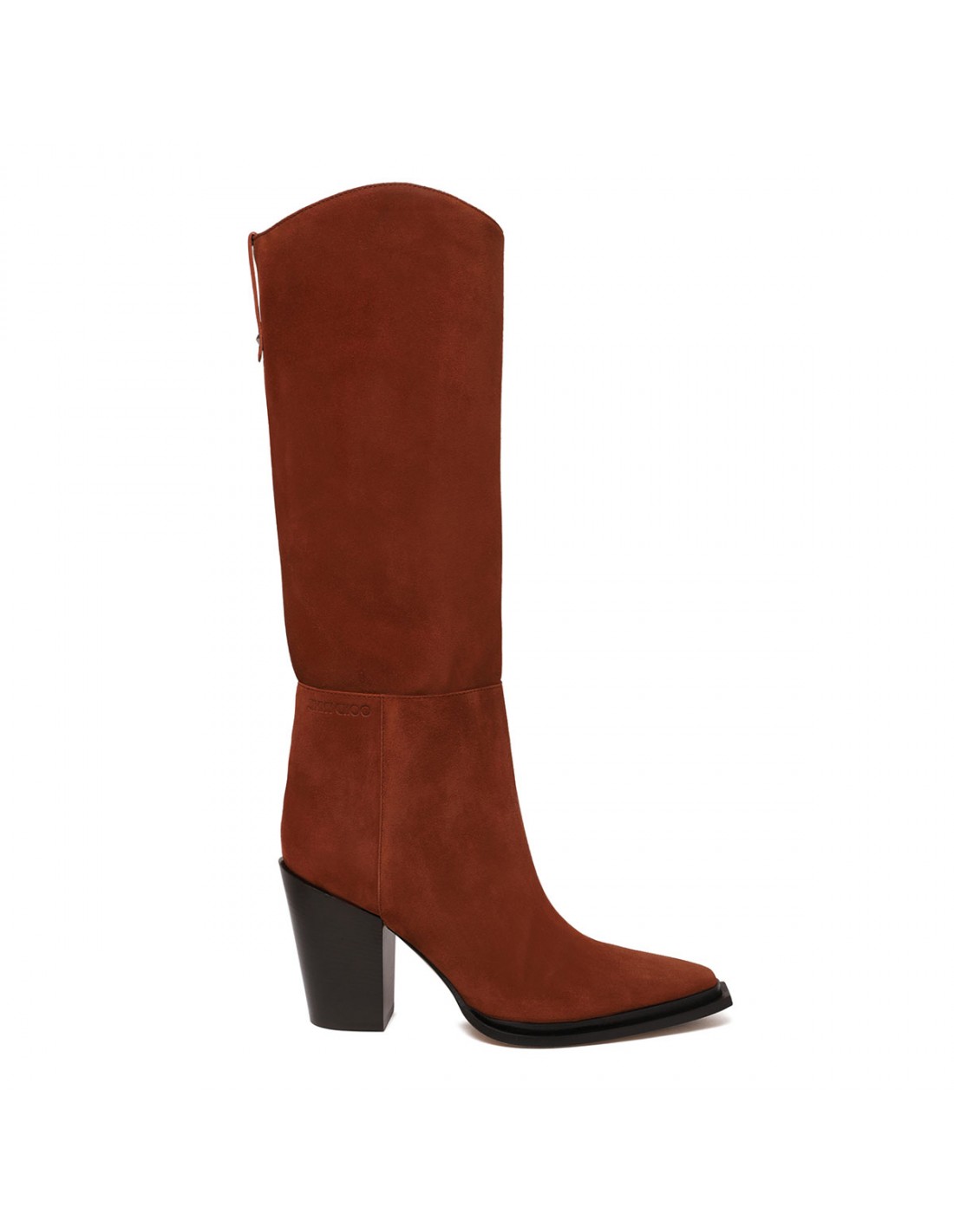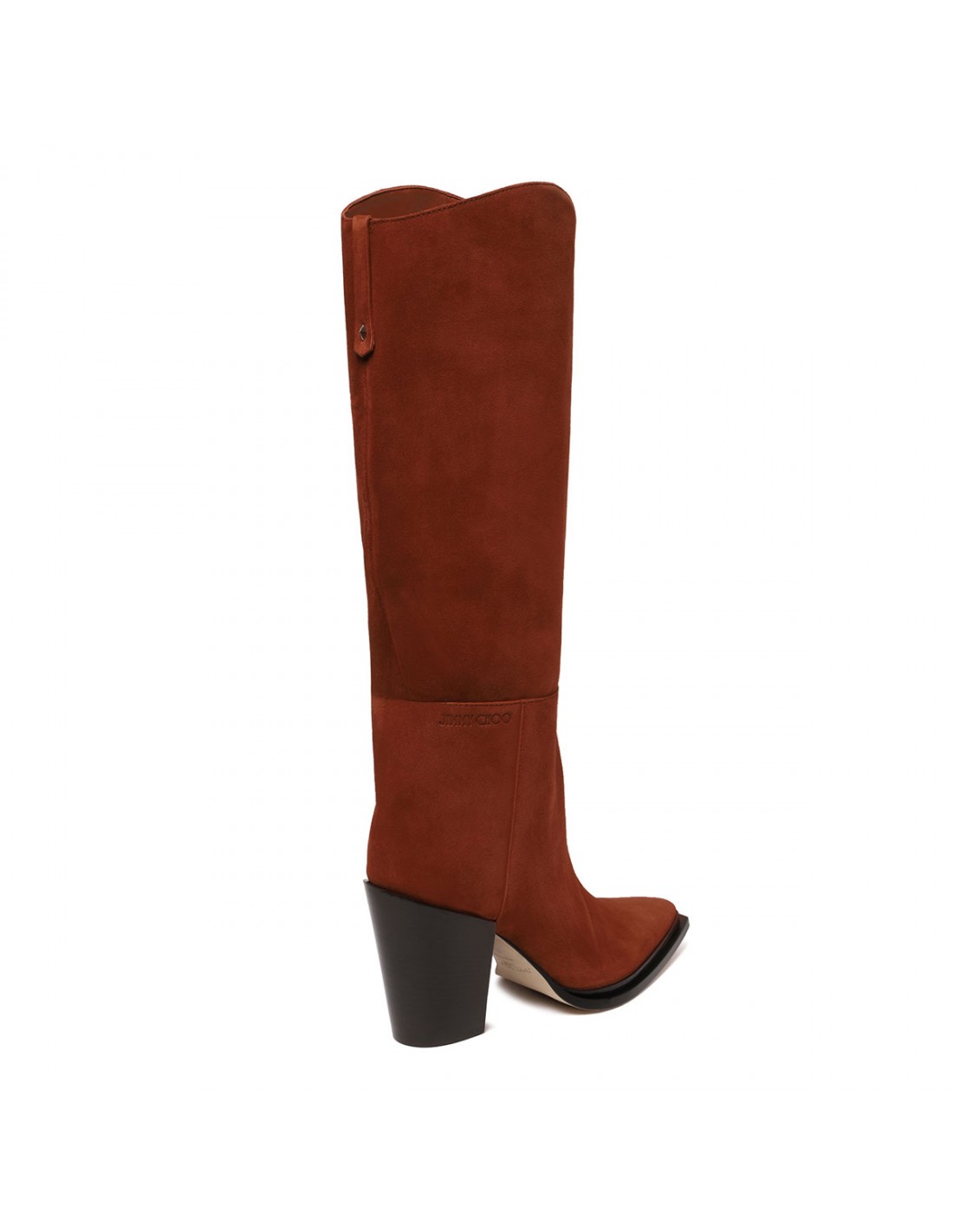 Cognac hue suede leather Cece boots from Jimmy Choo featuring equestrian-inspired silhouette, pointed toe, 80 block heel, back loop, leather insole and sole.
