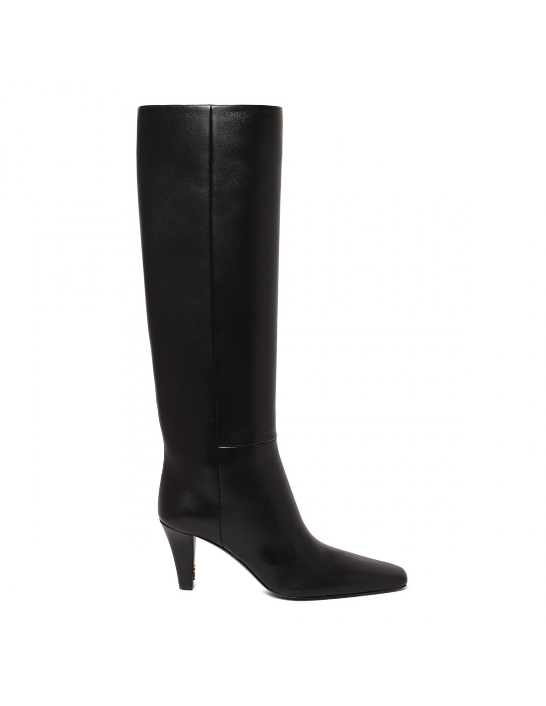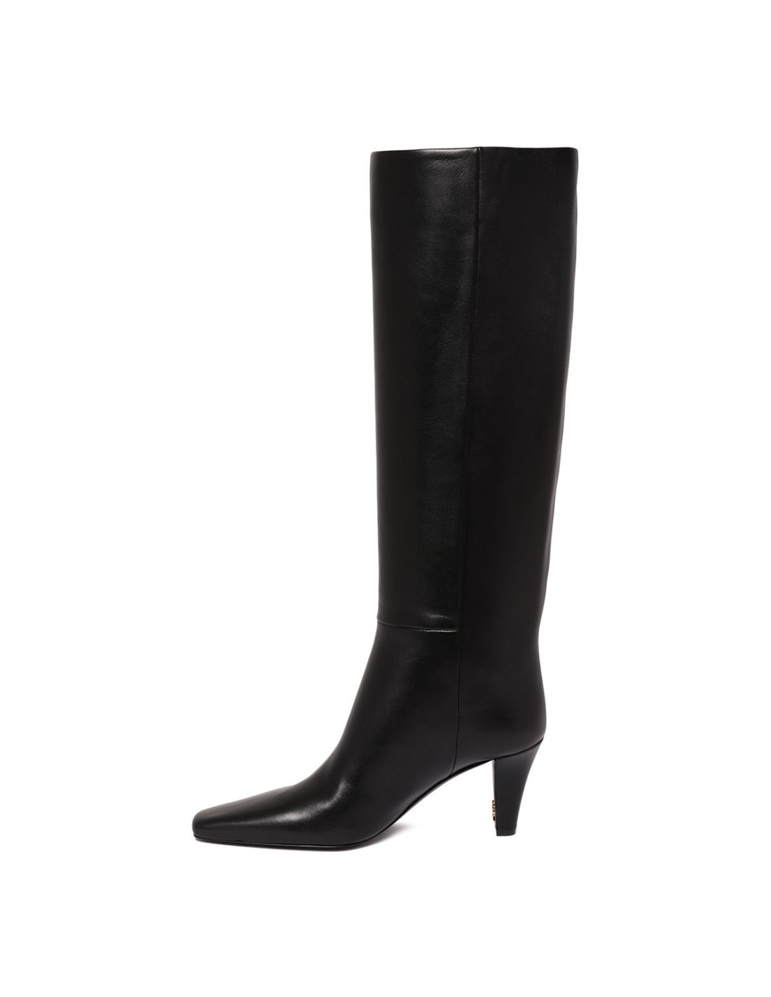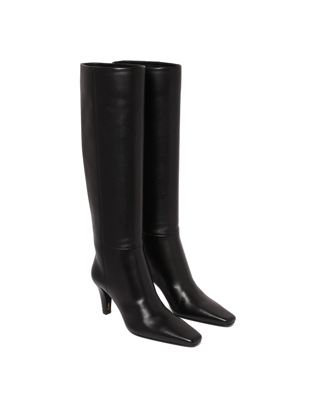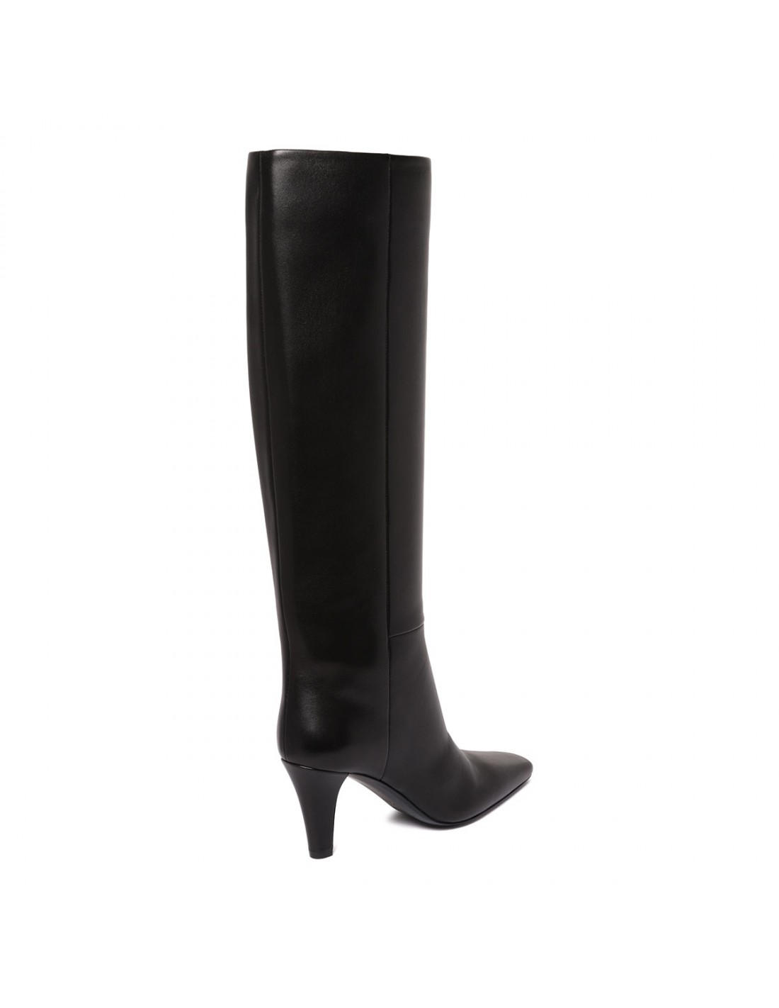 Black smooth leather Jill boots from Saint Laurent featuring pointed toe, tapered 75 block heel with internal Cassandre decoration, leather insole and sole.
