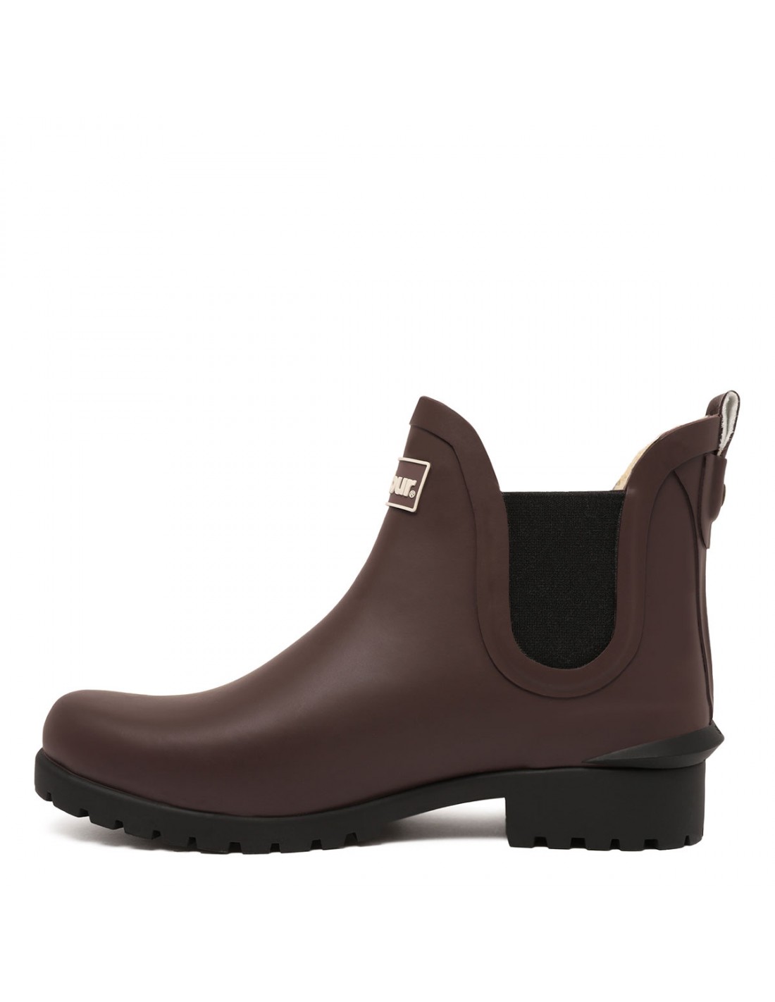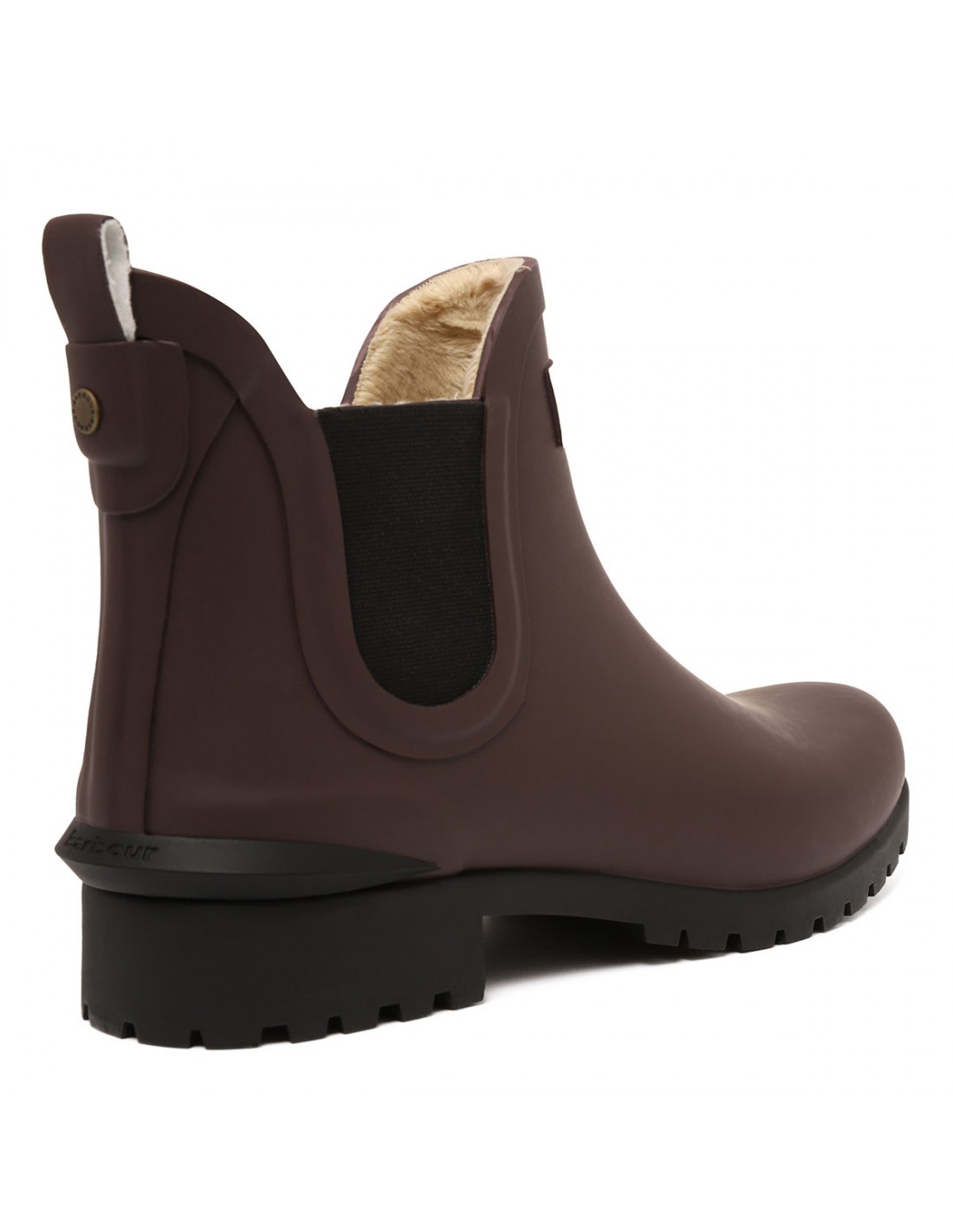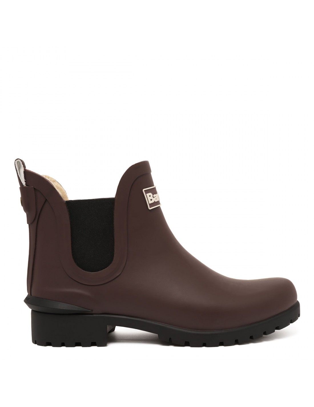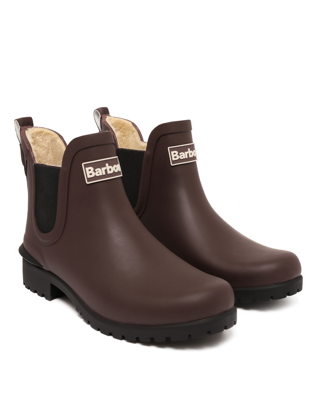 Dark chocolate hue rubber Kirkton Wellington booties from Barbour featuring Chelsea silhouette, Barbour logo on front, elastic side gussets, pull tab, round toe, warm lining, rubber sole.