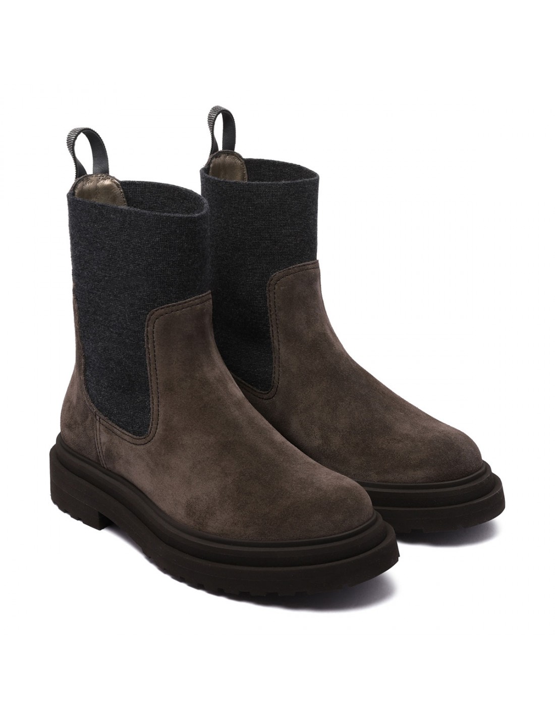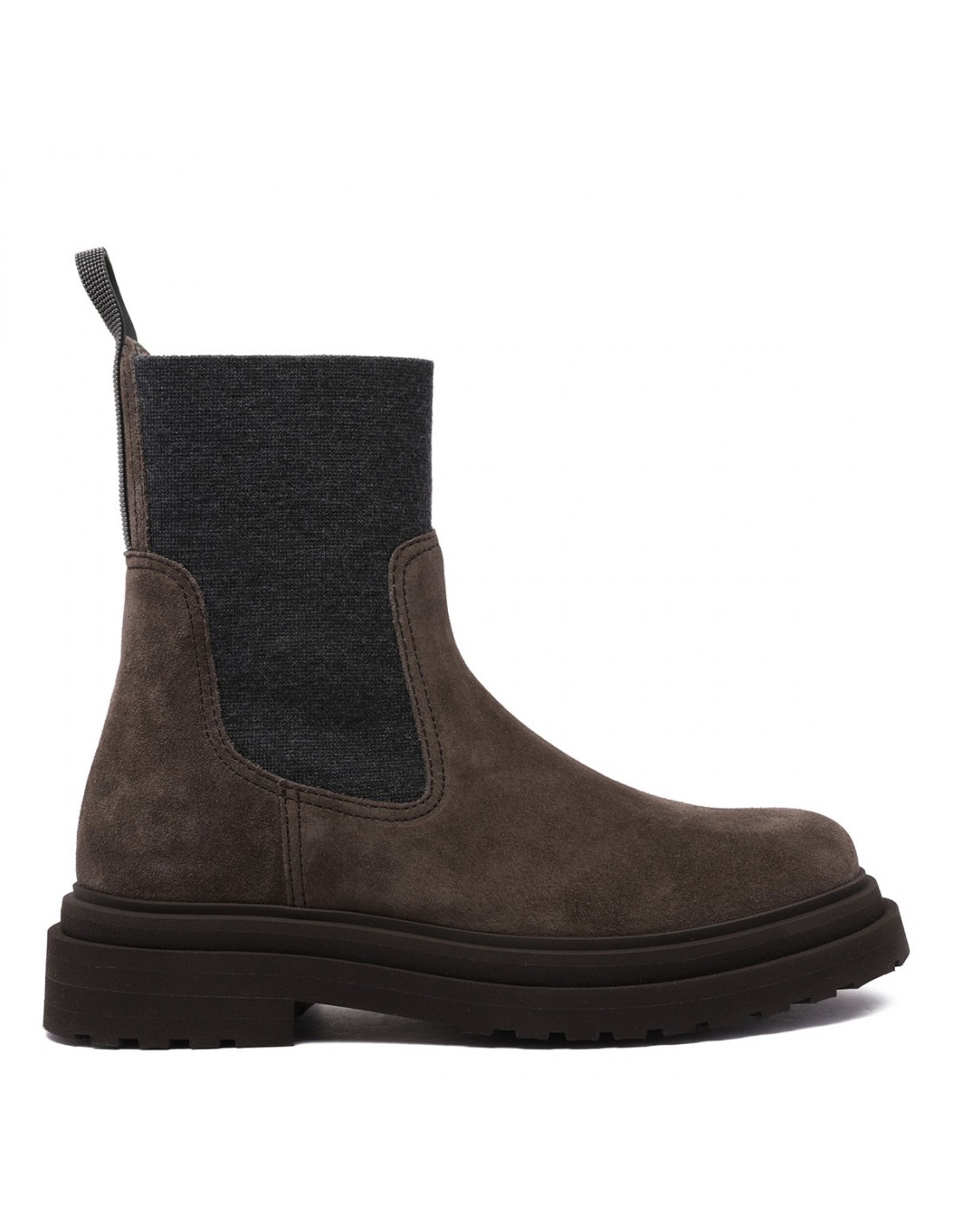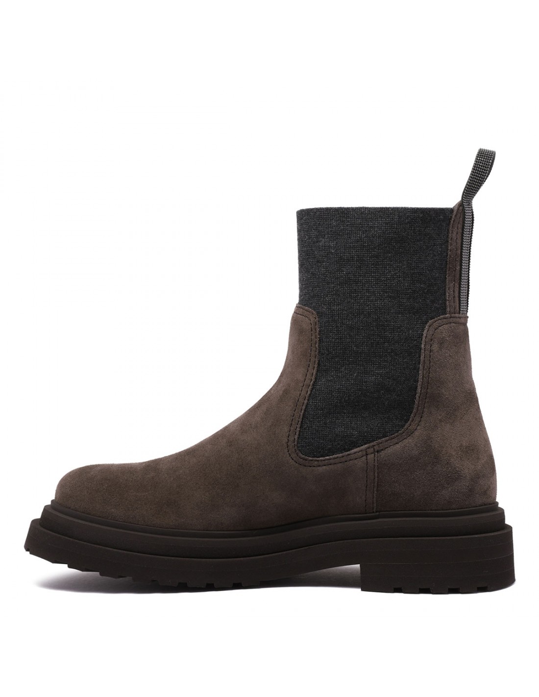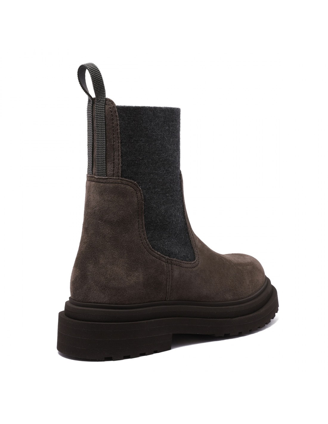 Dark brown suede booties from Brunello Cucinelli featuring elasticated knit insert, Chelsea-inspired silhouette, double loop on back with shiny monili embroidery, round toe, leather lining, lightweight micro rubber sole.