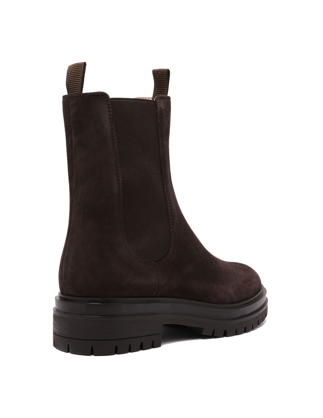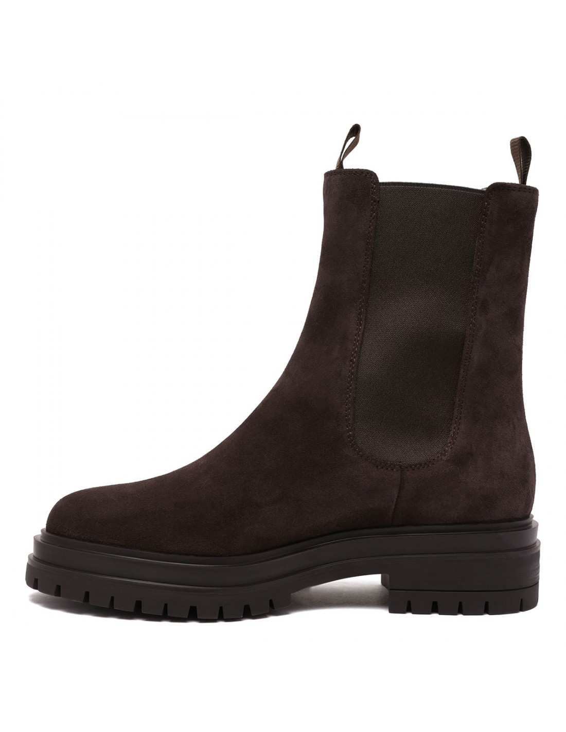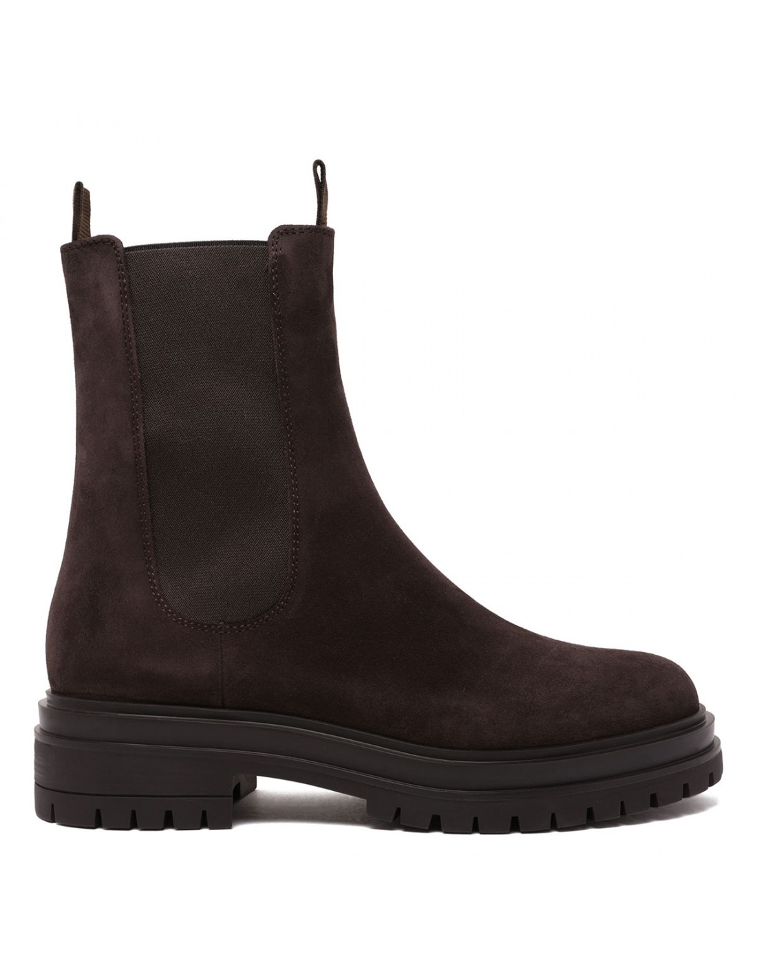 Moka hue suede leather Chester Chelsea boots from Gianvito Rossi featuring elastic side panels, double loop, rounded toe, leather lining and rubber lug sole.