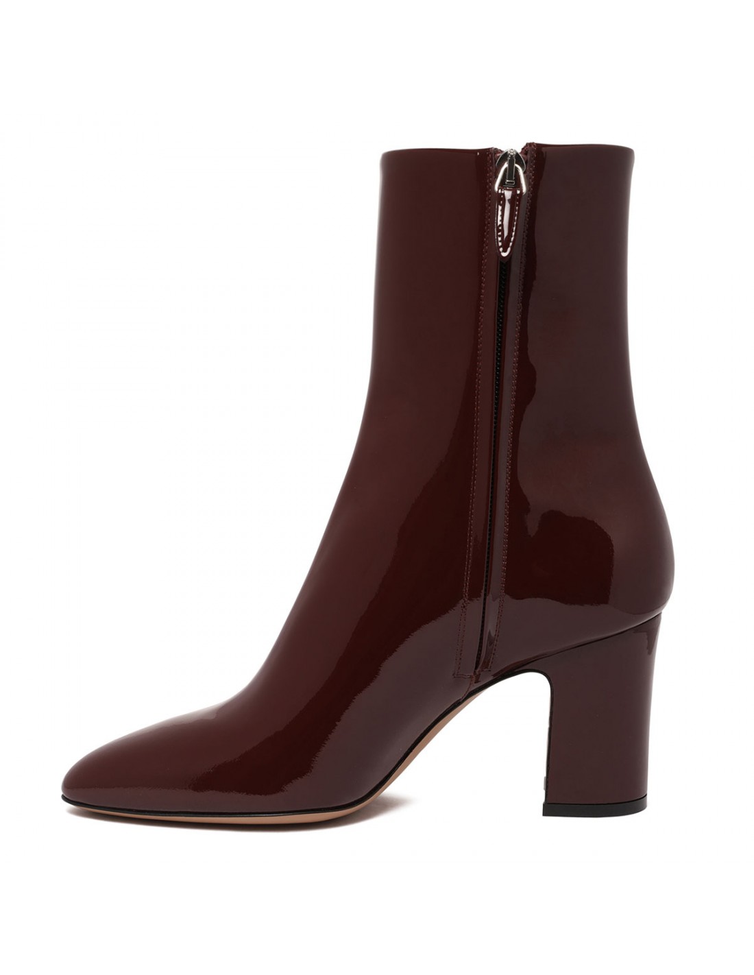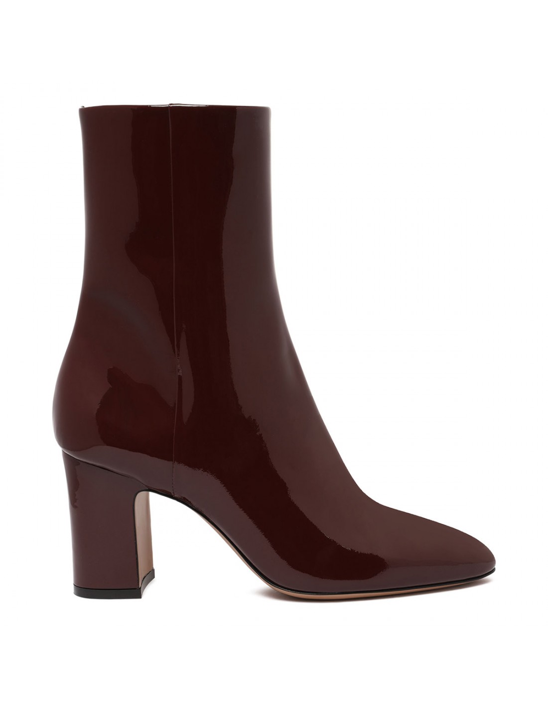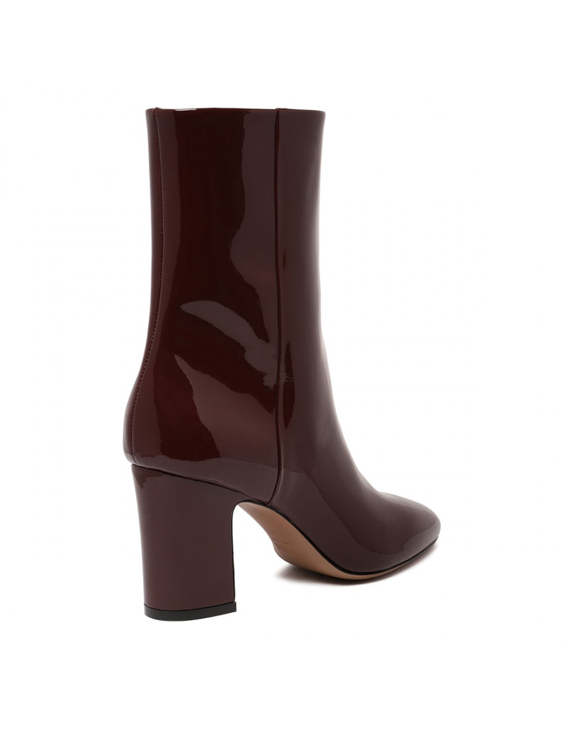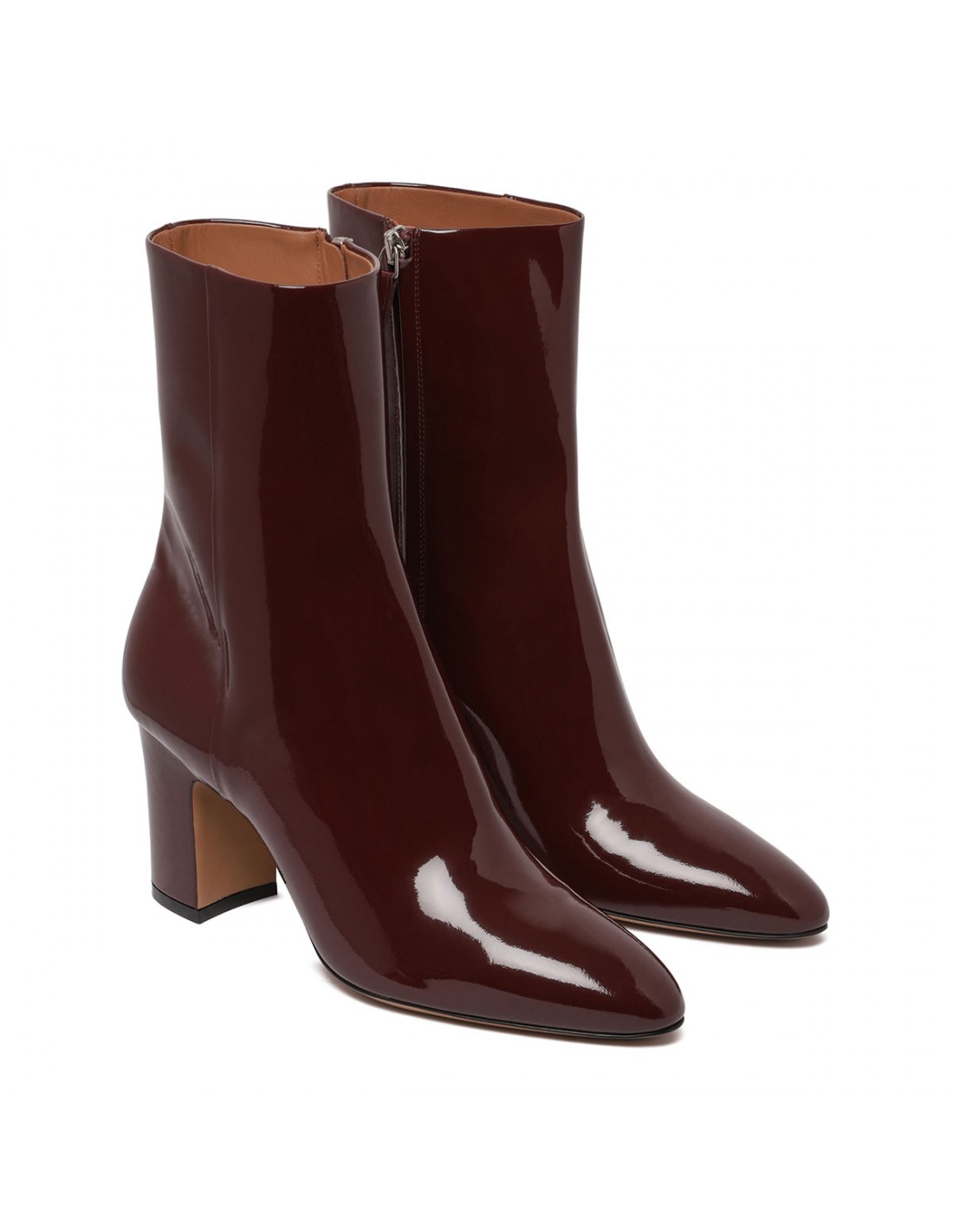 Dark red patent leather Lavinia ankle boots from Paris Texas featuring slightly pointed toe, zip fastening along inner side, 75 block heel, leather insole and sole.