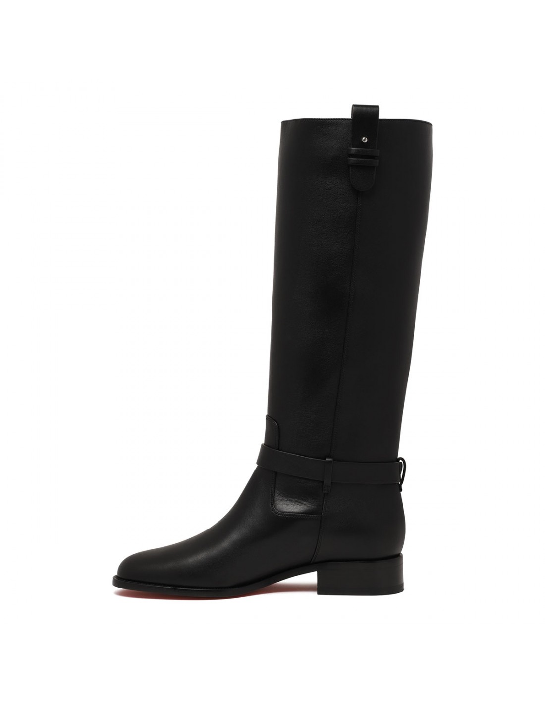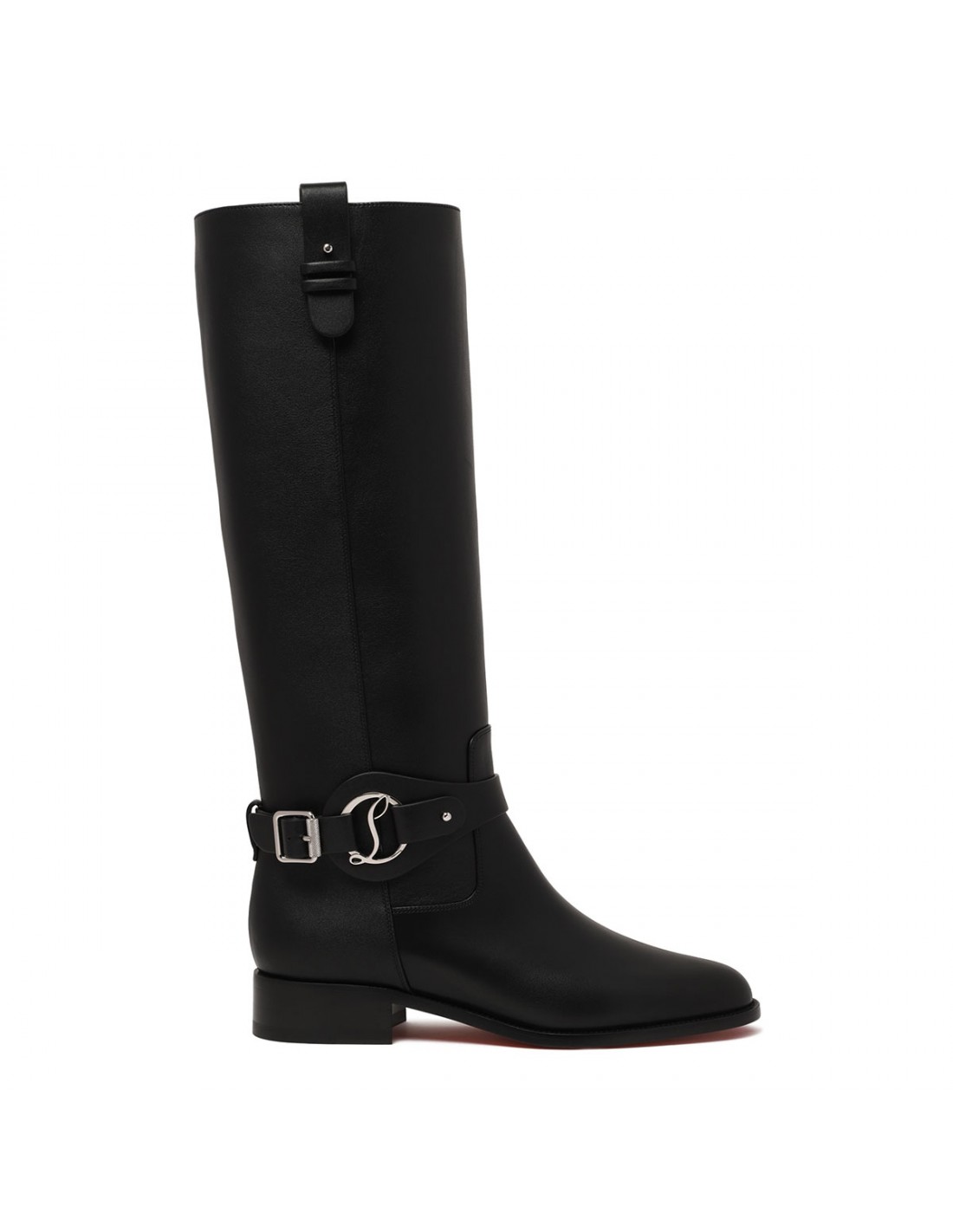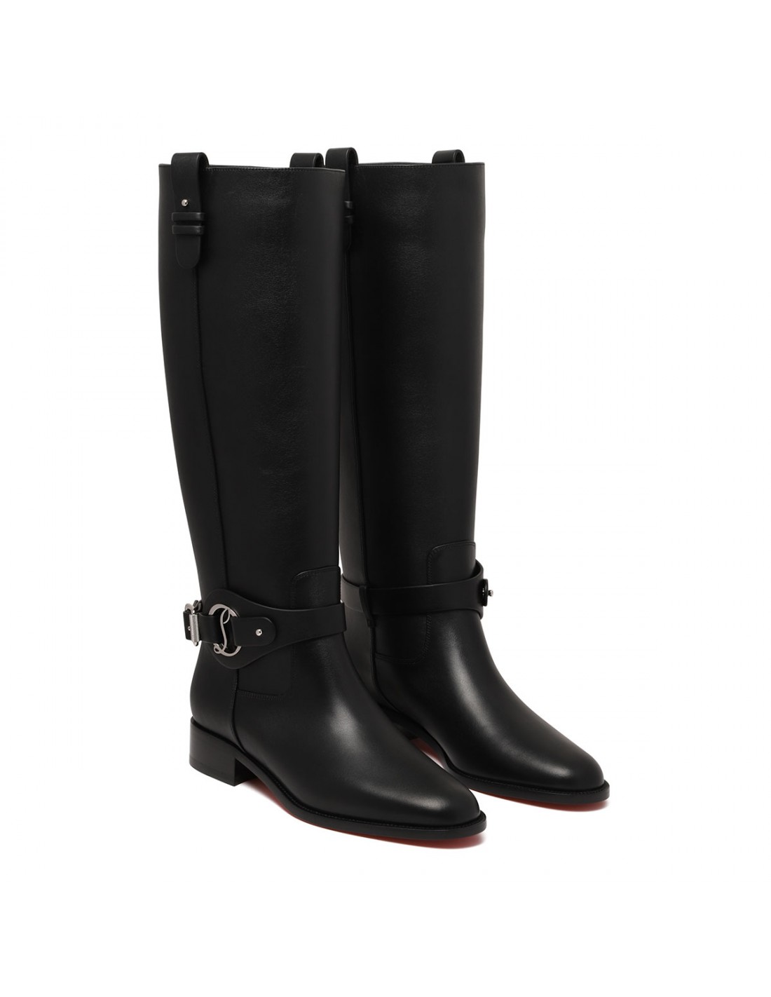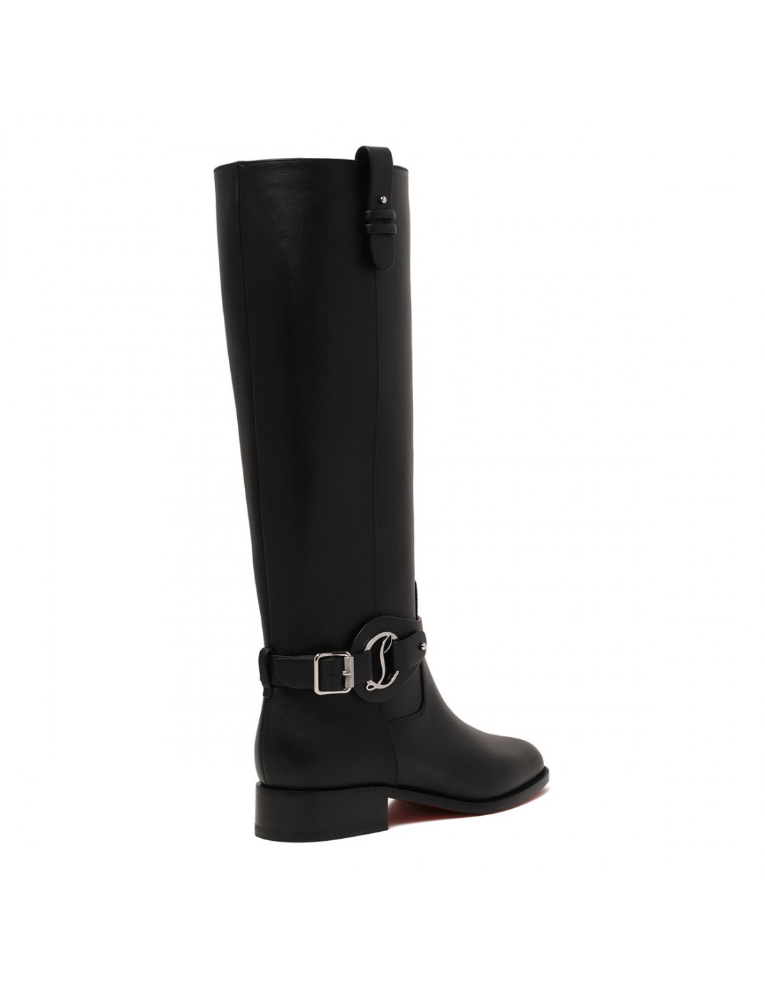 Black calf leather Dianouchette Botta boots from Christian Louboutin featuring tubular silhouette, two leather straps around the ankle, iconic silver CL Mooncrest logo, pin and buckle, leather side tab with silver pin at top, leather insole, red leather outsole.