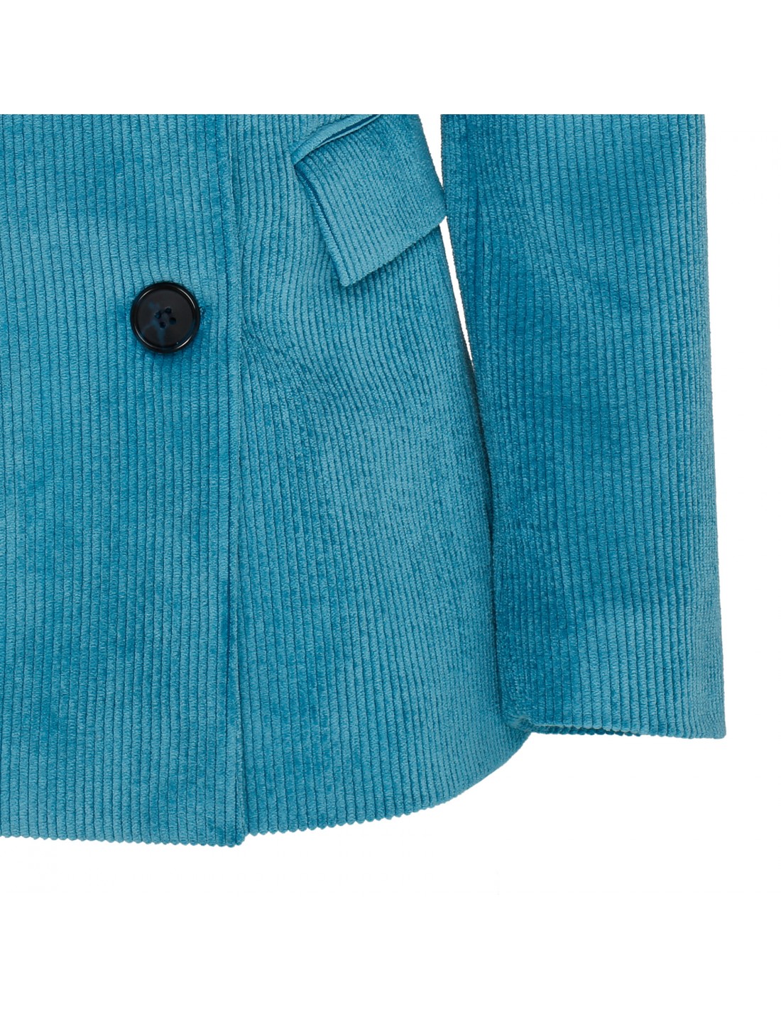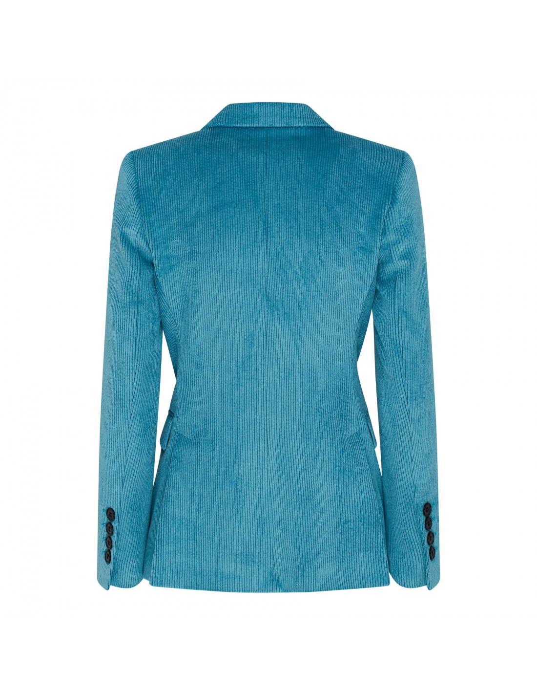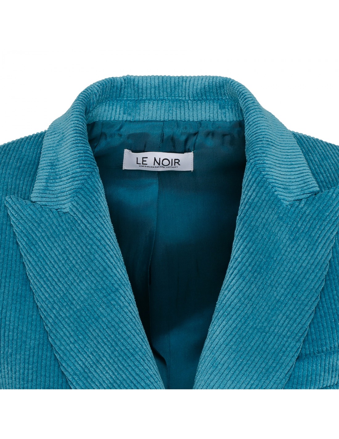 Peacock-blue corduroy blazer from Le Noir featuring double breasted silhouette, button closure, chest pocket, classic lapel, side flap pockets, buttoned cuffs, back vent.