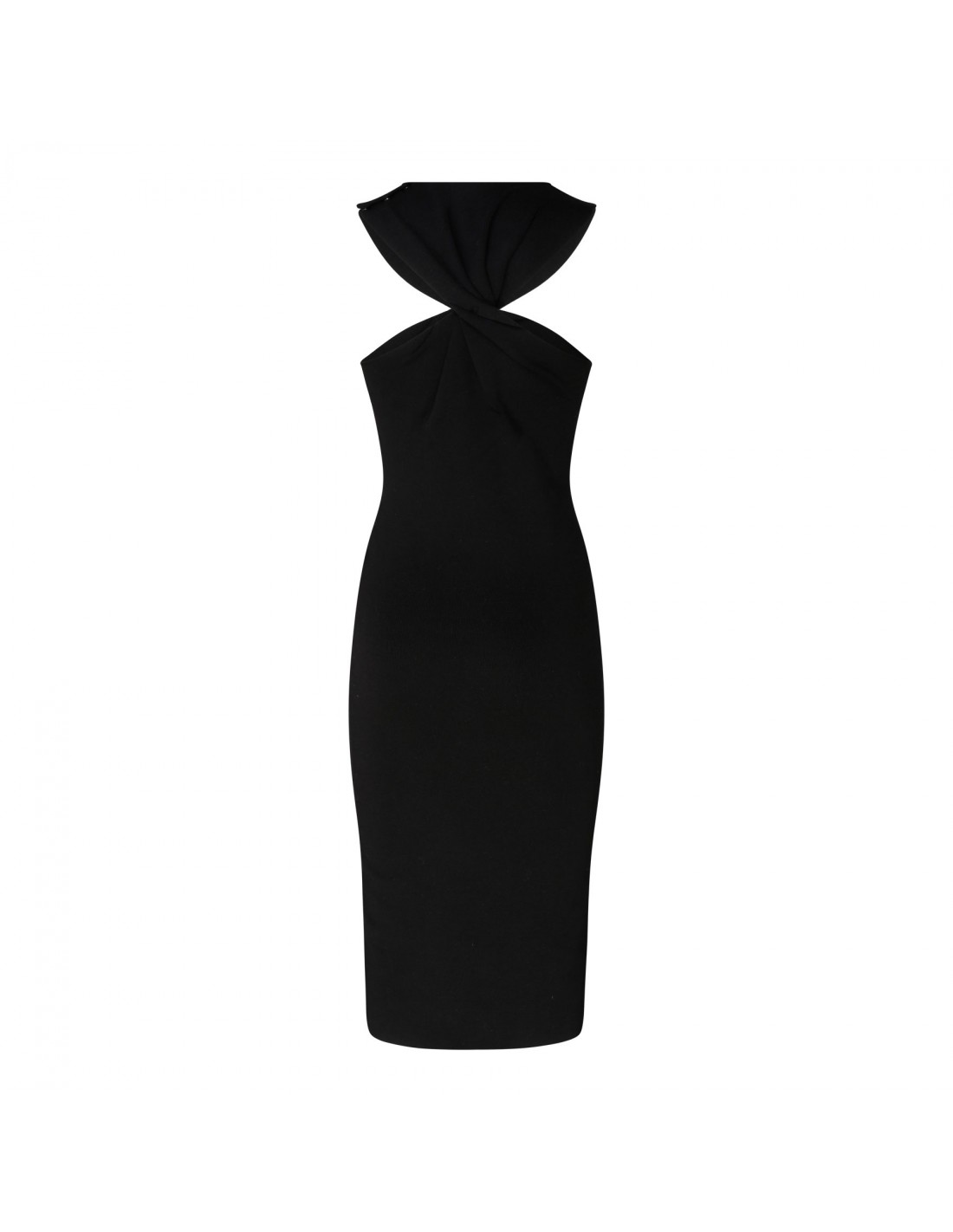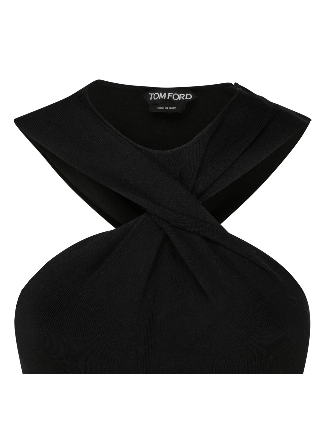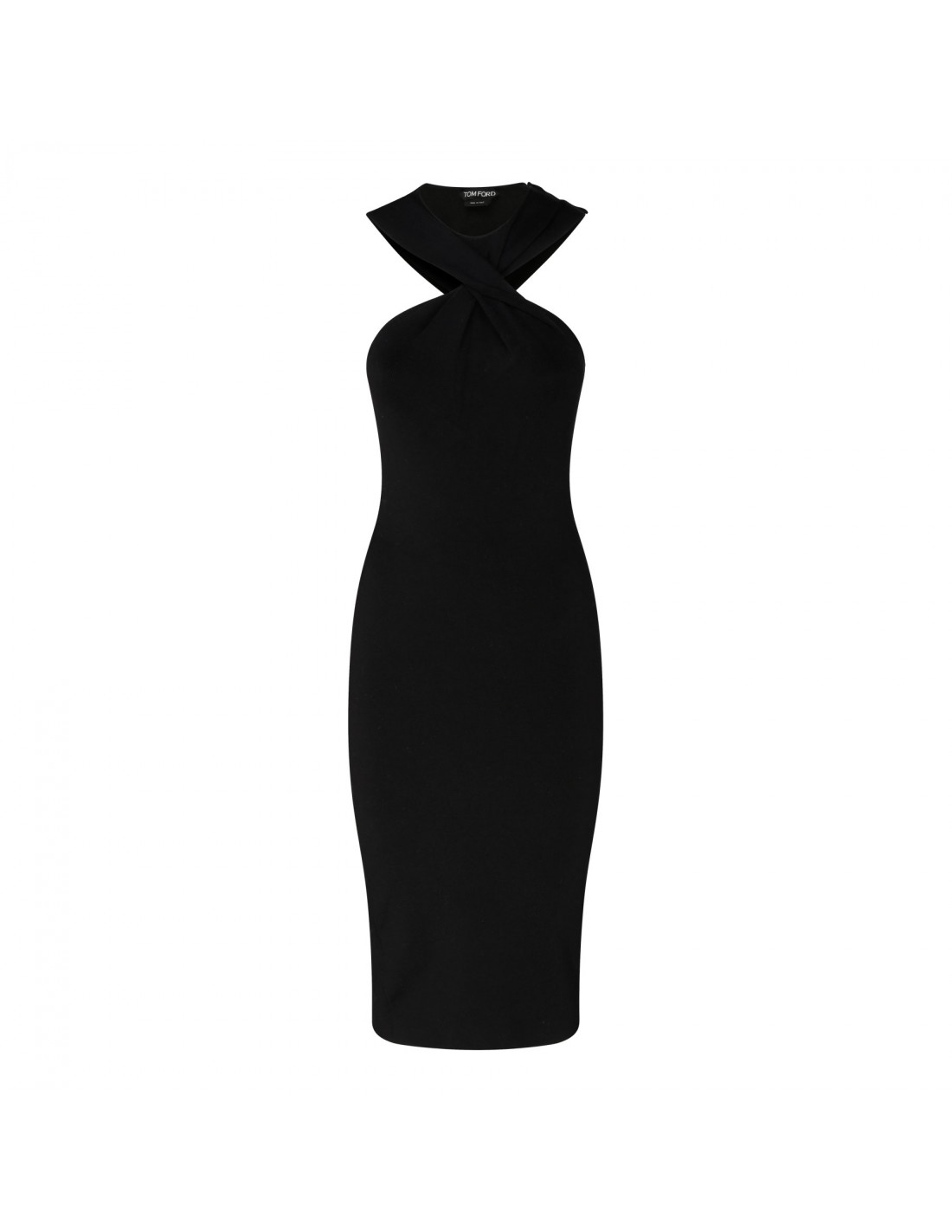 Black knit wool and silk blend dress from Tom Ford featuring halterneck, sleeveless style, fitted silhouette, knee-length and straight hem.