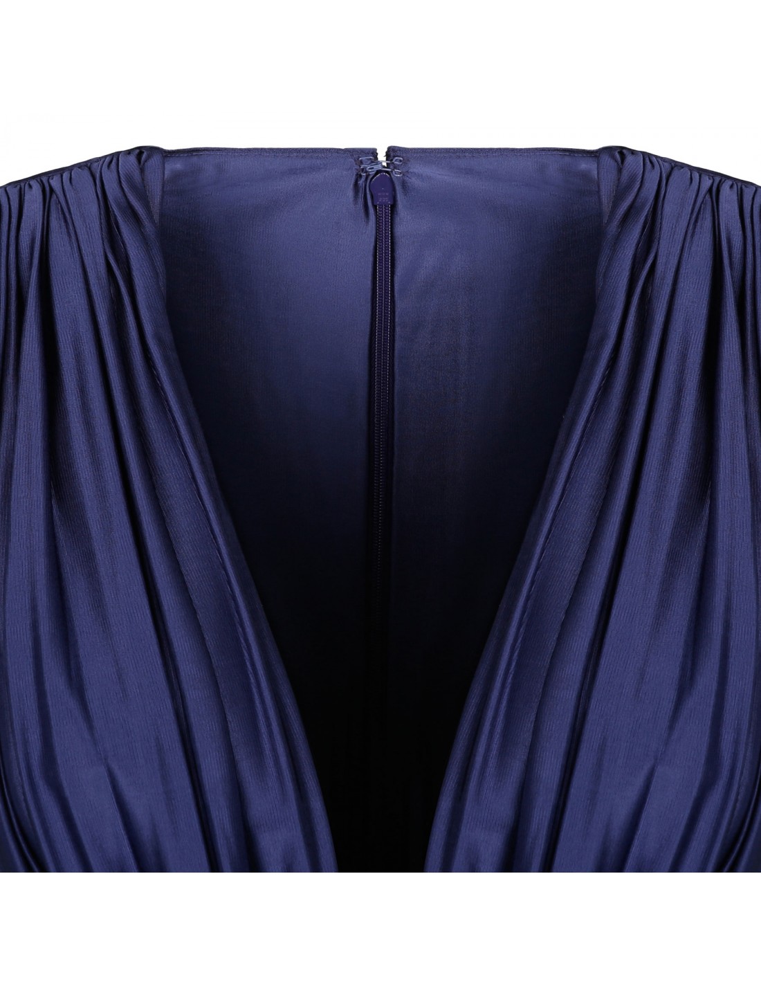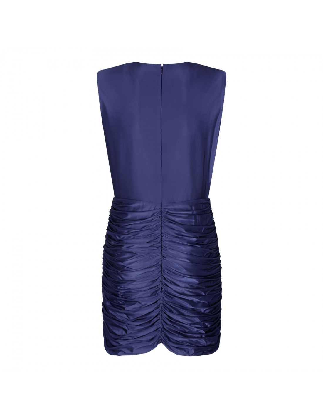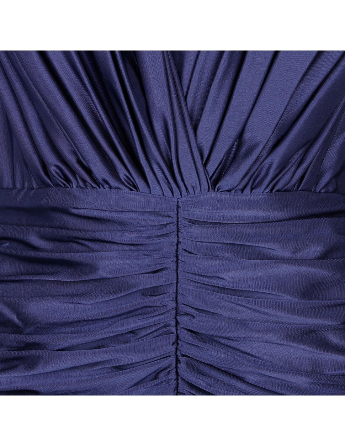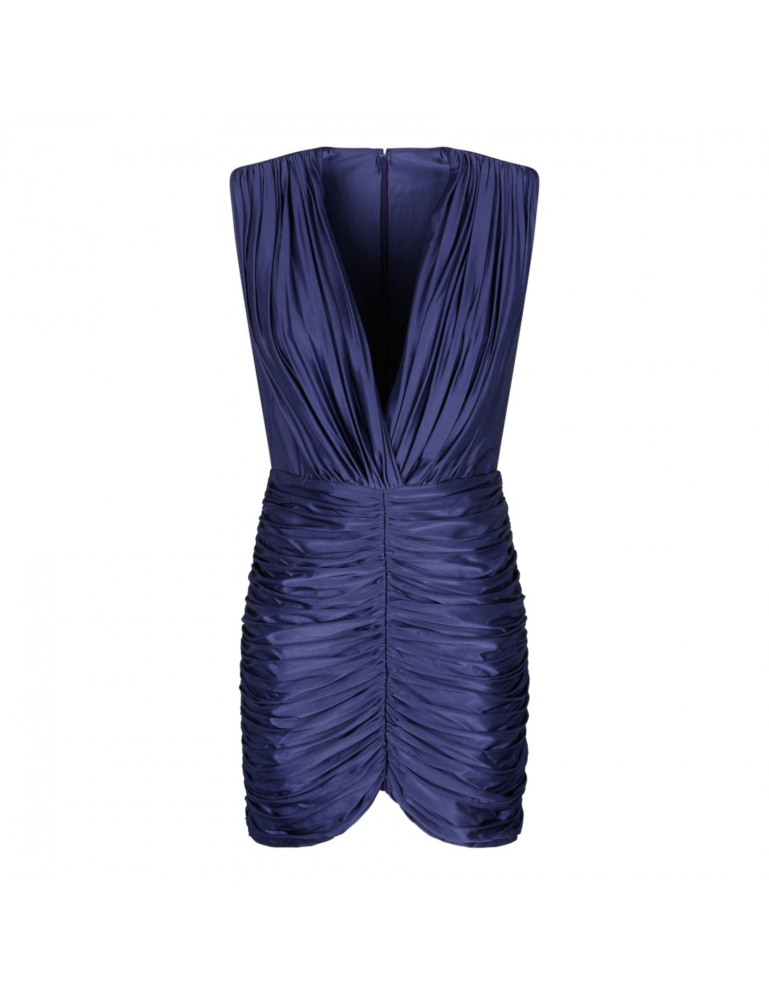Violet gathered plissé jersey Regina mini dress from Costarellos featuring plunging V neckline, draped skirt with ruffled detailing on front, sleeveless design and zip fastening along back.