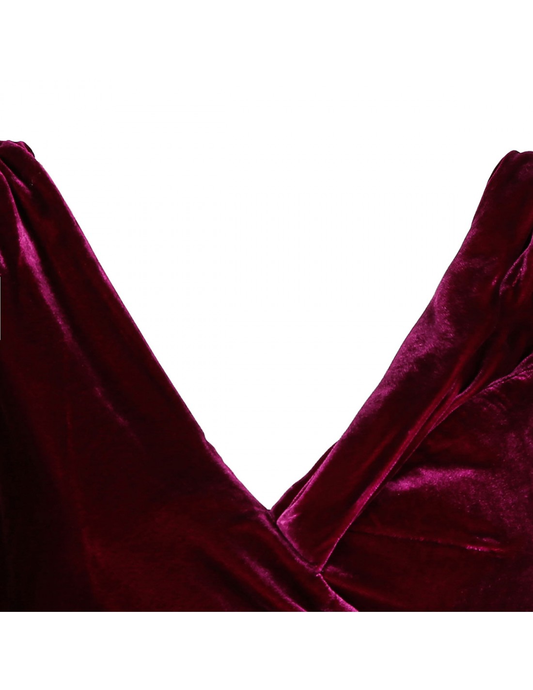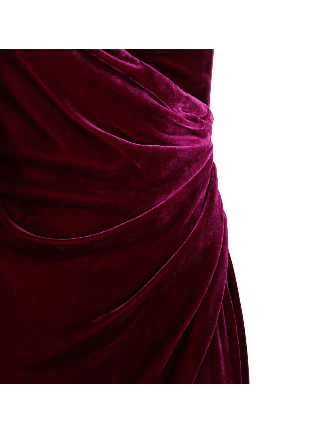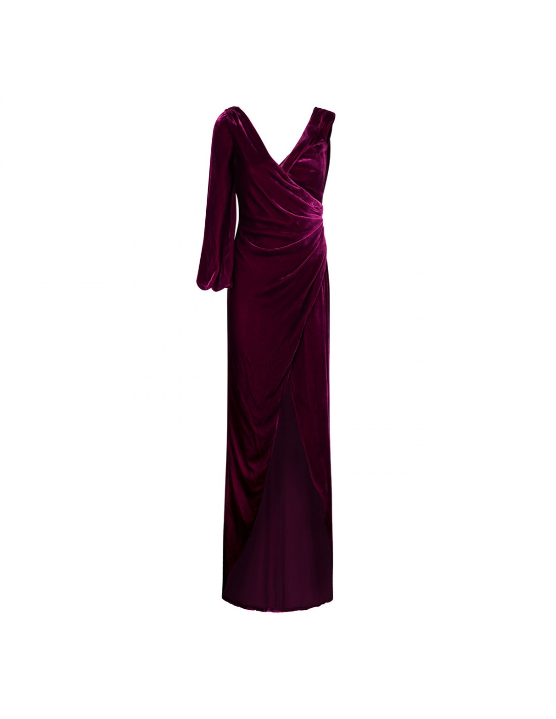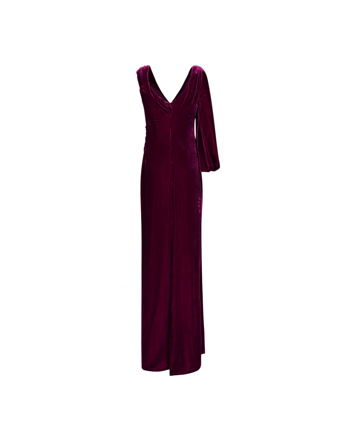 Cherry hue silk velvet Rubinia gown from Costarellos featuring draped front with flattering effect, asymmetric neckline, one billowy long sleeves with elastic cuffs, zip fastening along back.