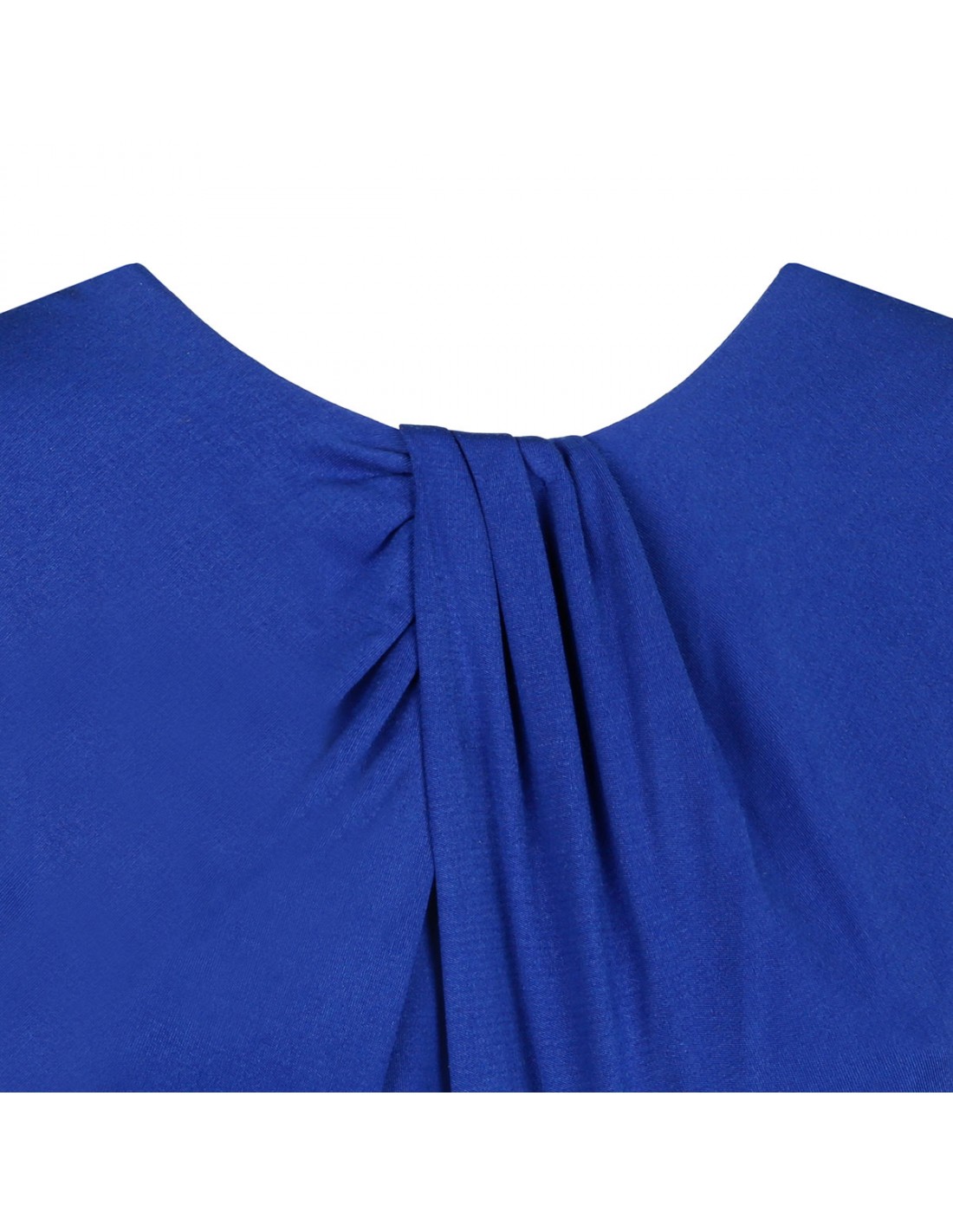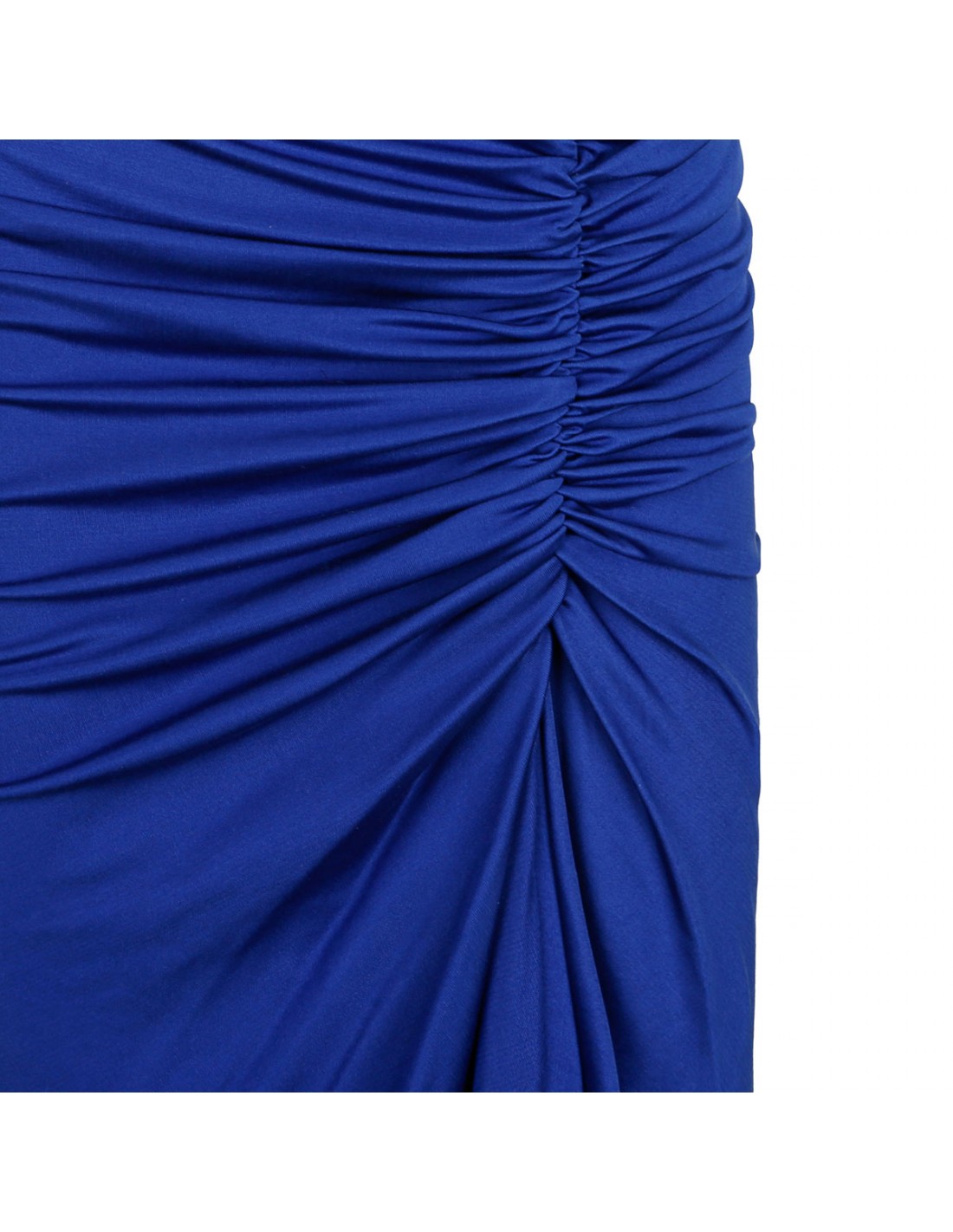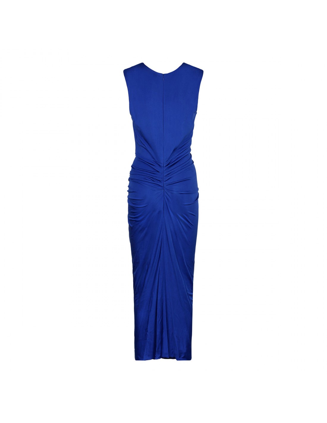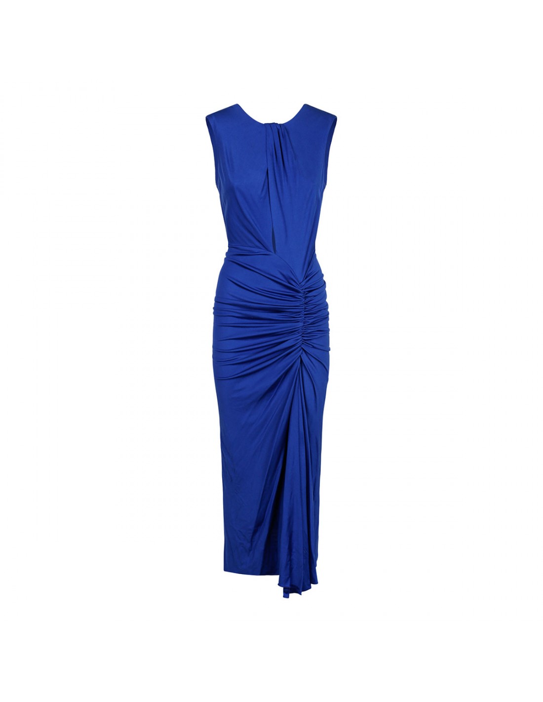 Royal blue silk-blend jersey Triss dress from Costarellos featuring ruching throughout, keyhole detail, crew neckline, side split, sleeveless silhouette and calf-length.
