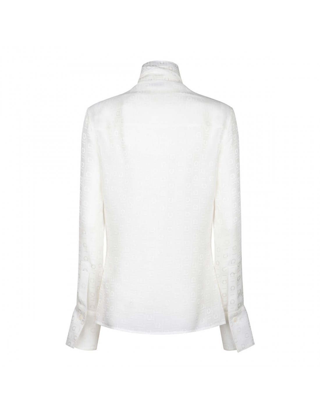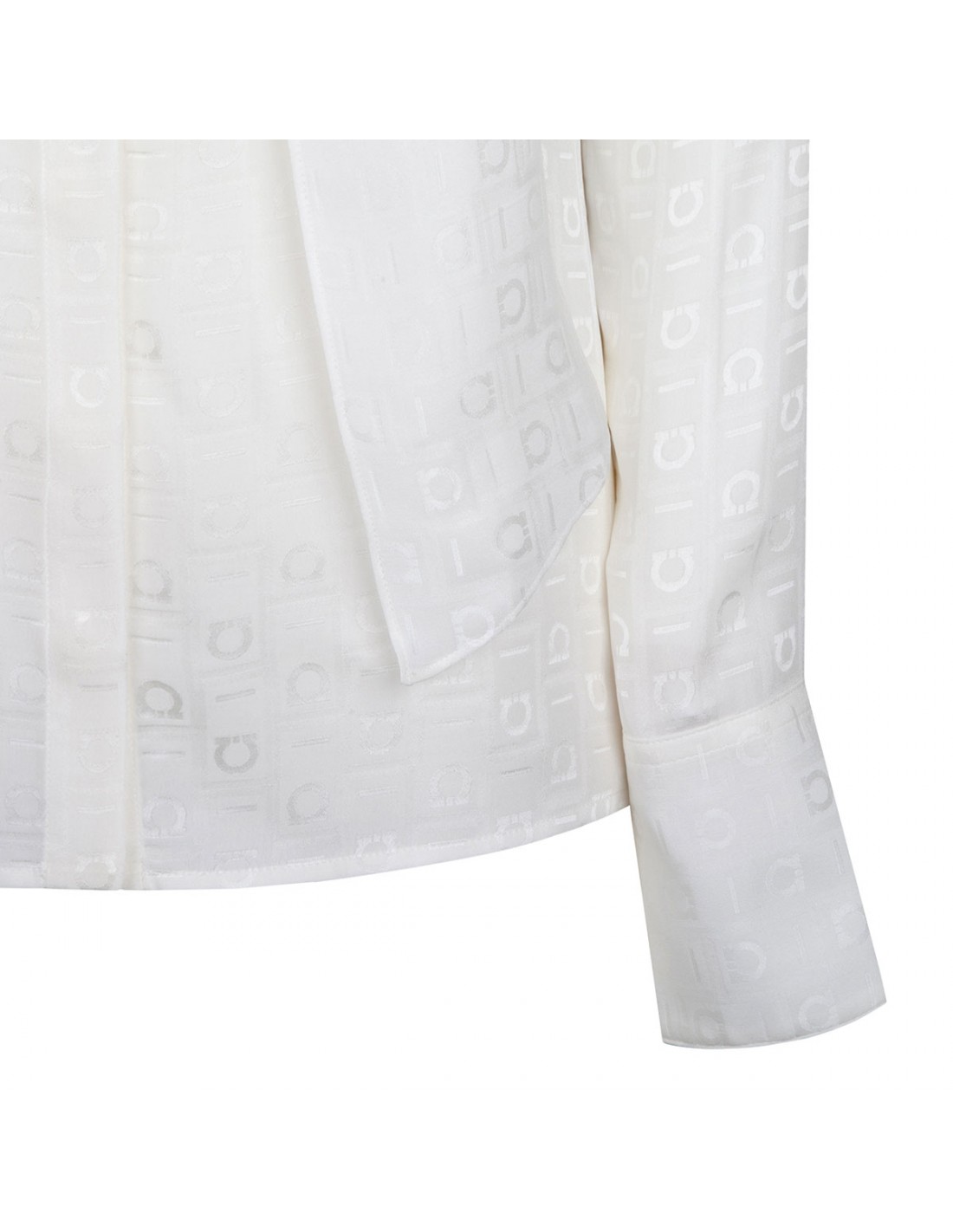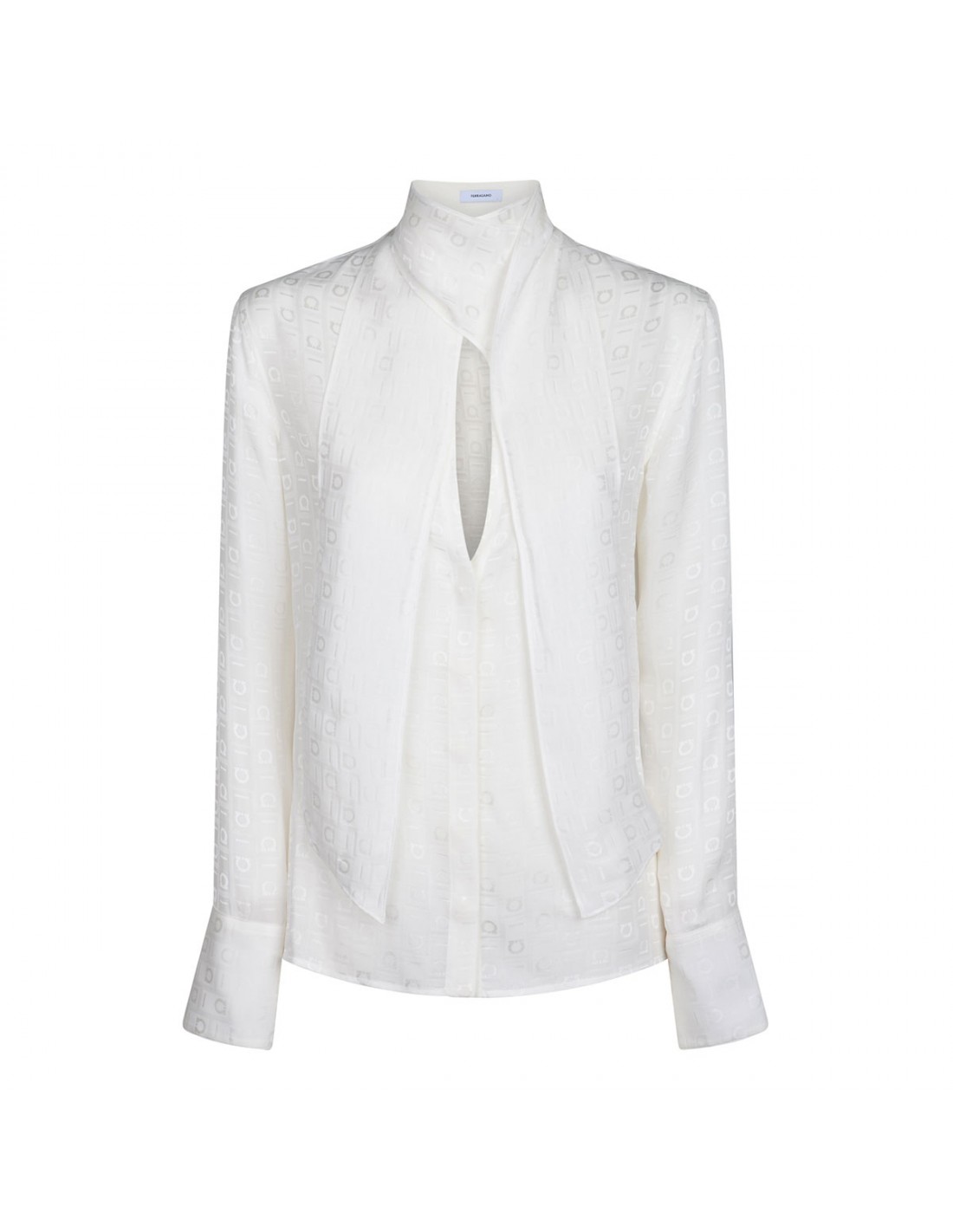 White pure organic silk shirt from Ferragamo featuring tonal Gancini motif, two long sashes that cross over at the neck, button fastening, back yoke, long sleeves with buttoned cuffs.