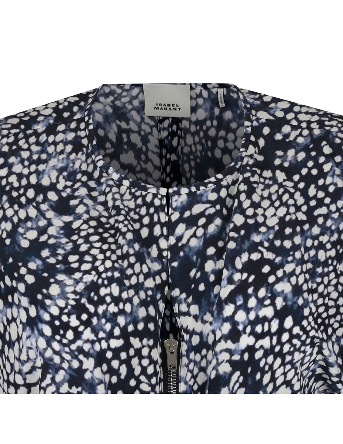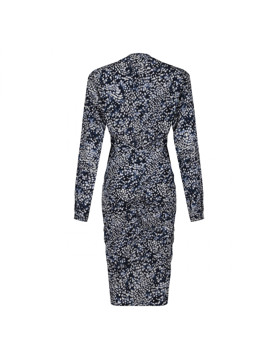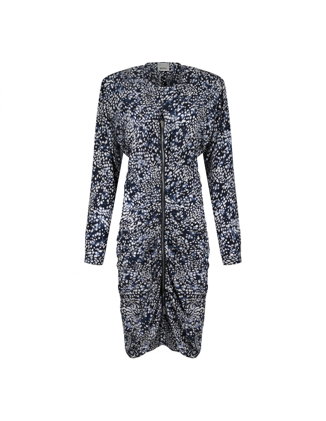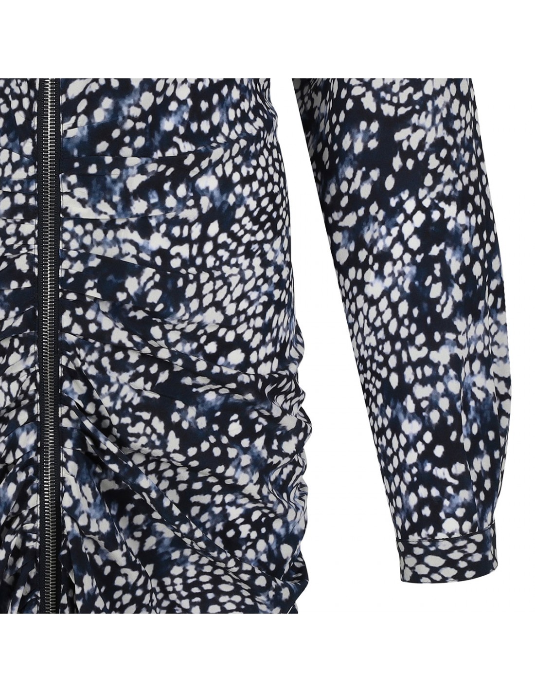 Midnight blue and white silk blend gathered Hermina midi dress from Isabel Marant featuring round neckline with slit, long sleeves with fitted cuffs, draped effect on front, zip along front, asymmetrical hem, fitted at waist.