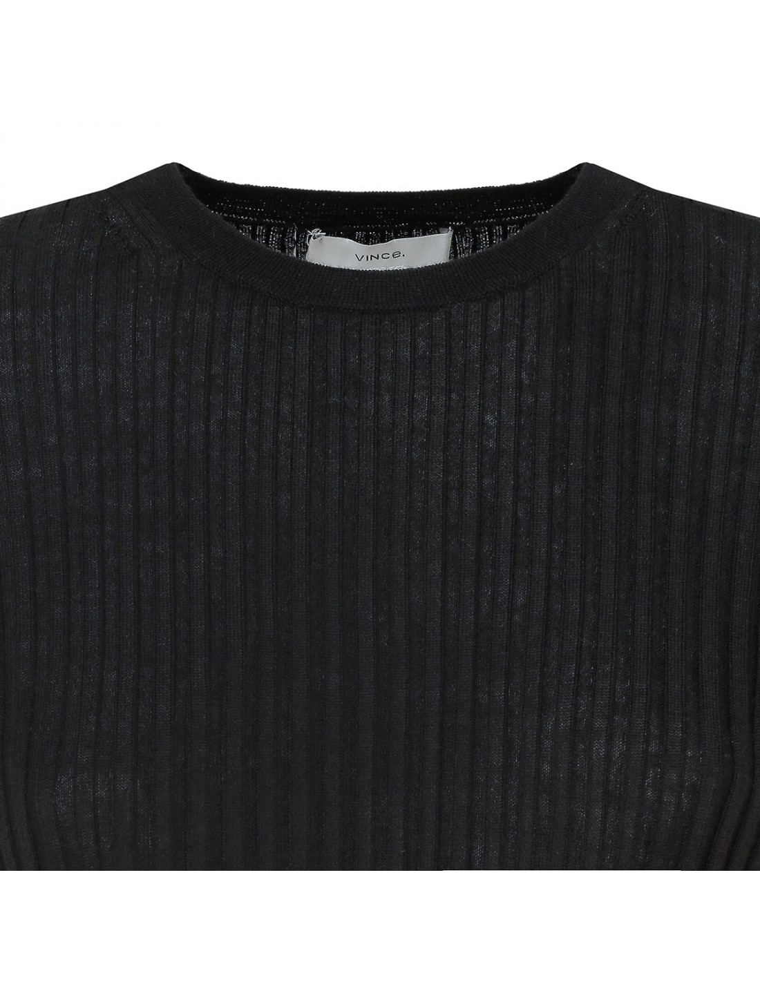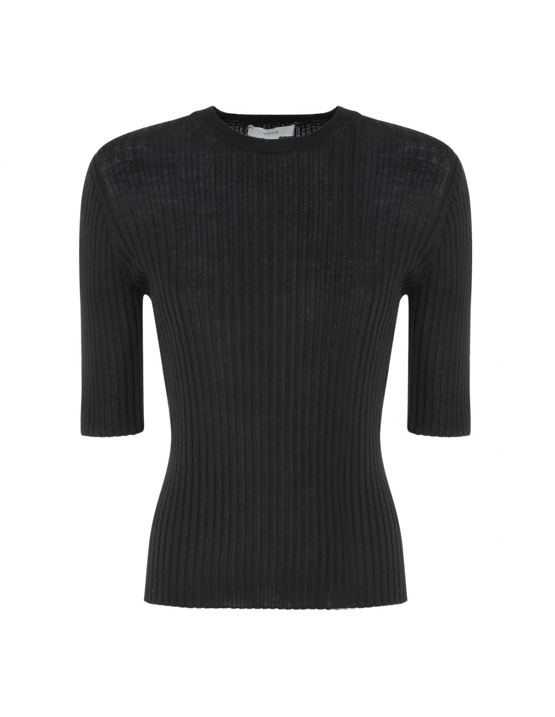 Black ribbed-knit wool and silk blend Snap sweater from Theory featuring crew collar, elbow length sleeves with snap-details, raw-cut hem.