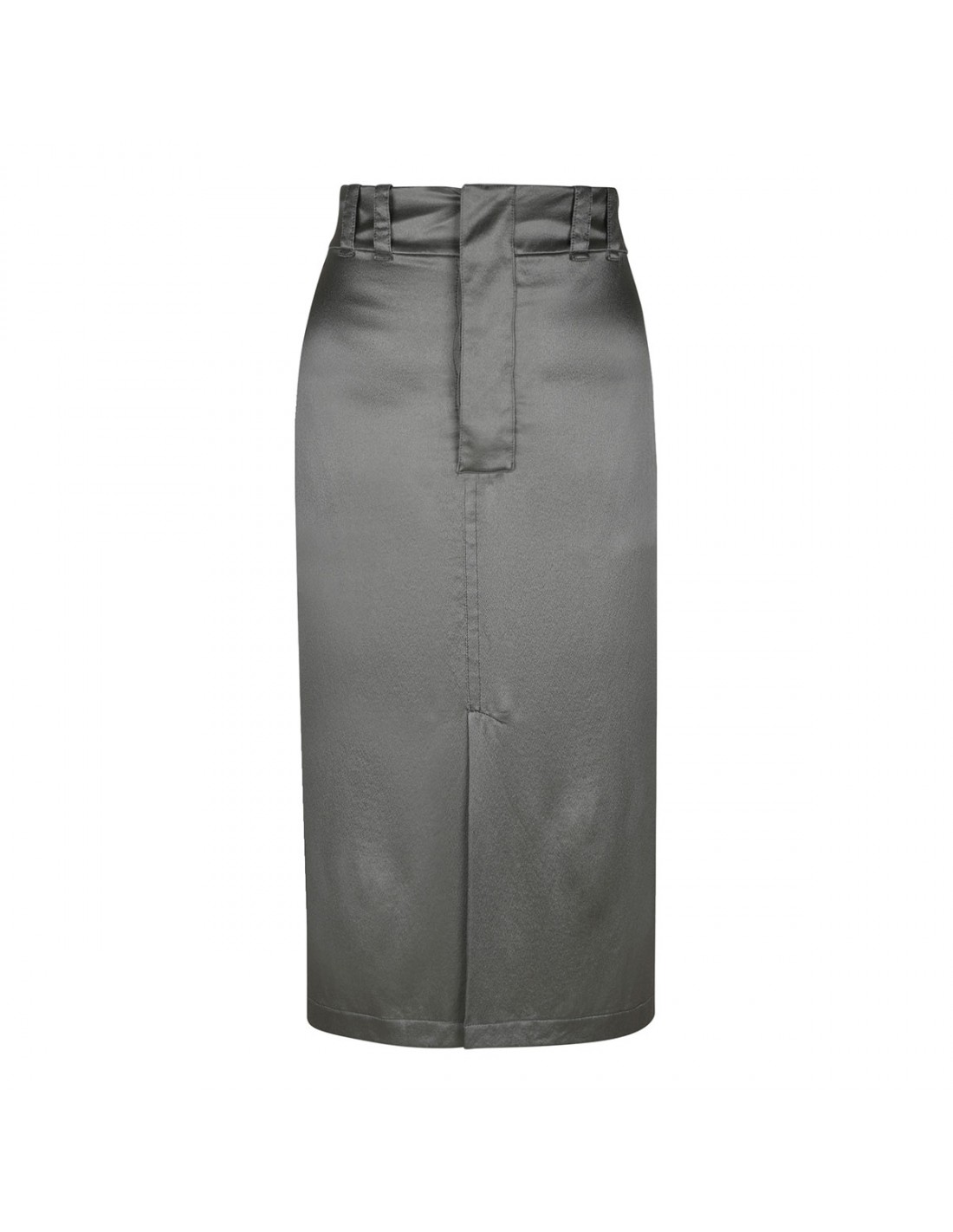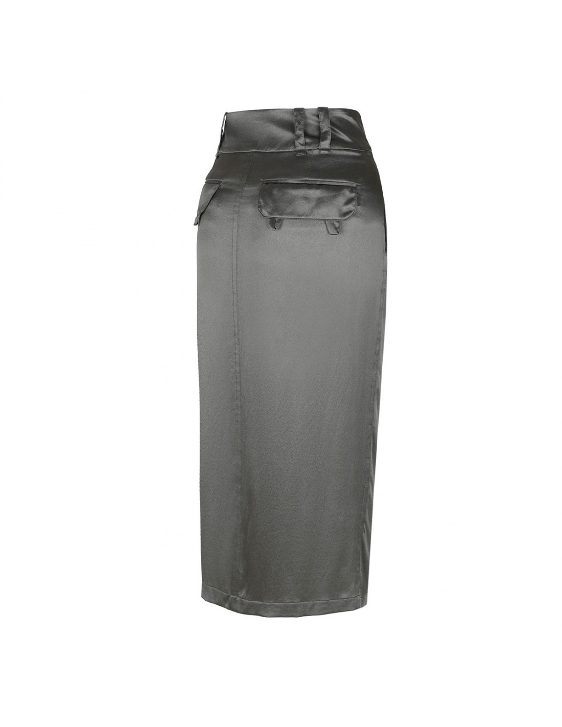 Gray silk crepe de chine pencil skirt from Saint Laurent featuring cargo pockets, belt loops on the waistband, front button closure, back flap pockets, front vent.