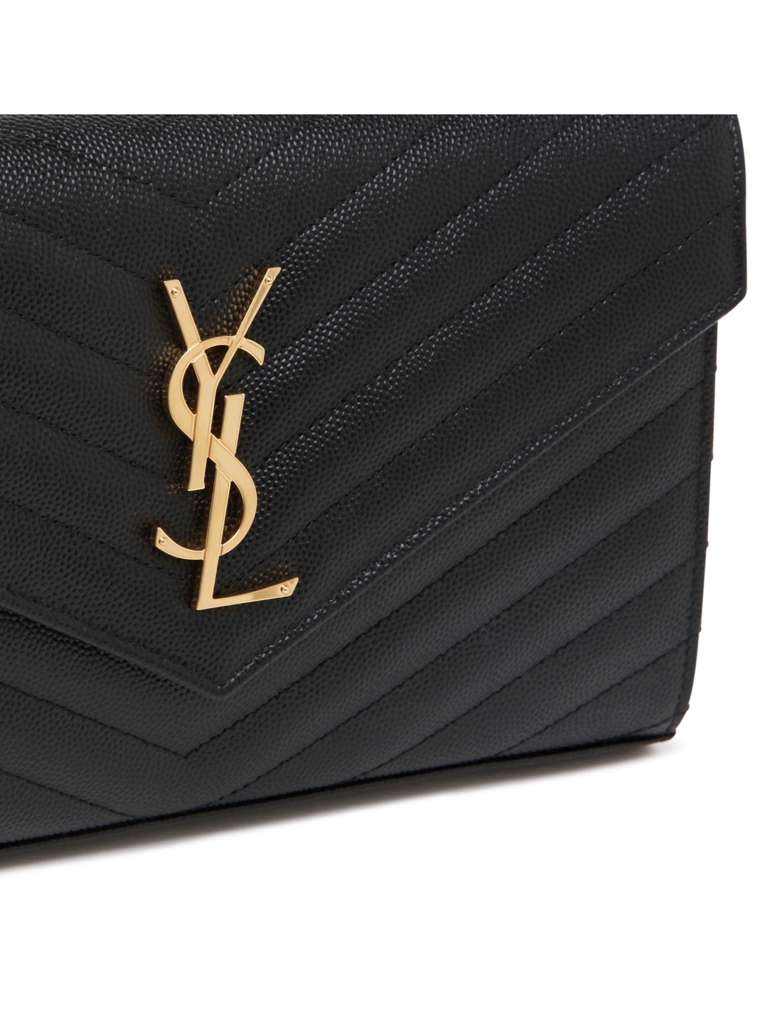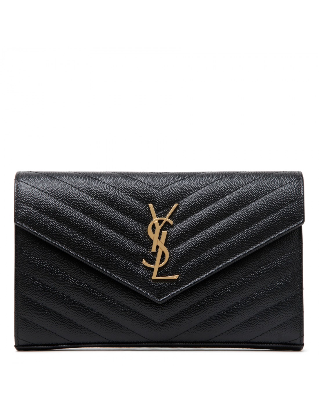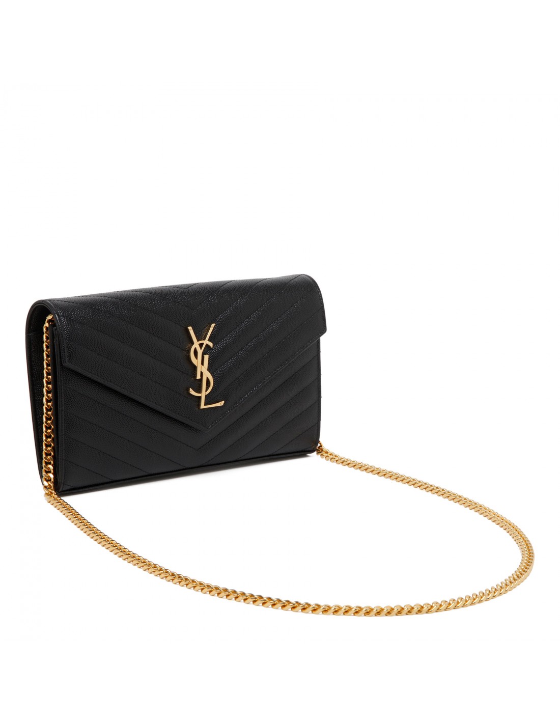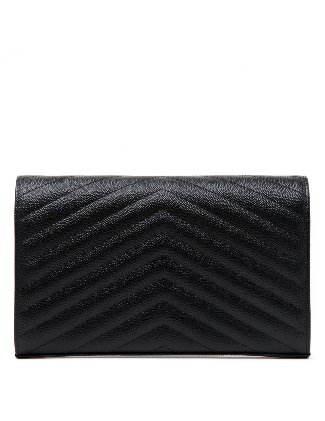 Black grain de poudre embossed leather Cassandre matelassé chain clutch from Saint Laurent featuring flap with interlocking YSL logo, snap fastening, detachable chain shoulder strap, quilted overstitching, ten card slots, two bill compartments, two central compartments and one zipped coin pocket.