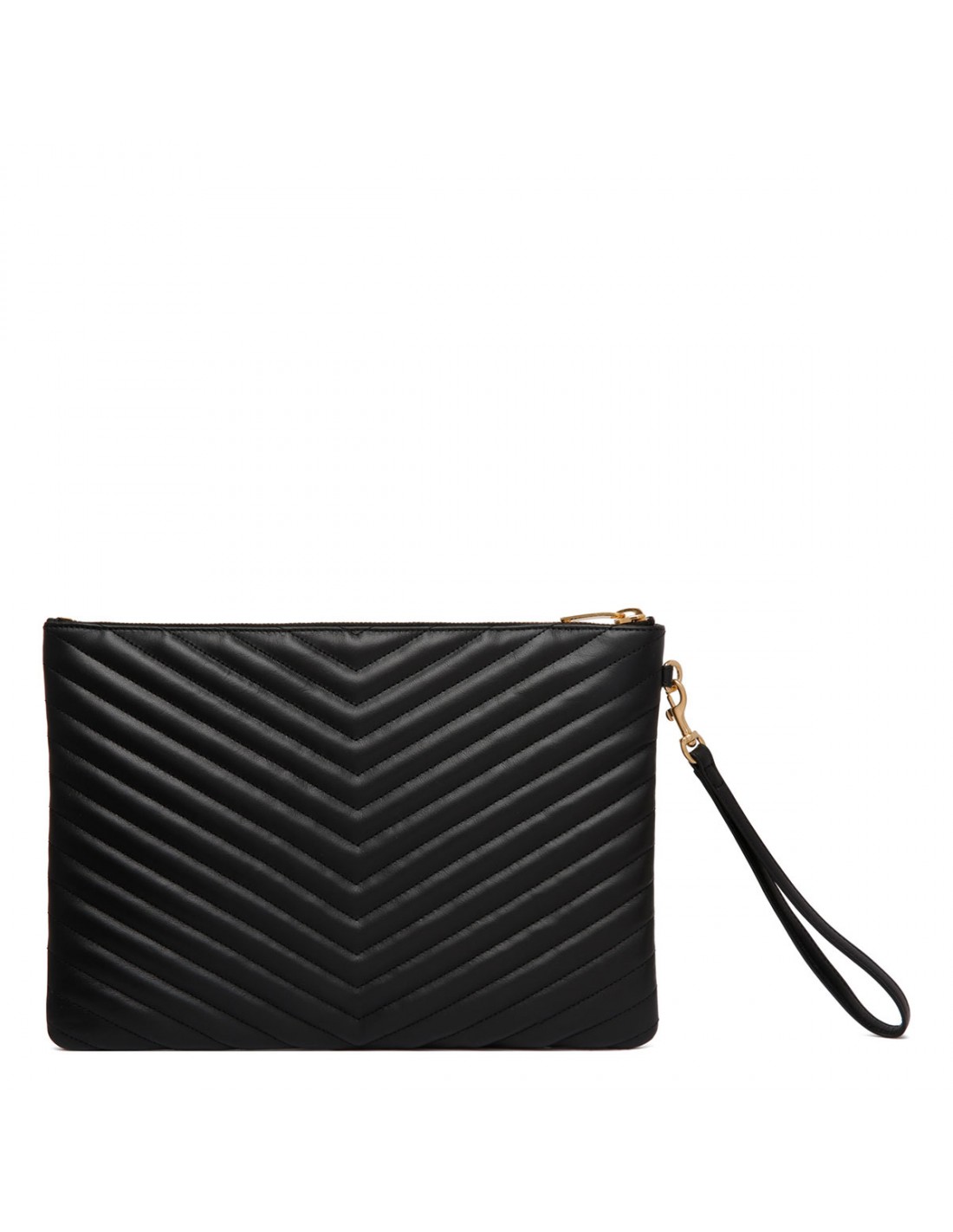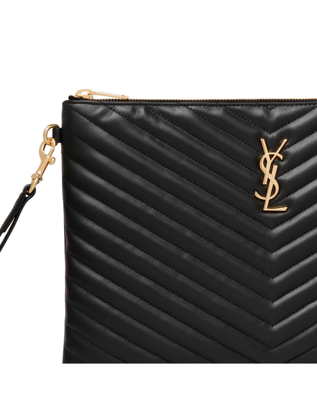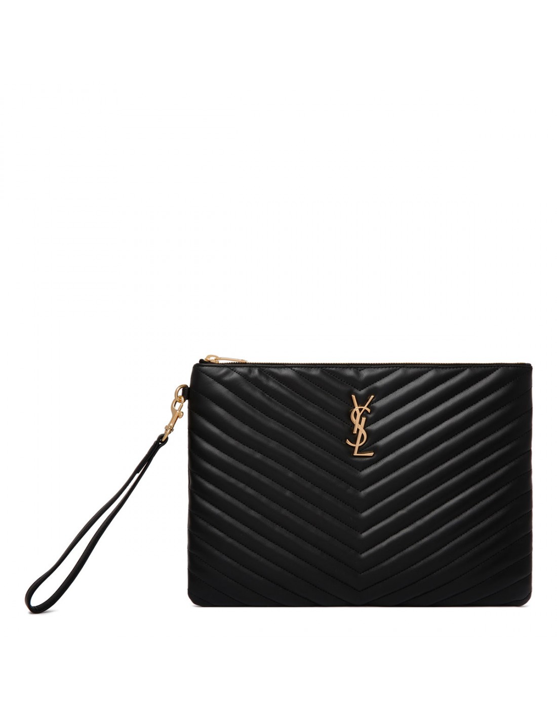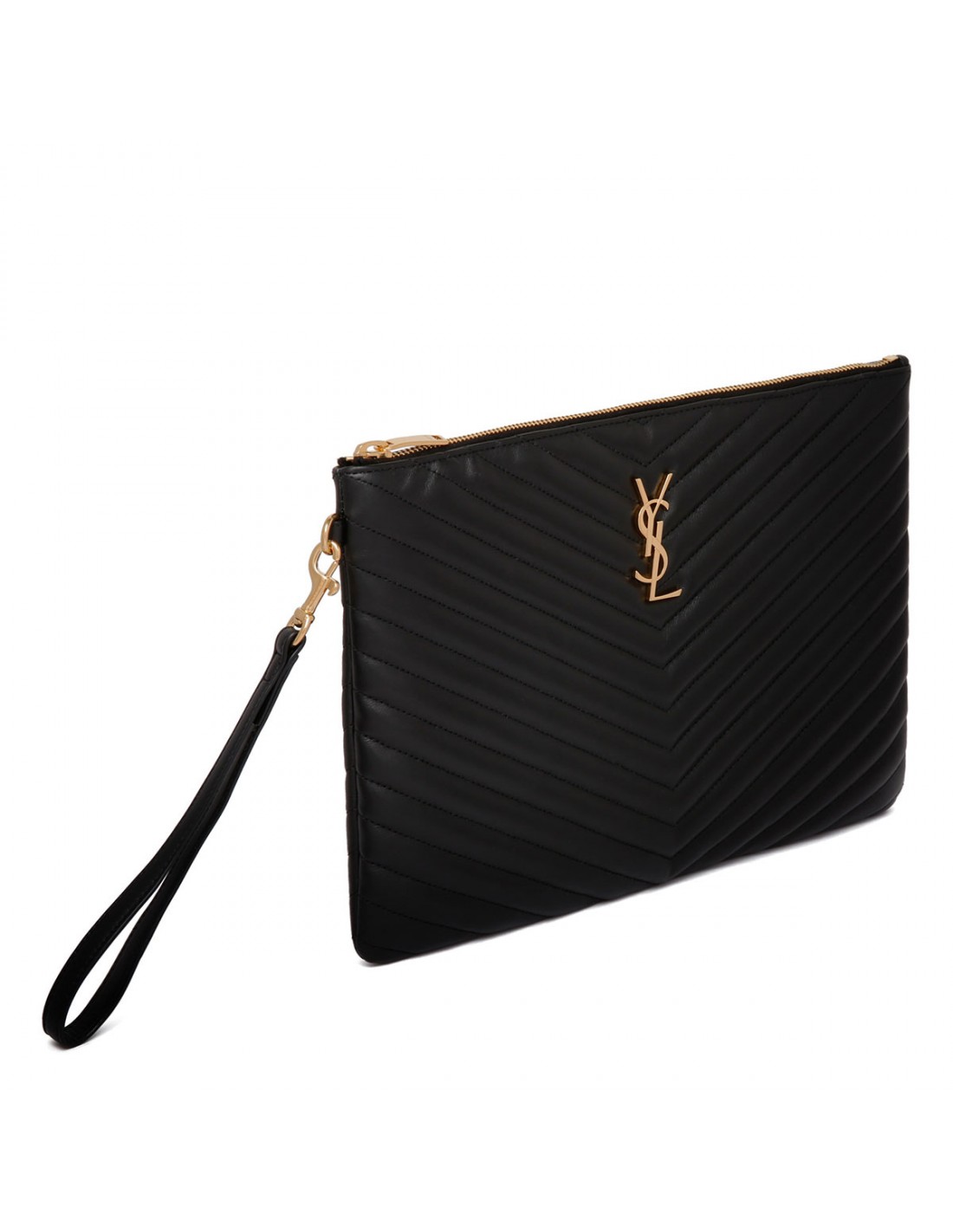 Black matelassé leather Cassandre pouch from Saint Laurent featuring quilted overstitching, gold-tone Cassandre embellishment, detachable handle, certified cotton lining, six card slots and two flat pockets.