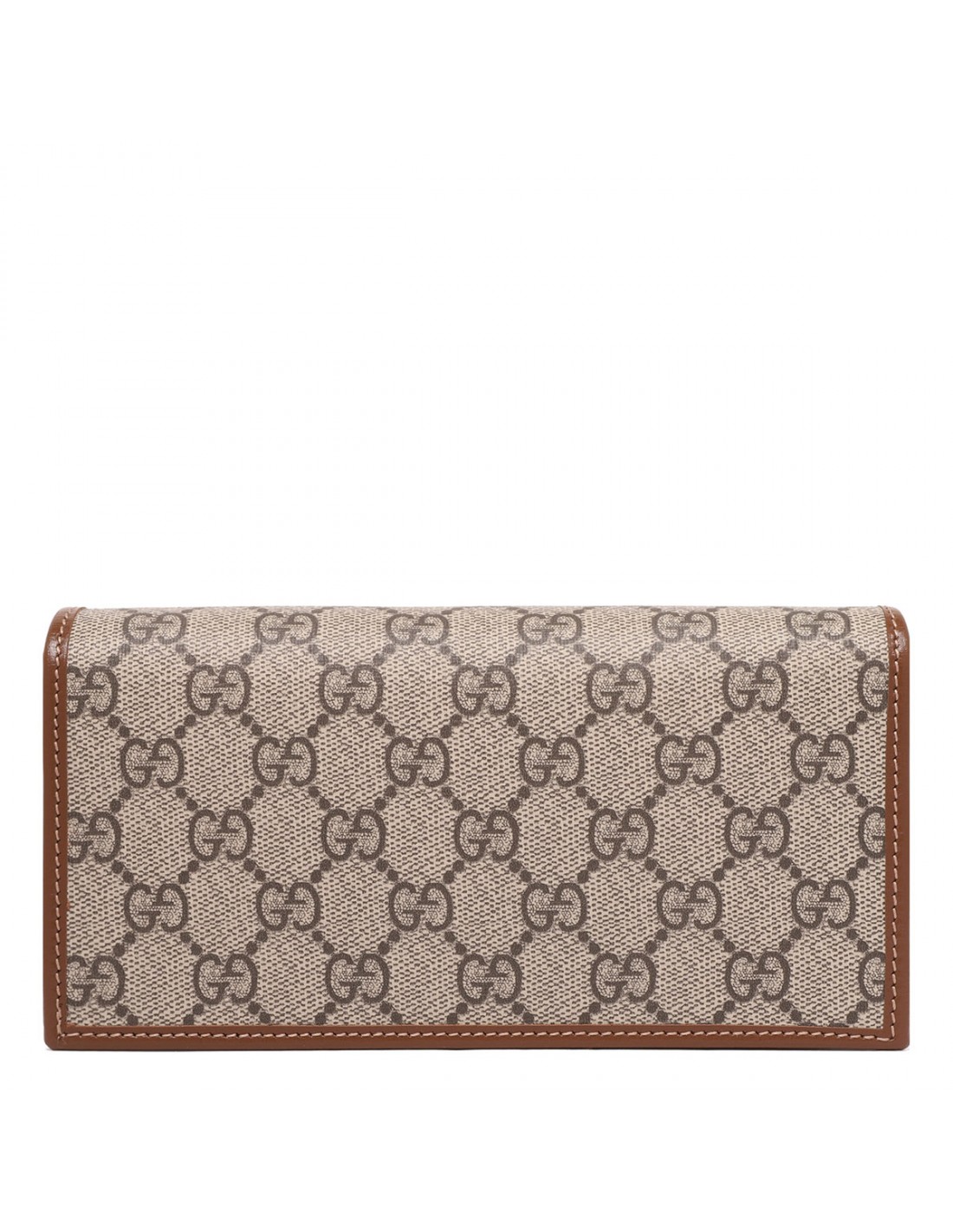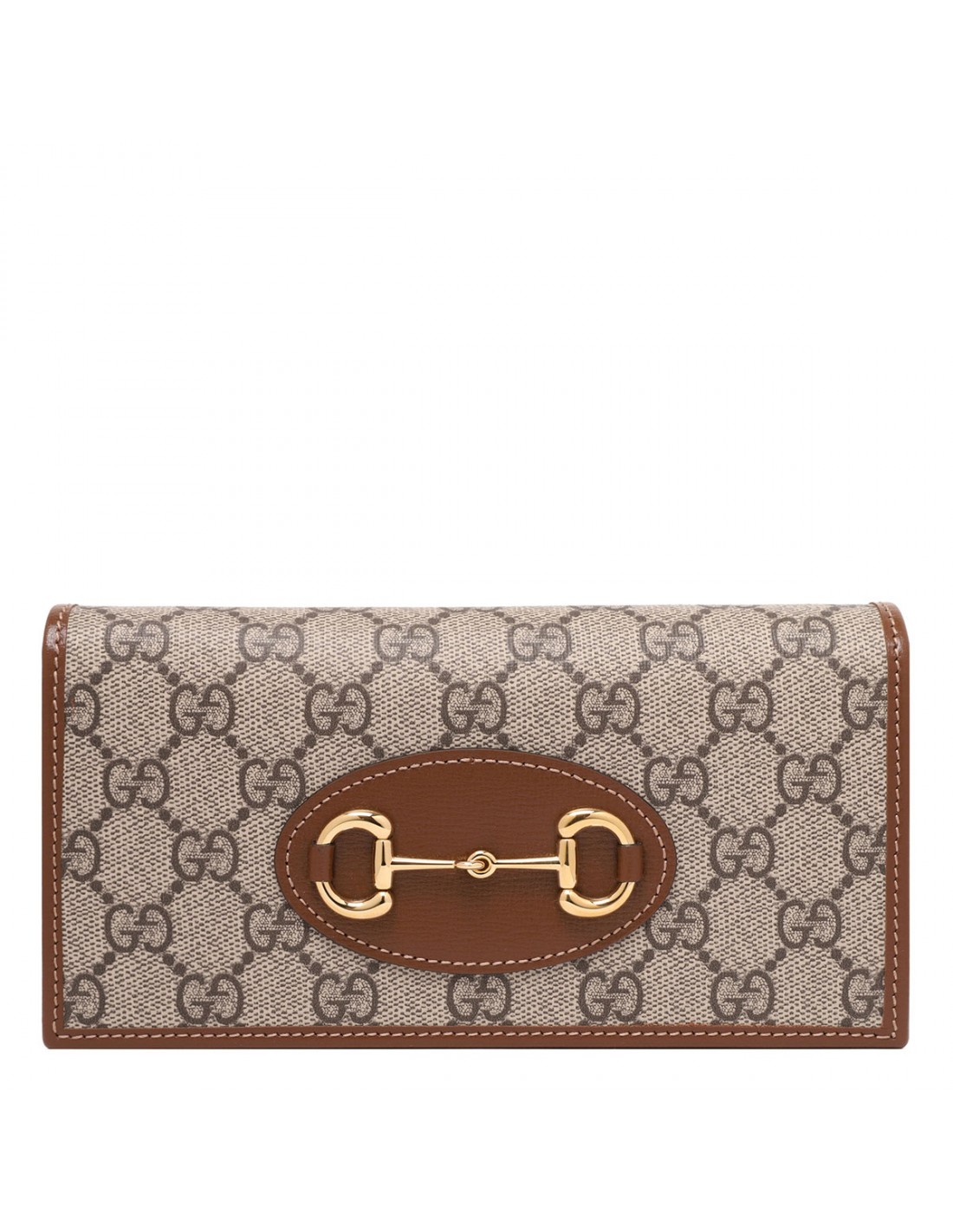 Beige and ebony Supreme canvas Horsebit 1955 wallet on chain from Gucci featuring GG motif, brown leather details, gold-toned Horsebit and hardware, detachable chain shoulder strap, snap button fastening, moiré and suede lining, six card slots, one flat pocket, one zipped pocket, open compartment.