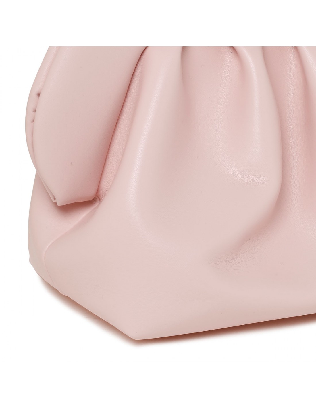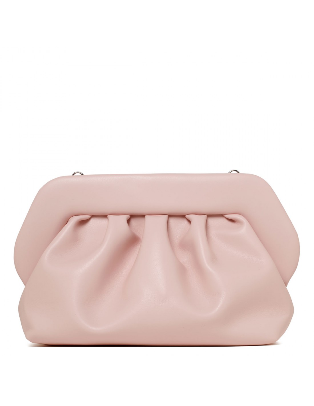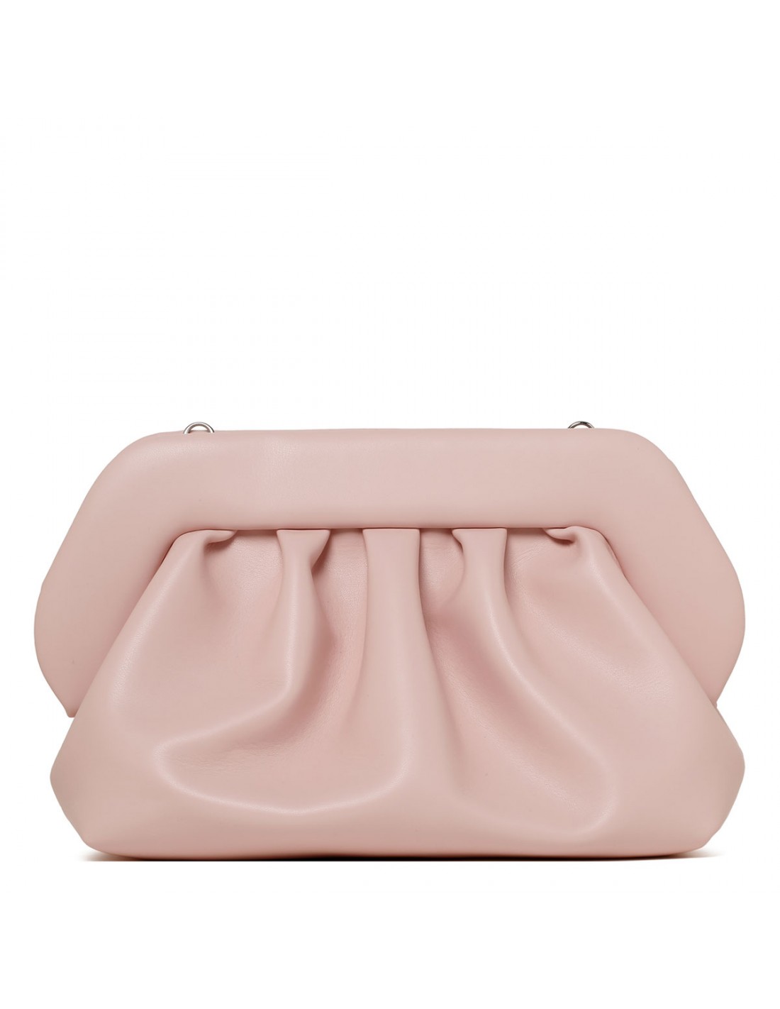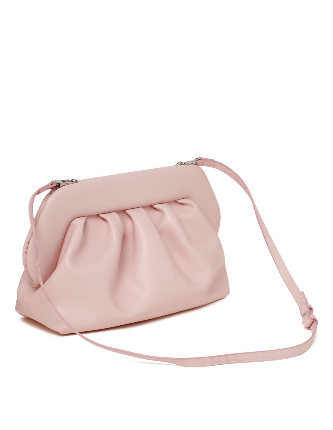 Pink vegan fabric Bios clutch bag from Themoirè featuring tonal detachable and adjustable shoulder strap and magnetic fastening.