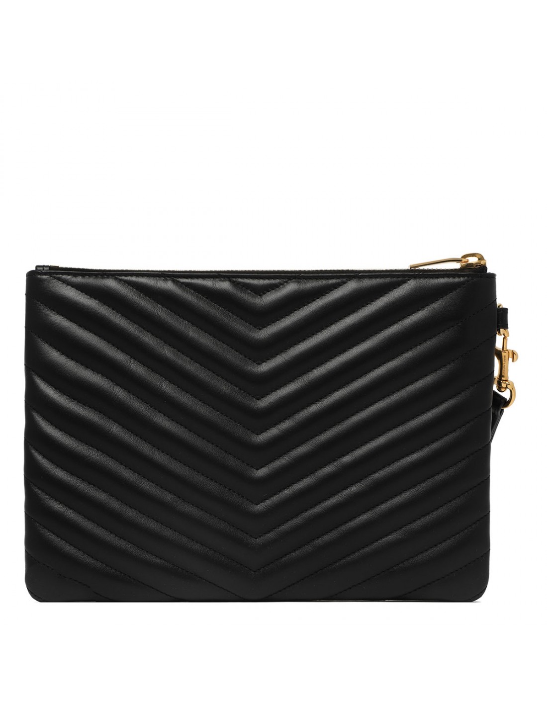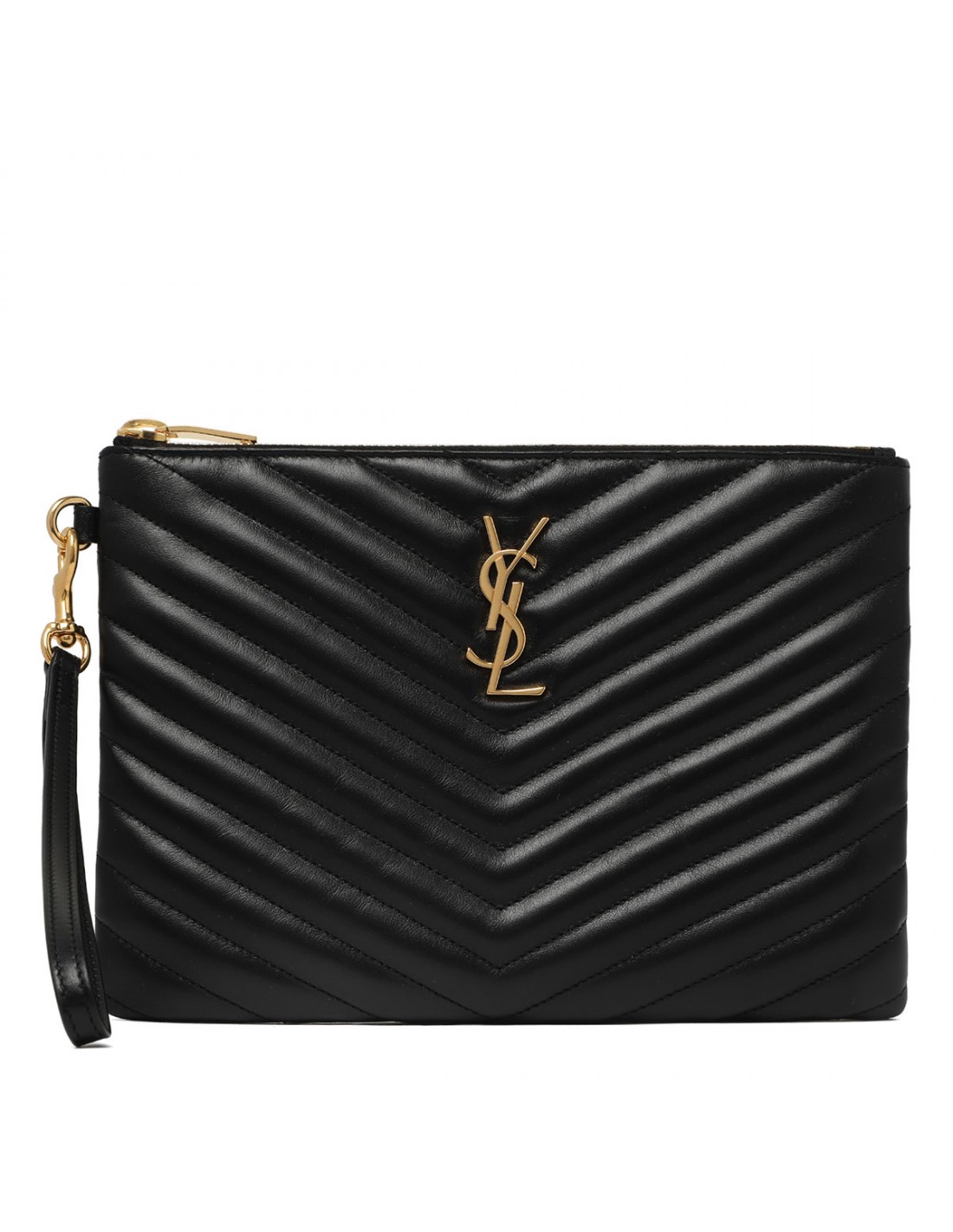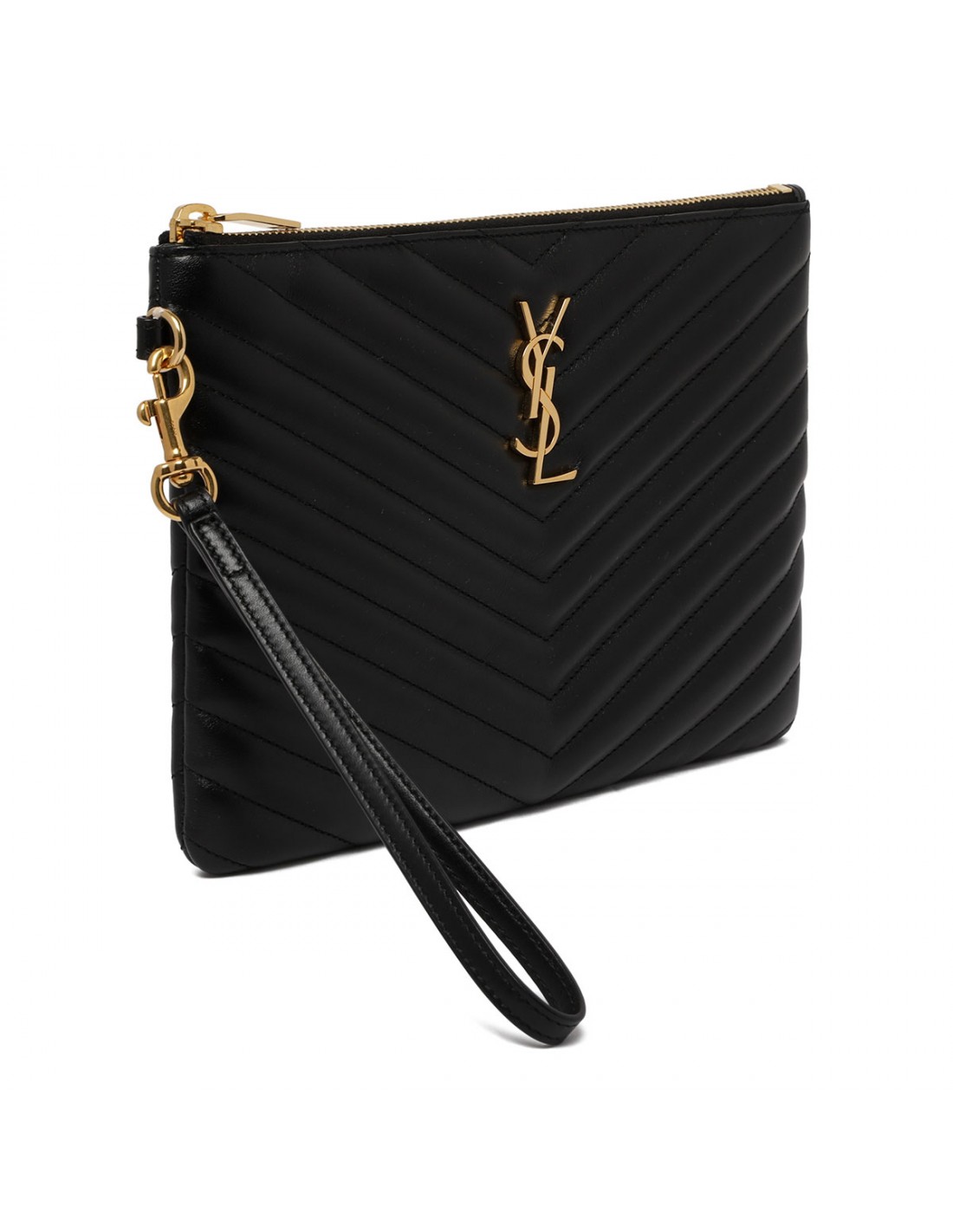 Black matelassé leather Cassandre matelassé A5 pouch from Saint Laurent featuring golden metal Cassandre and hardware, detachable wrist strap, matelassé stitching, zip fastening along top, grosgrain lining, six card slots, two flat pockets, one central compartment.