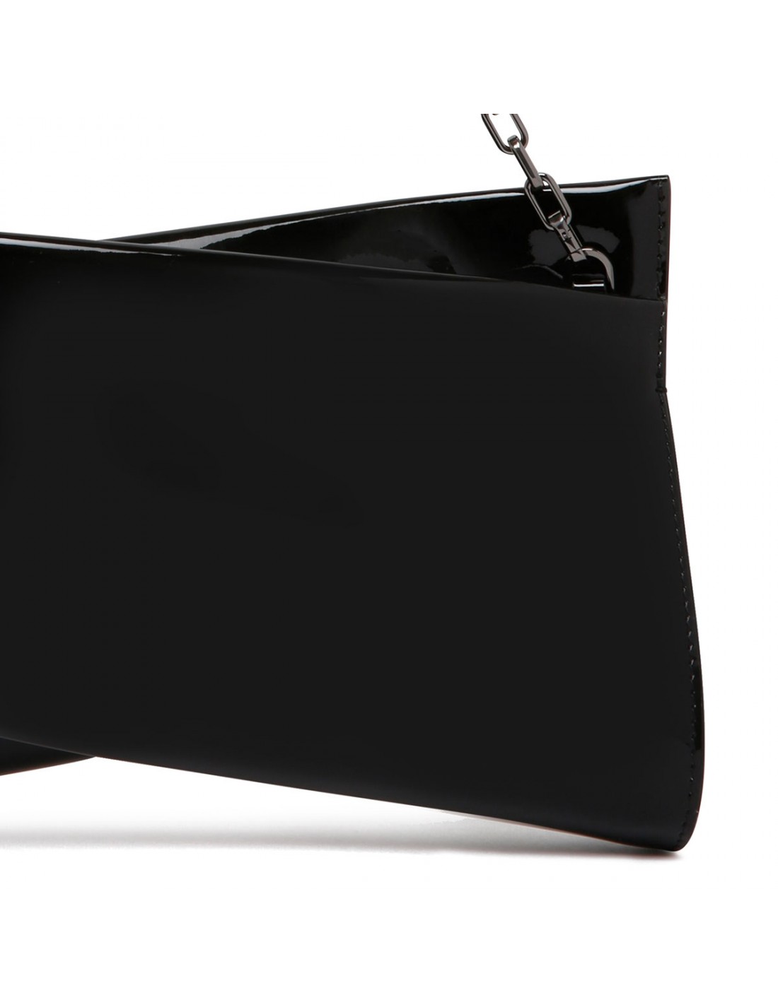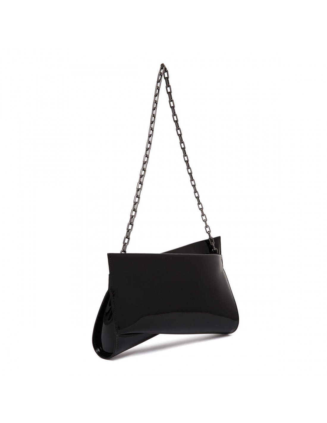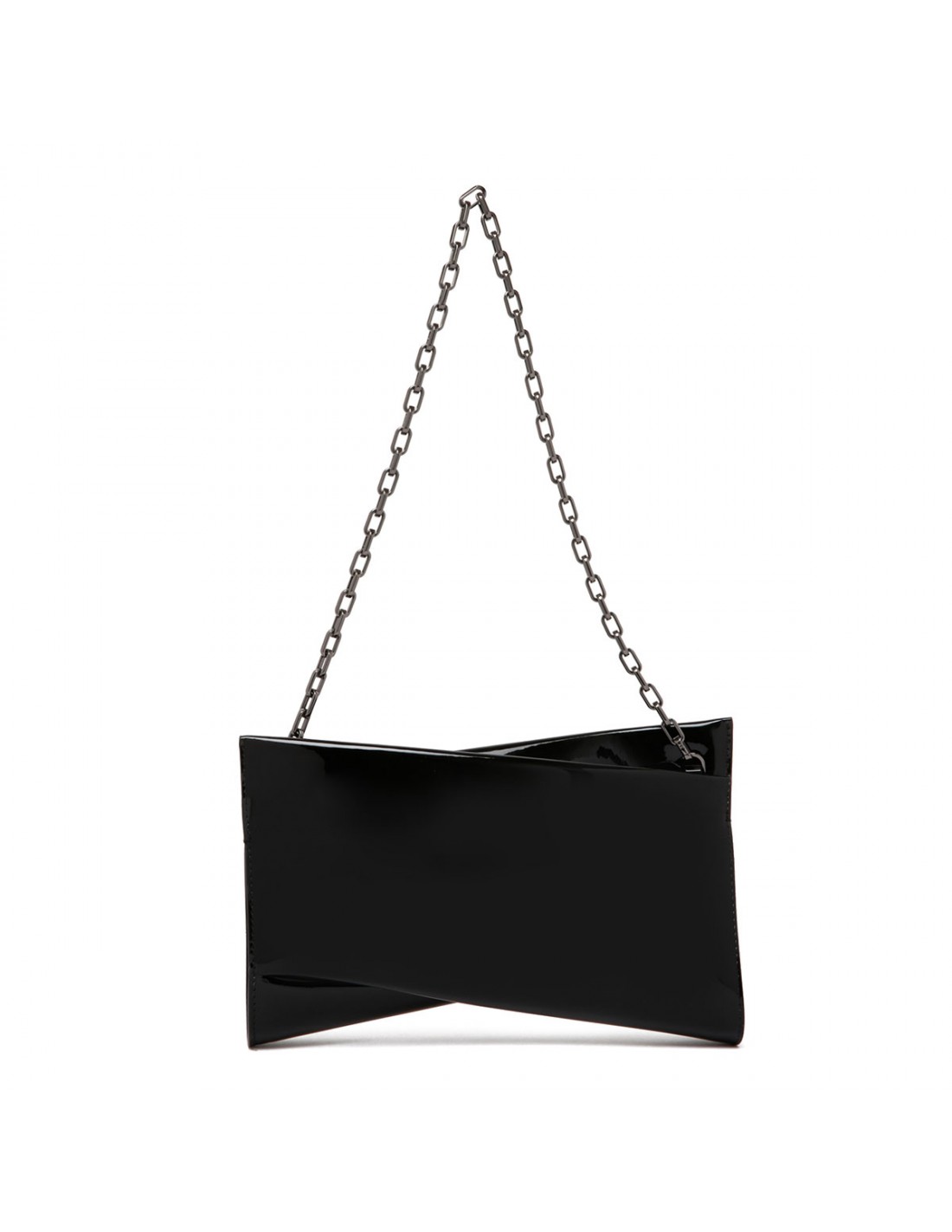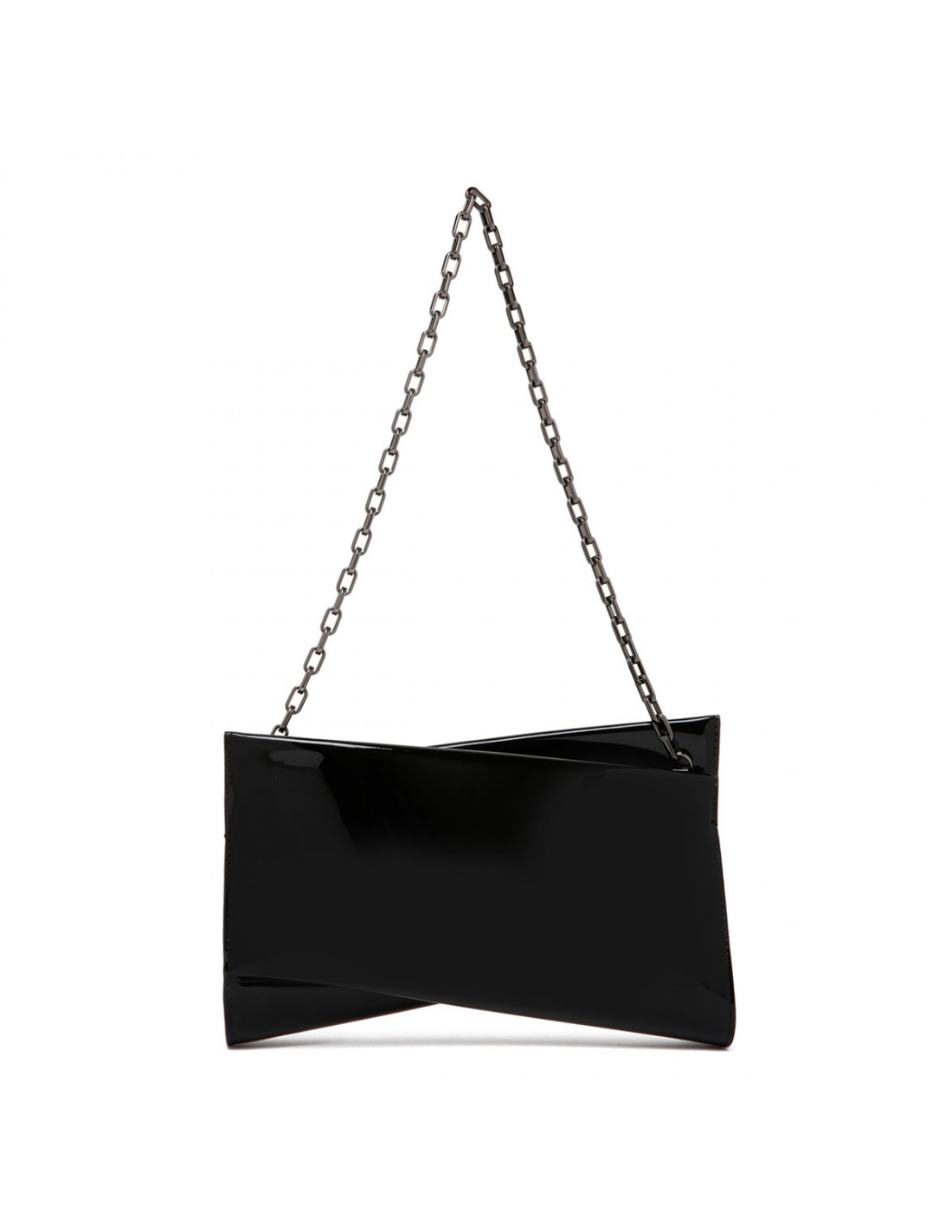 Black patent leather Loubitwist small clutch from Christian Louboutin featuring detachable chain strap, zip fastening, iconic red lining, two credit card pockets.