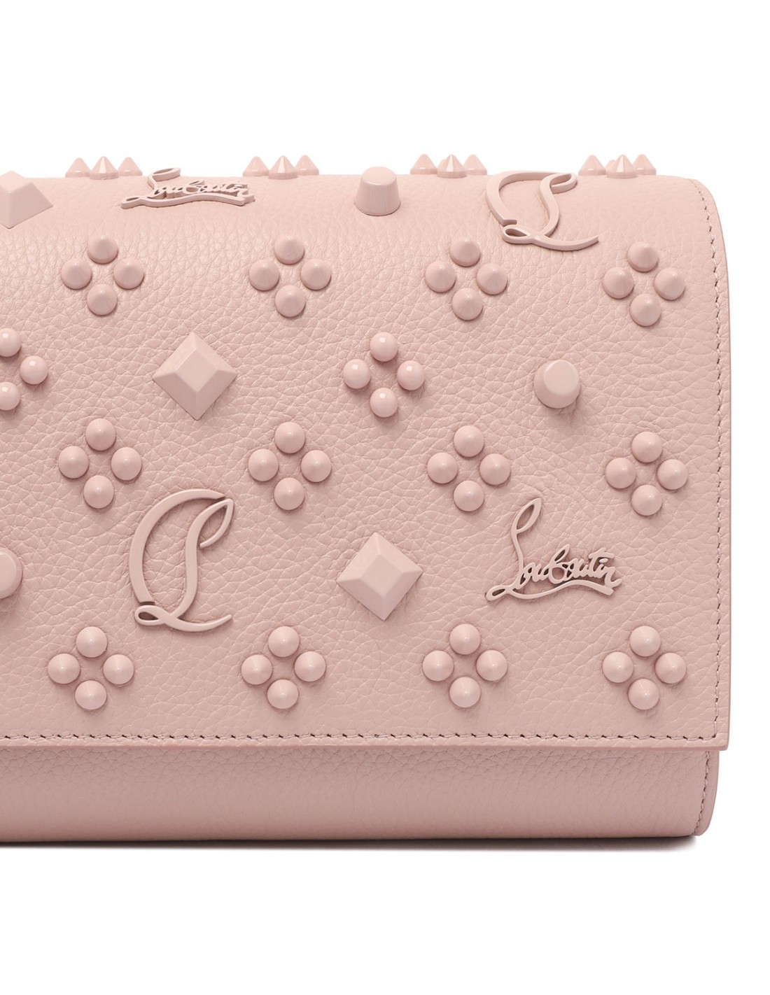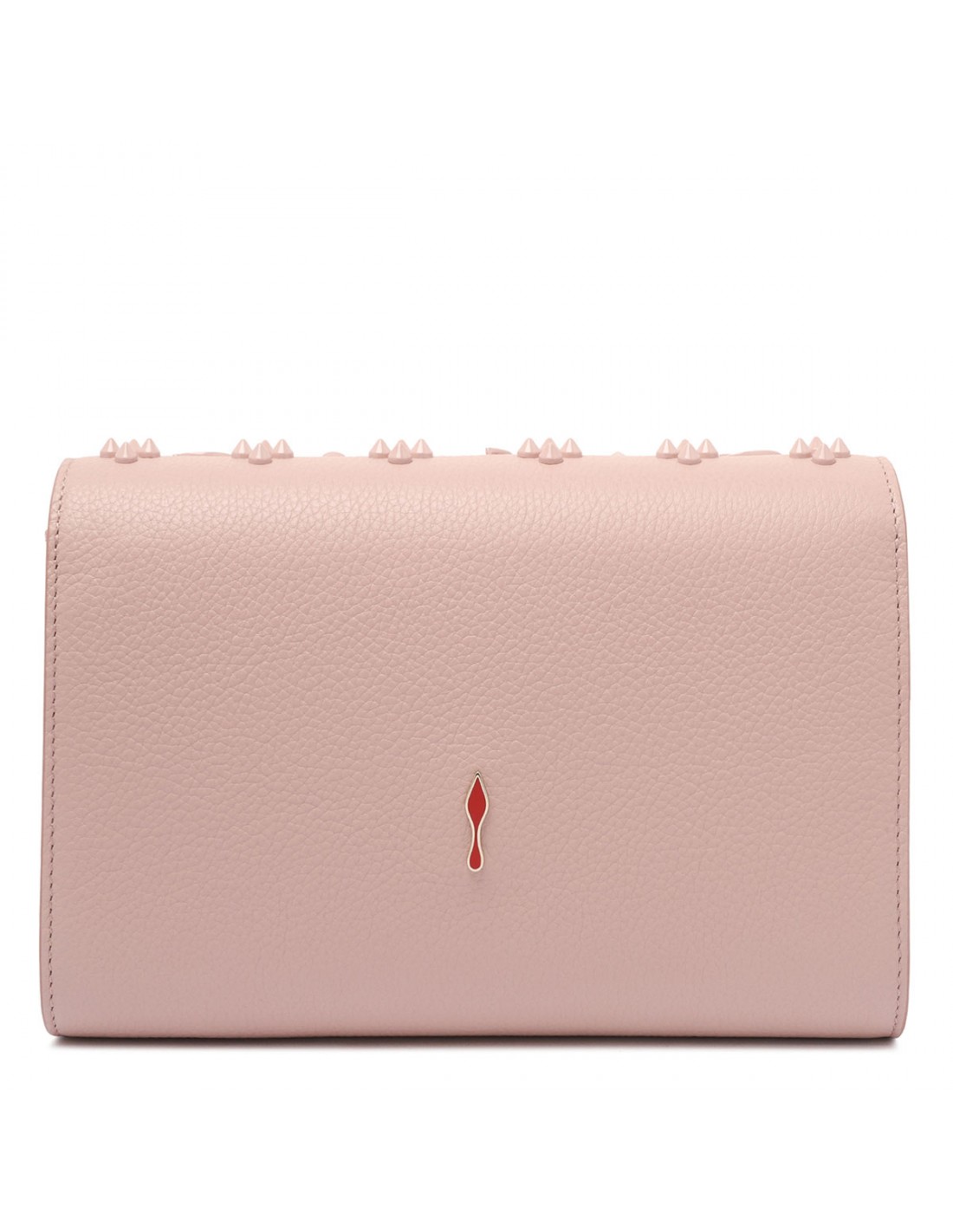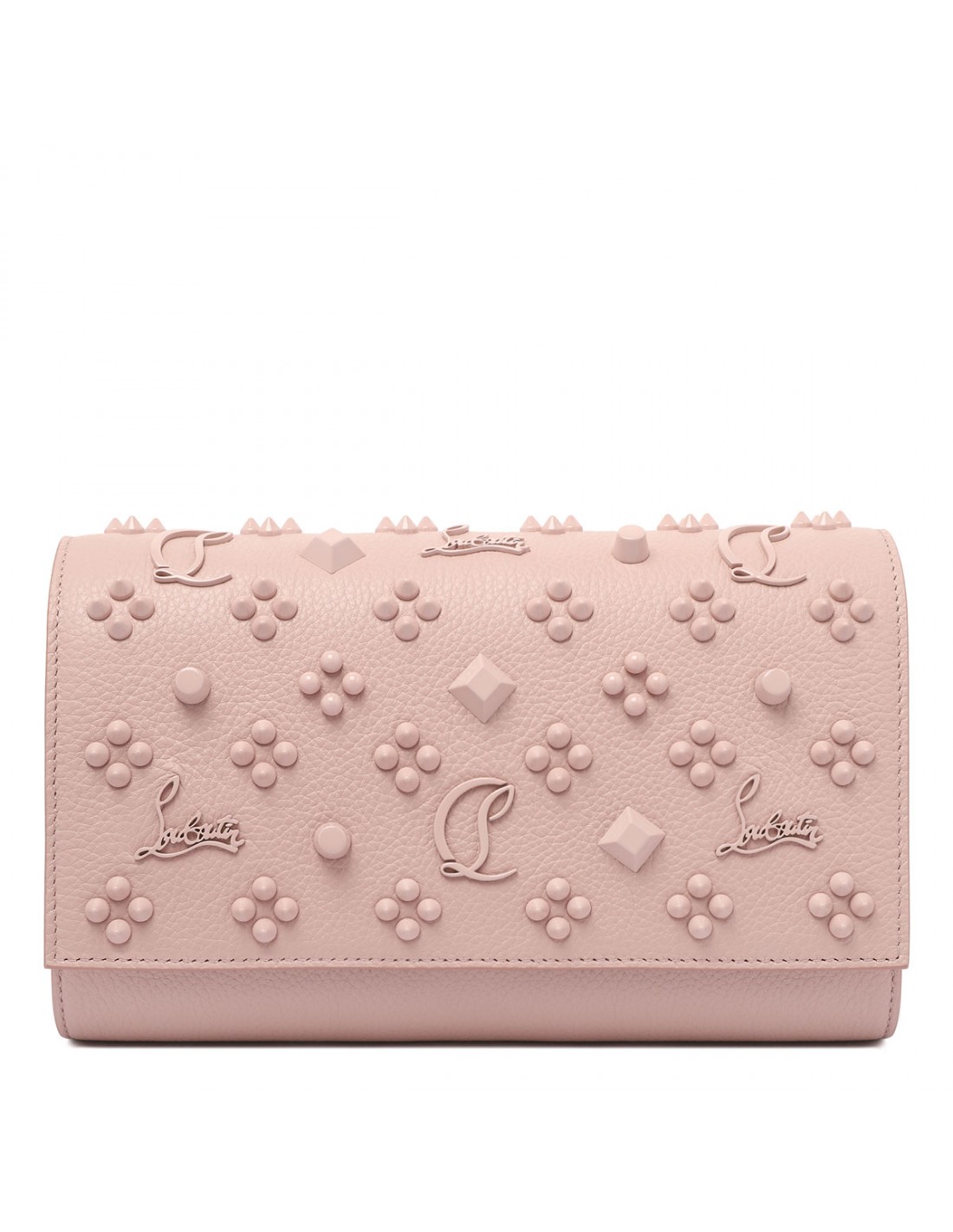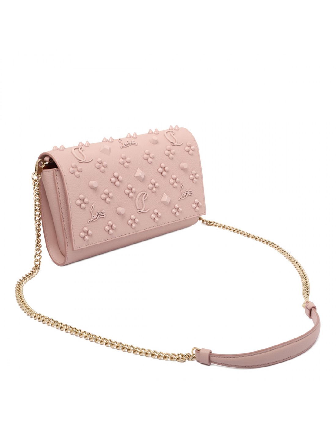 Vintage rose textured calf leather Paloma clutch from Christian Louboutin featuring Loubinthesky rose gold spikes, detachable leather-reinforced chain strap, front flap with magnetic fastening, three internal pockets and ten credit card slots.