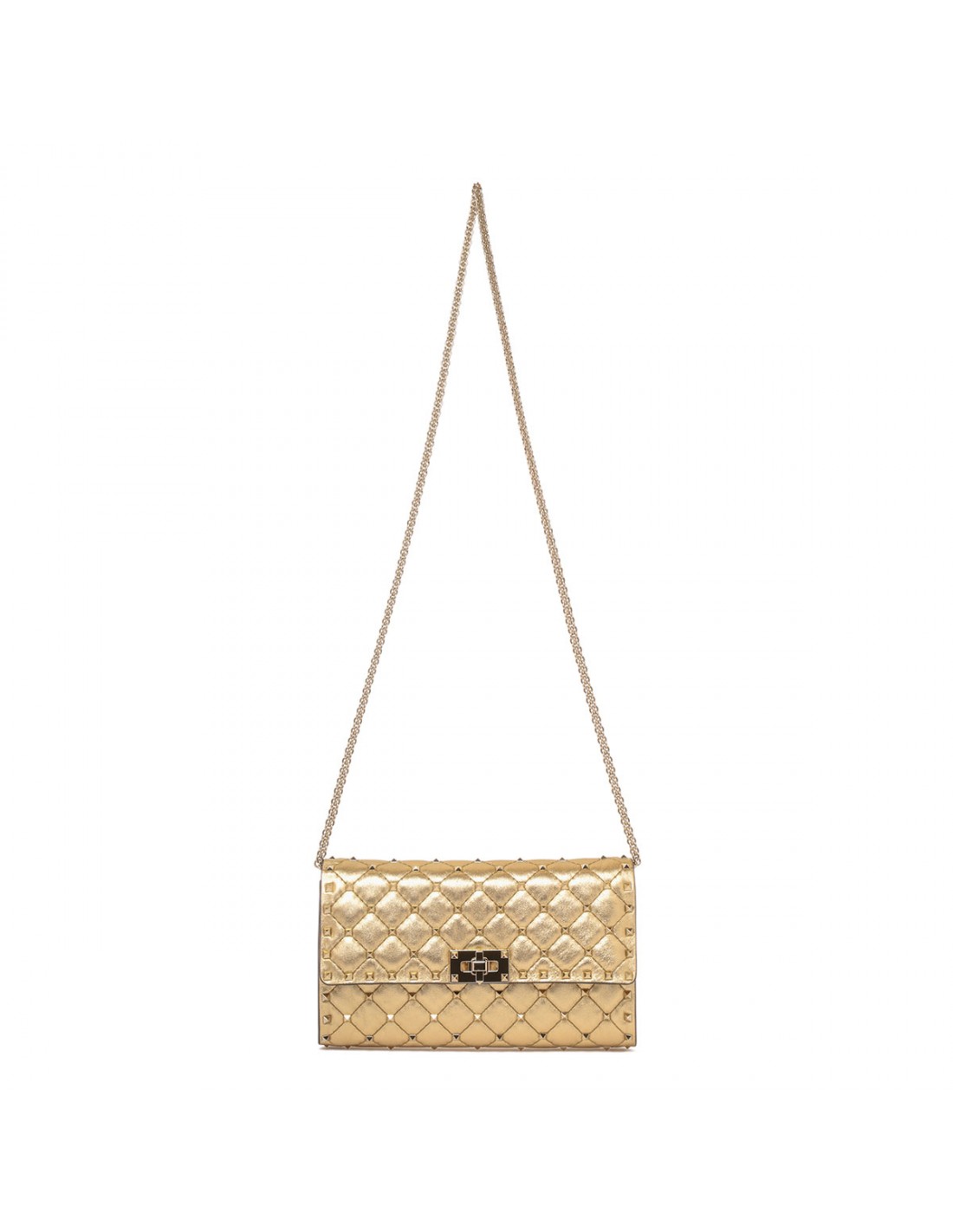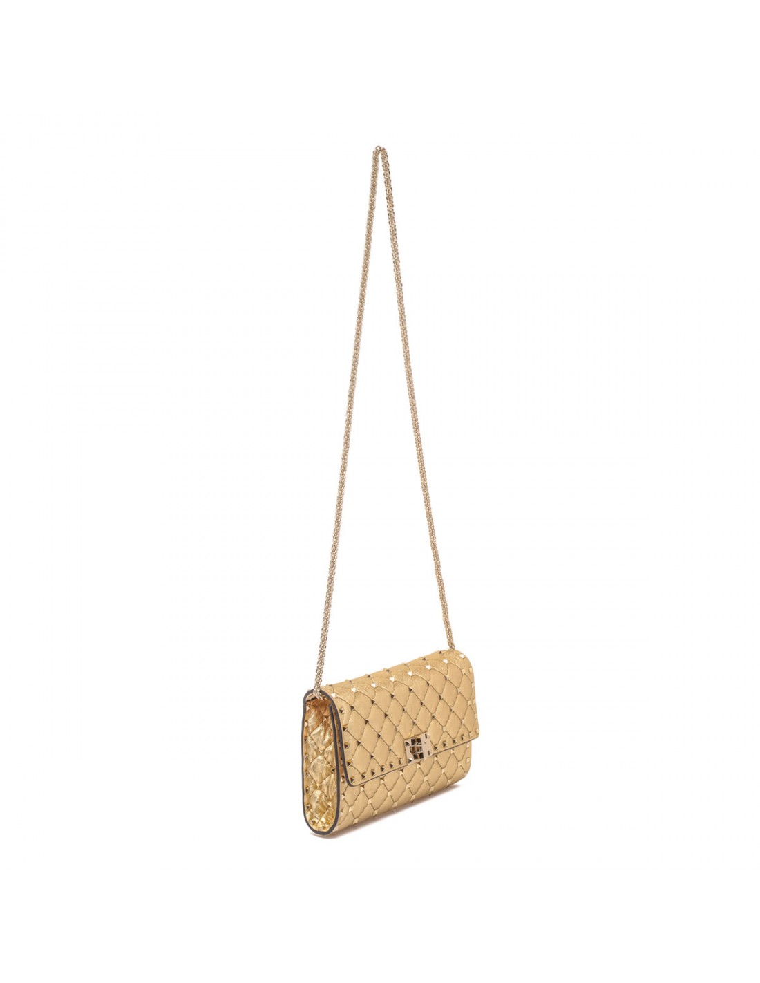 Soft beige laminated leather Rockstud spike crossbody clutch bag from Valentino Garavani featuring quilted stitching with argyle pattern, small studs, detachable sliding chain shoulder strap, flap with twist-lock fastening, nappa lining, red leather zip pocket and eight card slot.