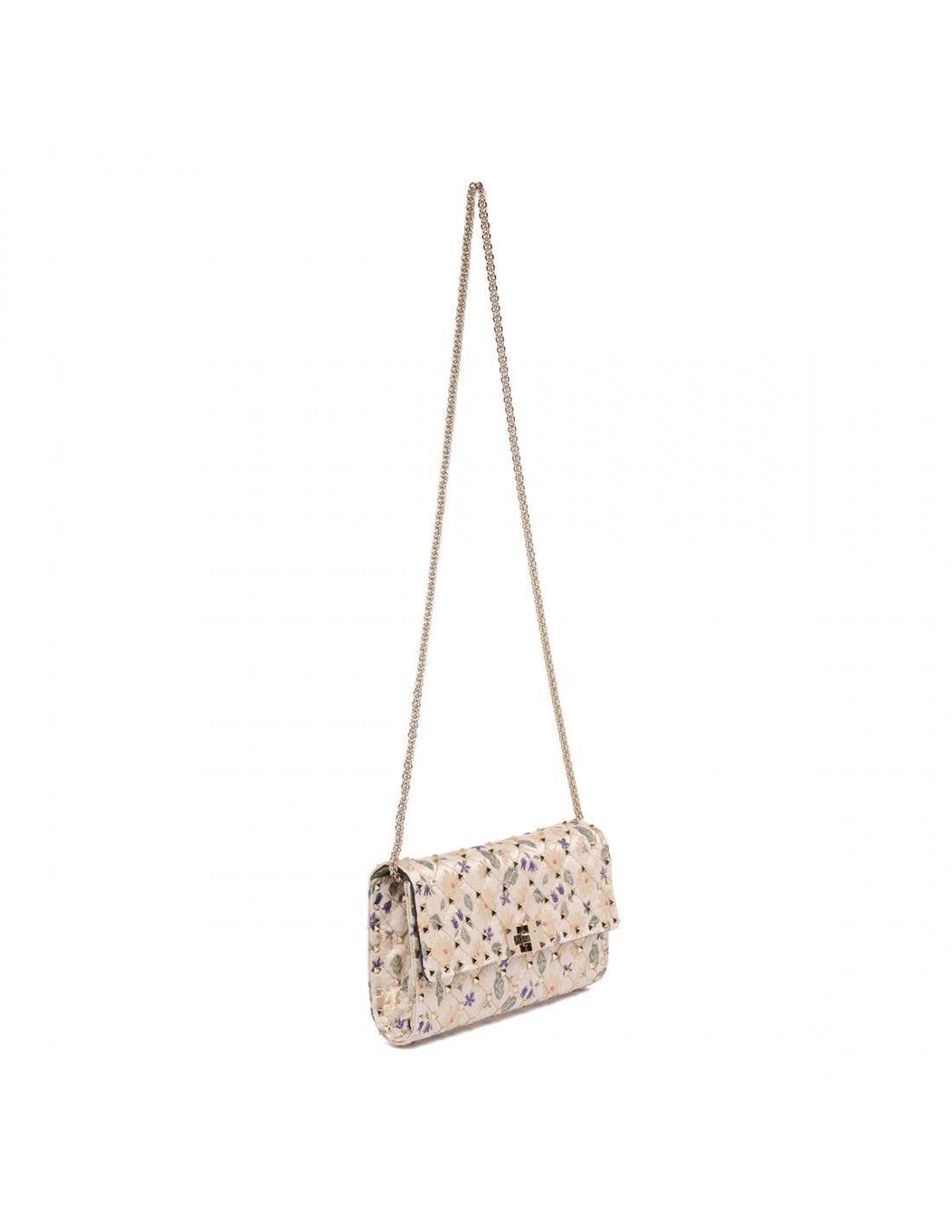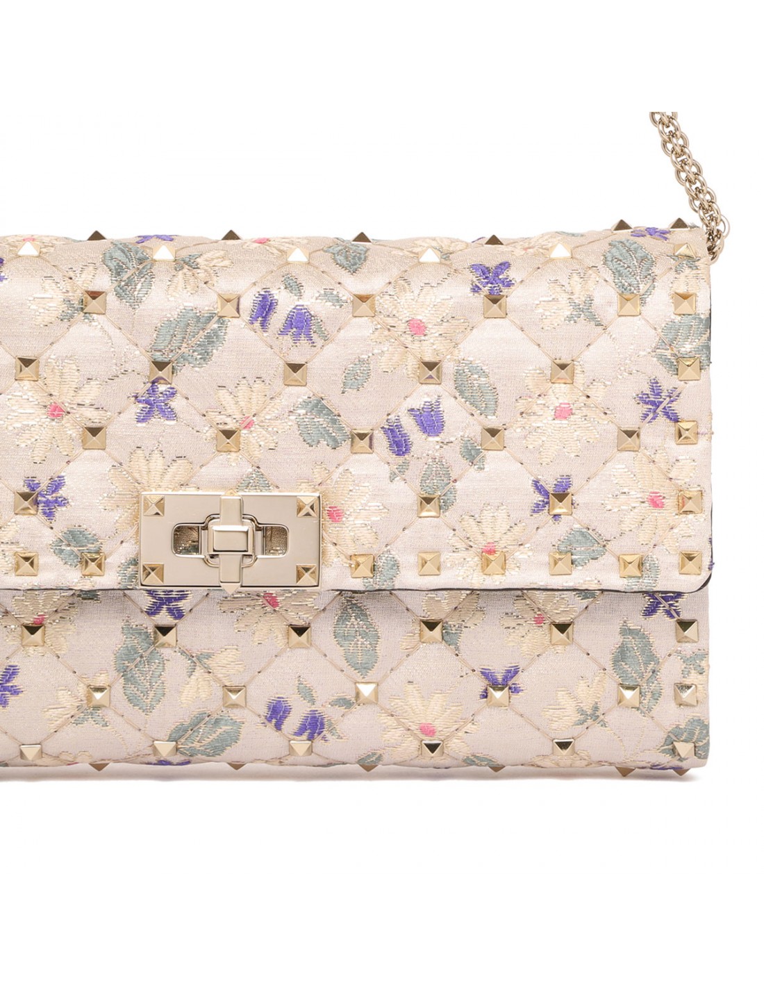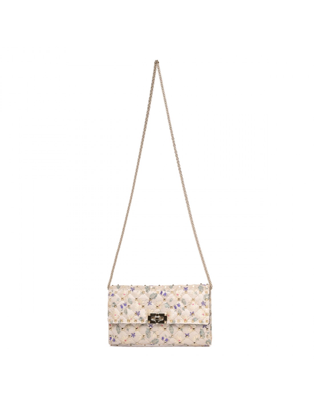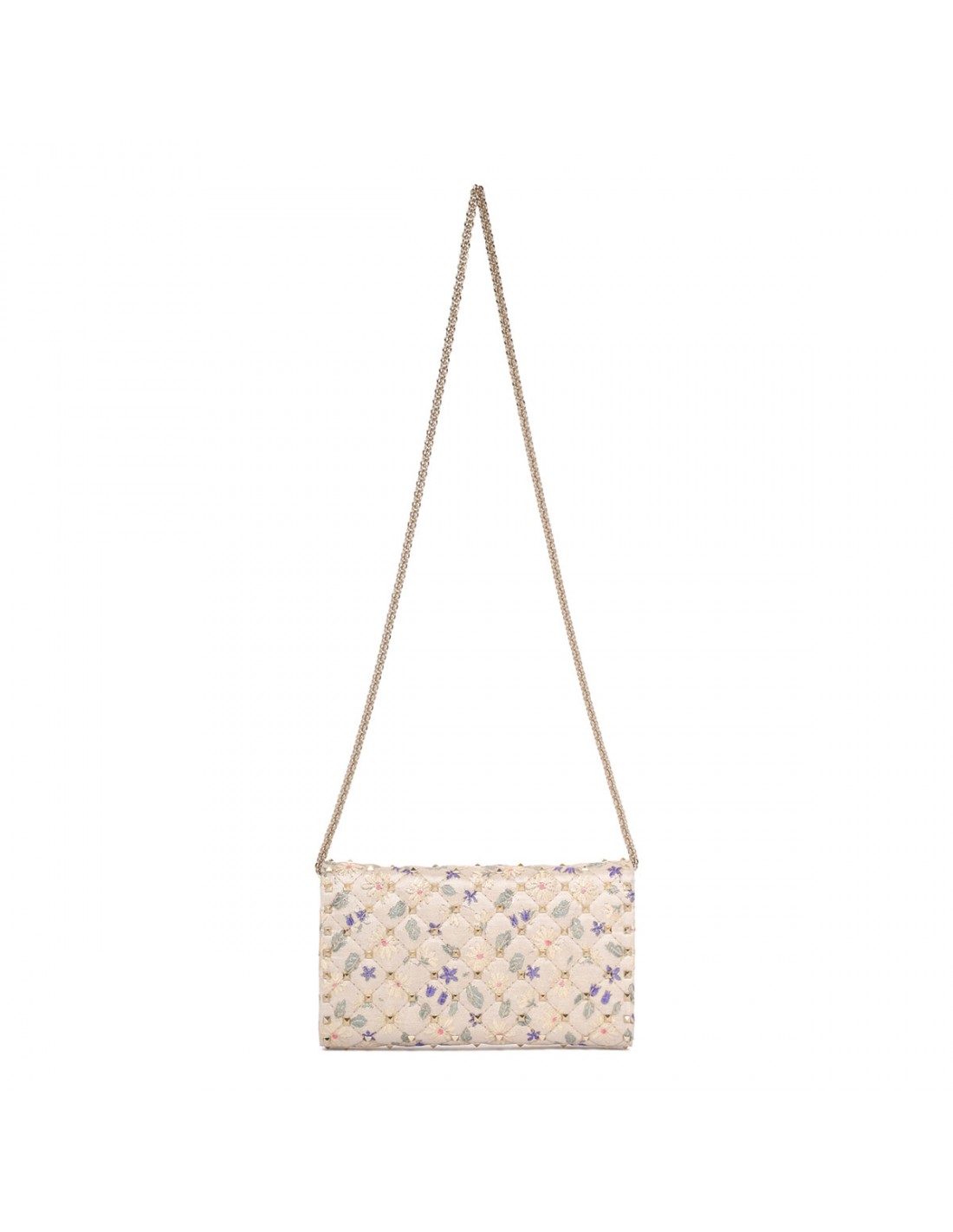 Jacquard Rockstud spike crossbody clutch bag from Valentino Garavani featuring Pétales d'Amour motif, quilted stitching with argyle pattern, small studs, detachable sliding chain shoulder strap, flap with twist-lock fastening, nappa lining, red leather zip pocket and eight card slot.