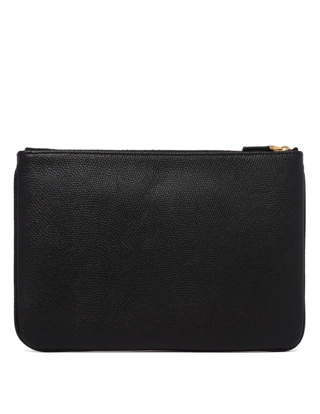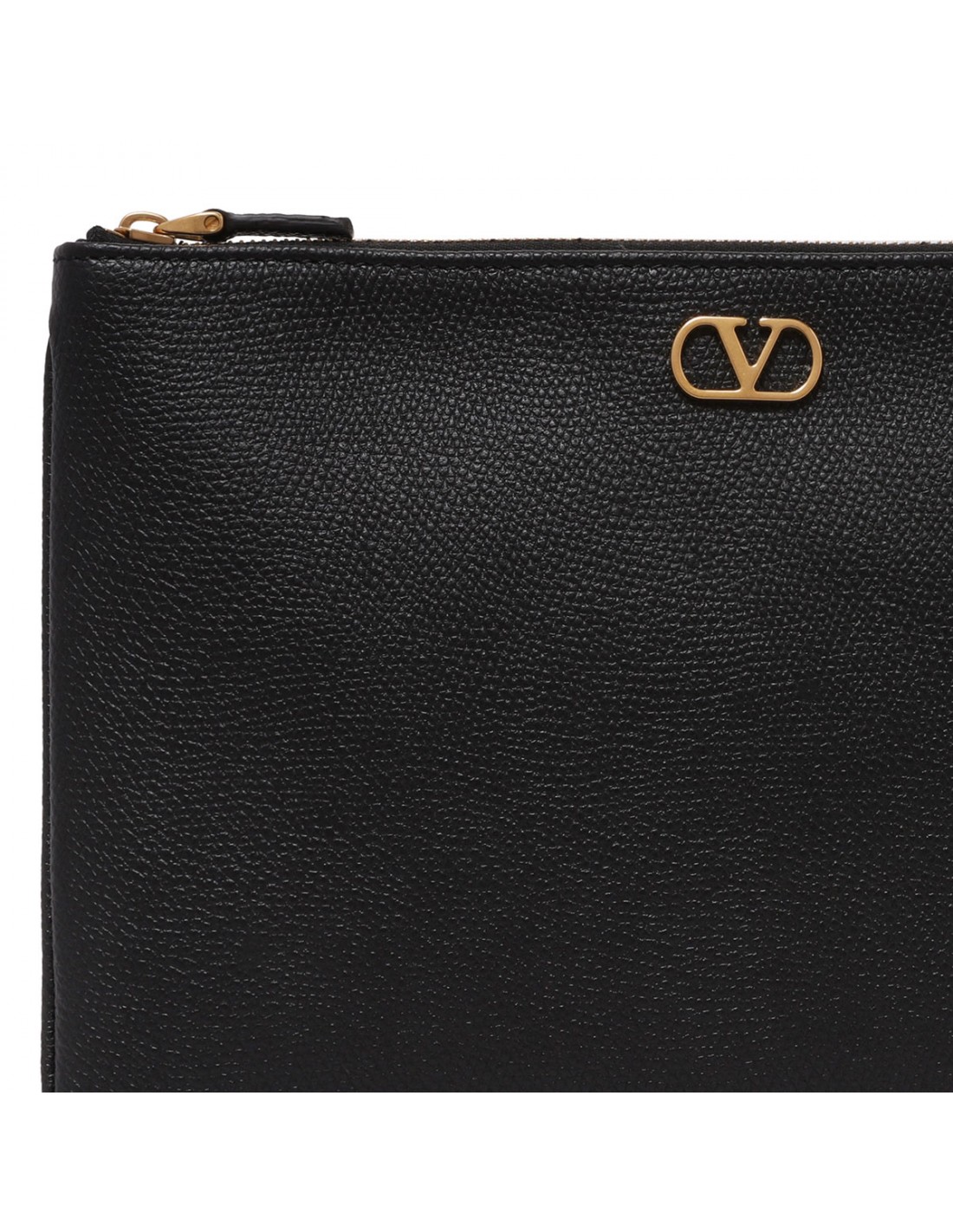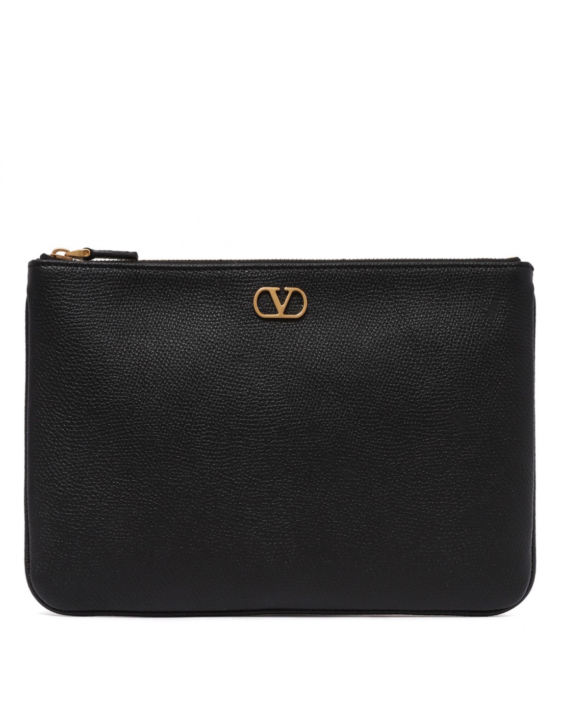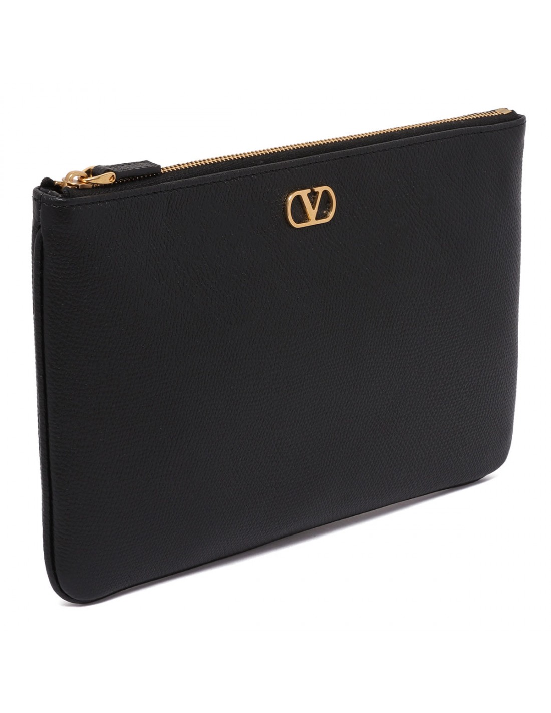 Black grainy leather Vlogo Signature flat pouch from Valentino Garavani featuring gold-finish VLogo Signature, zip fastening along top, three card slots.