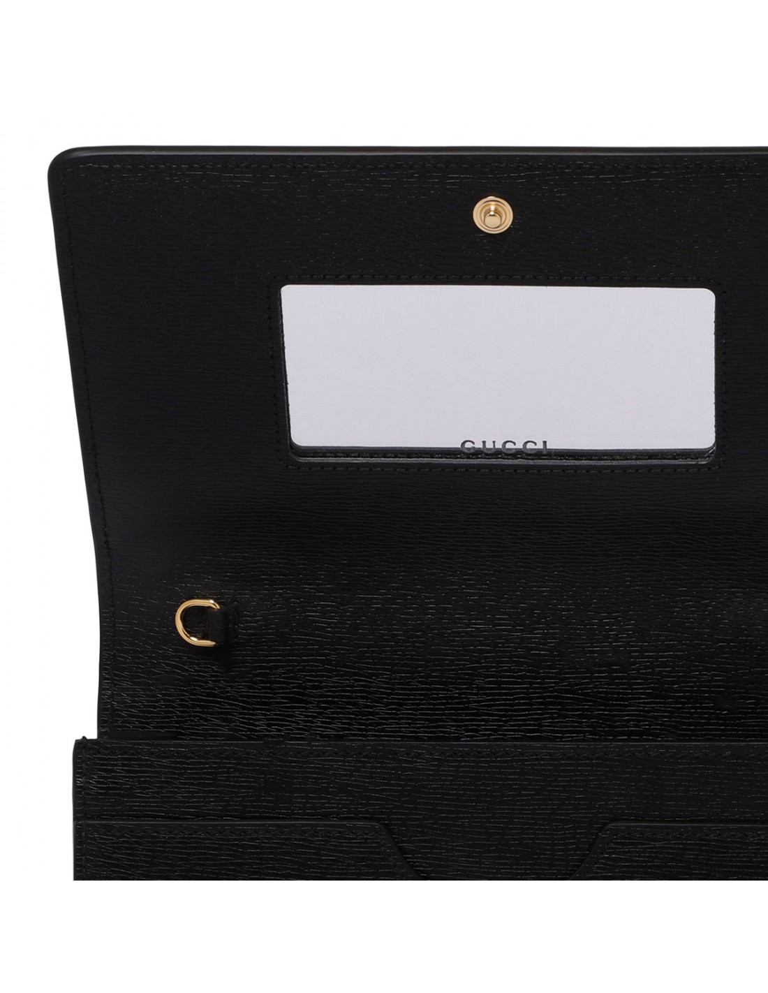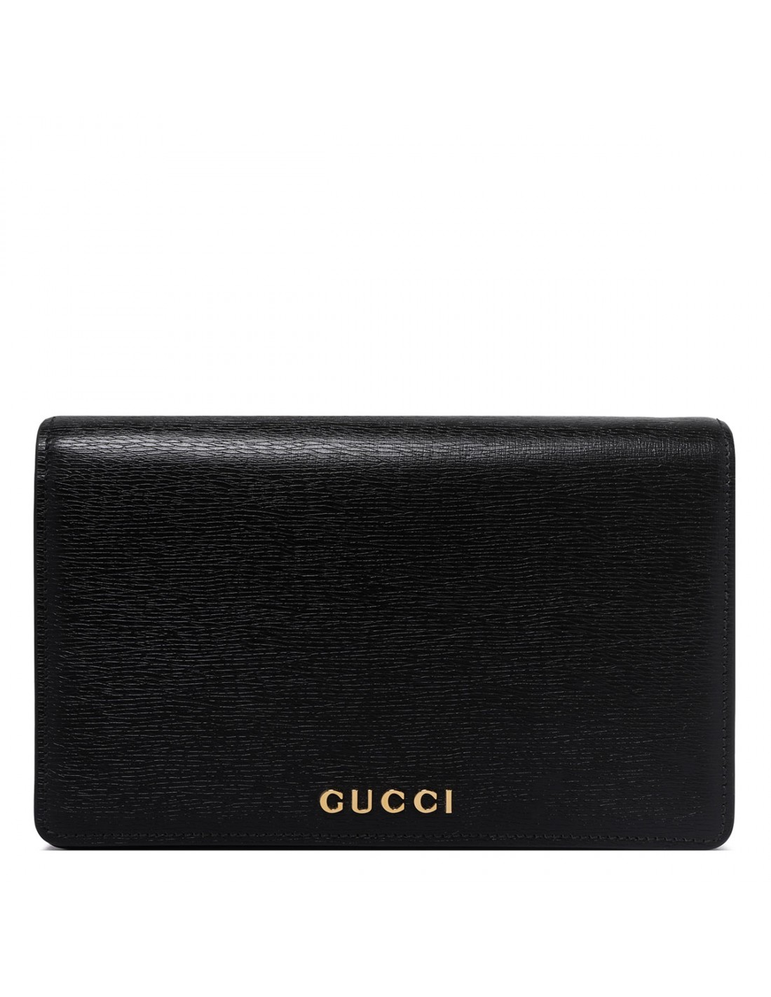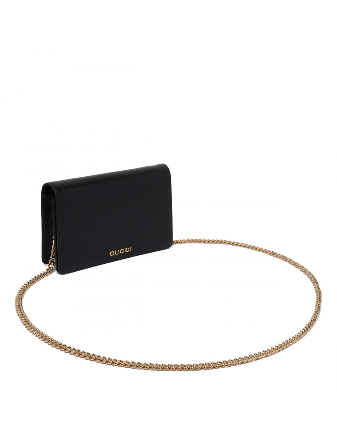 Black leather wallet on chain from Gucci featuring gold-toned Gucci script detail, front flap with snap button closure, detachable chain shoulder strap, mirror, six card slots, zipped coin pocket.