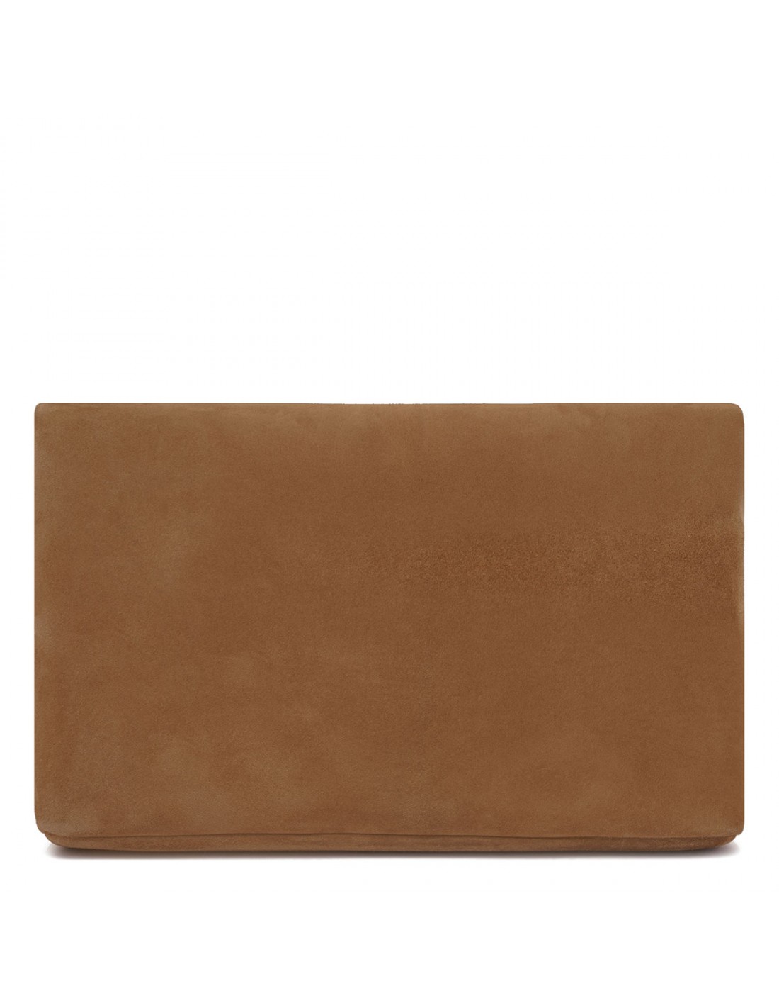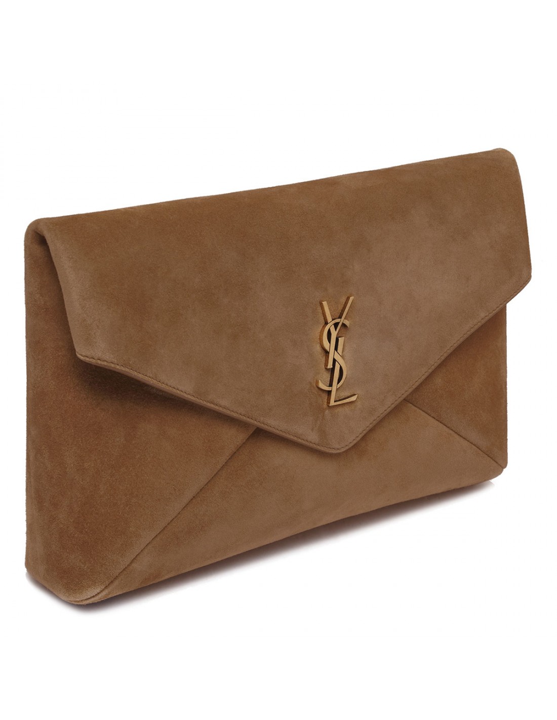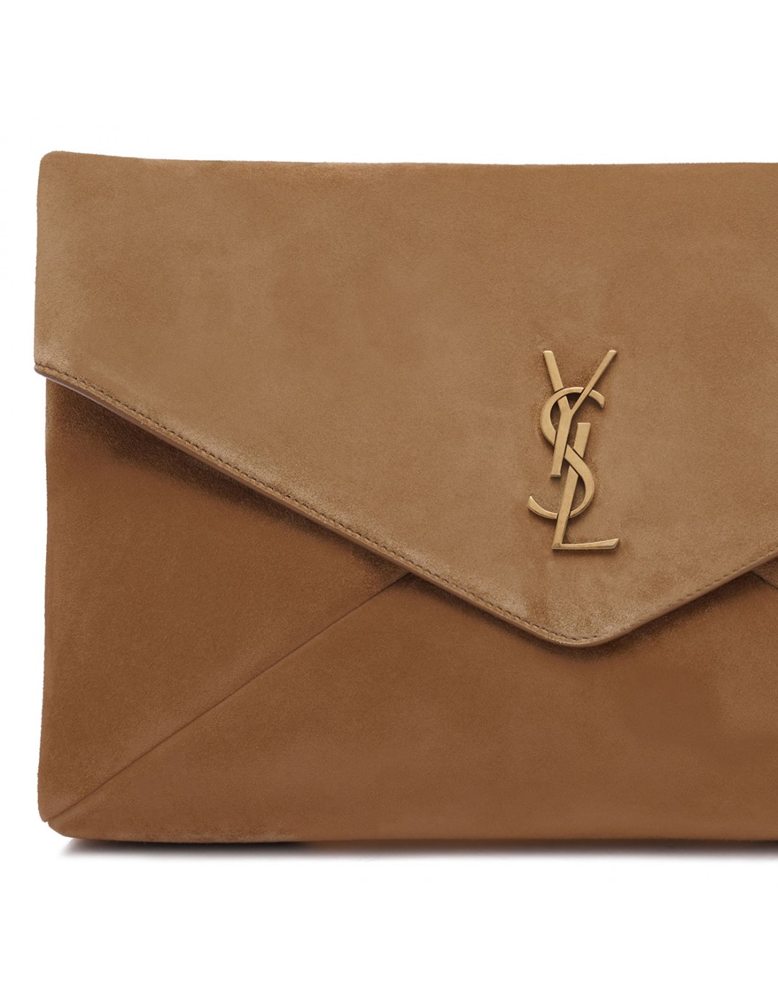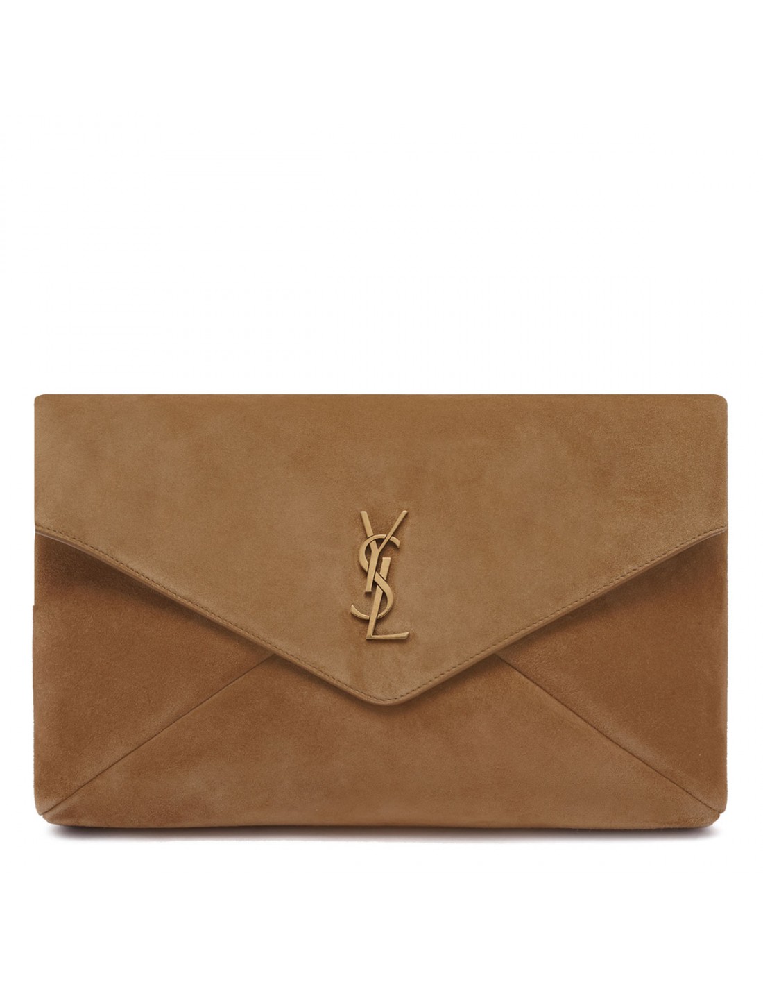 Golden leaf hue suede Cassandre envelope large pouch from Saint Laurent featuring Cassandre decoration, magnetic snap closure, bronze-tone hardware, leather lining.