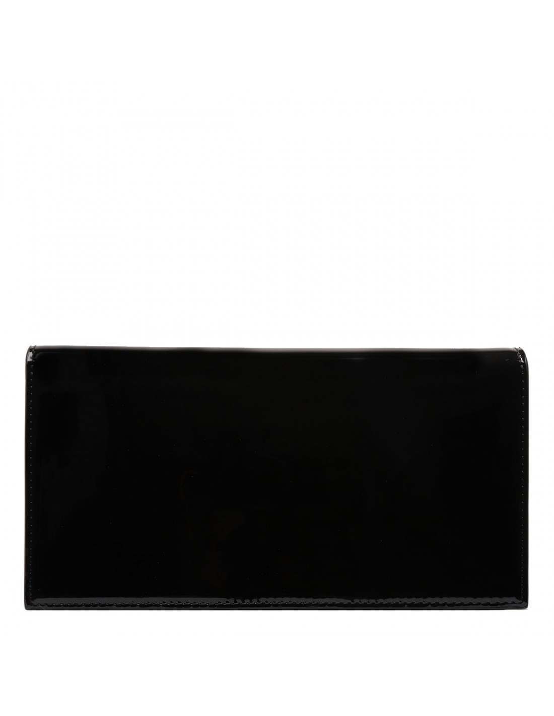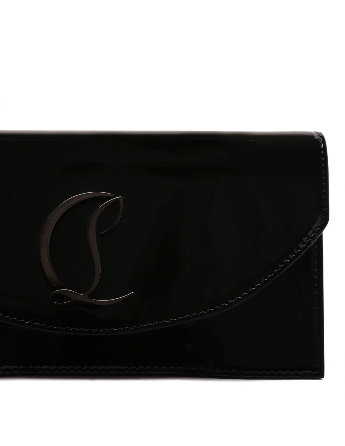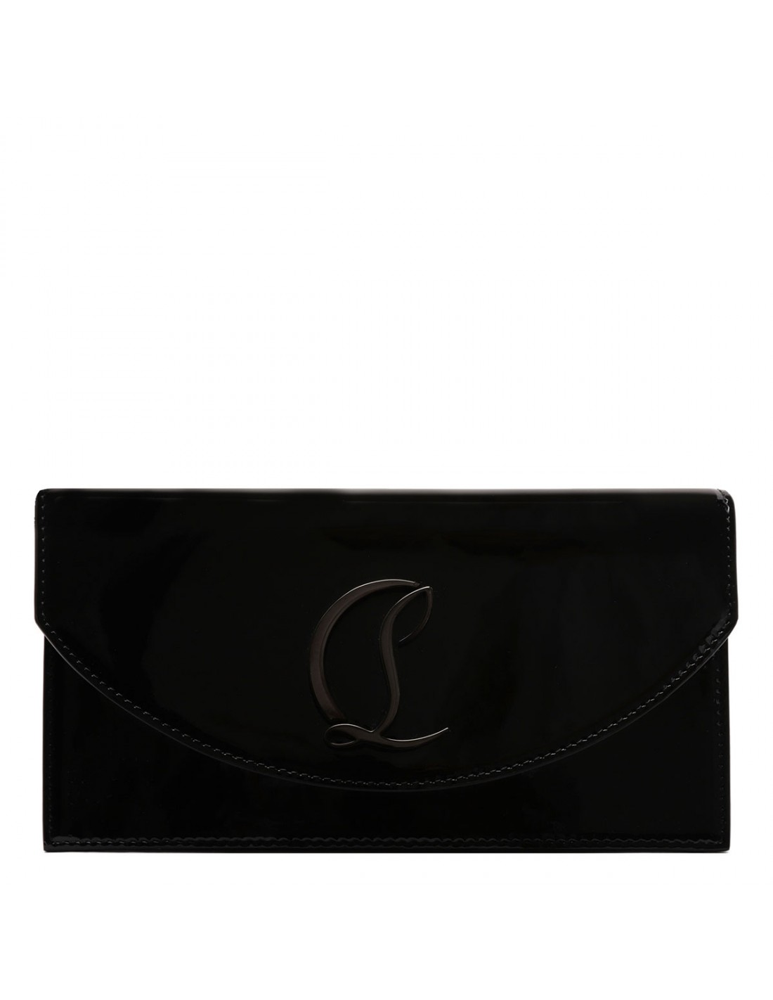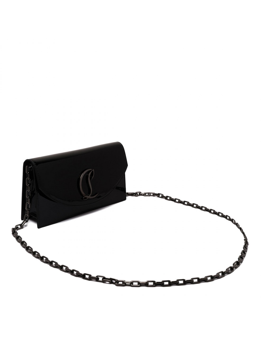 Black leather Loubi54 clutch from Christian Louboutin featuring tonal CL monogram on the front, detachable  chain strap, front flap with magnetic fastening, one interior pocket and three credit card slots.