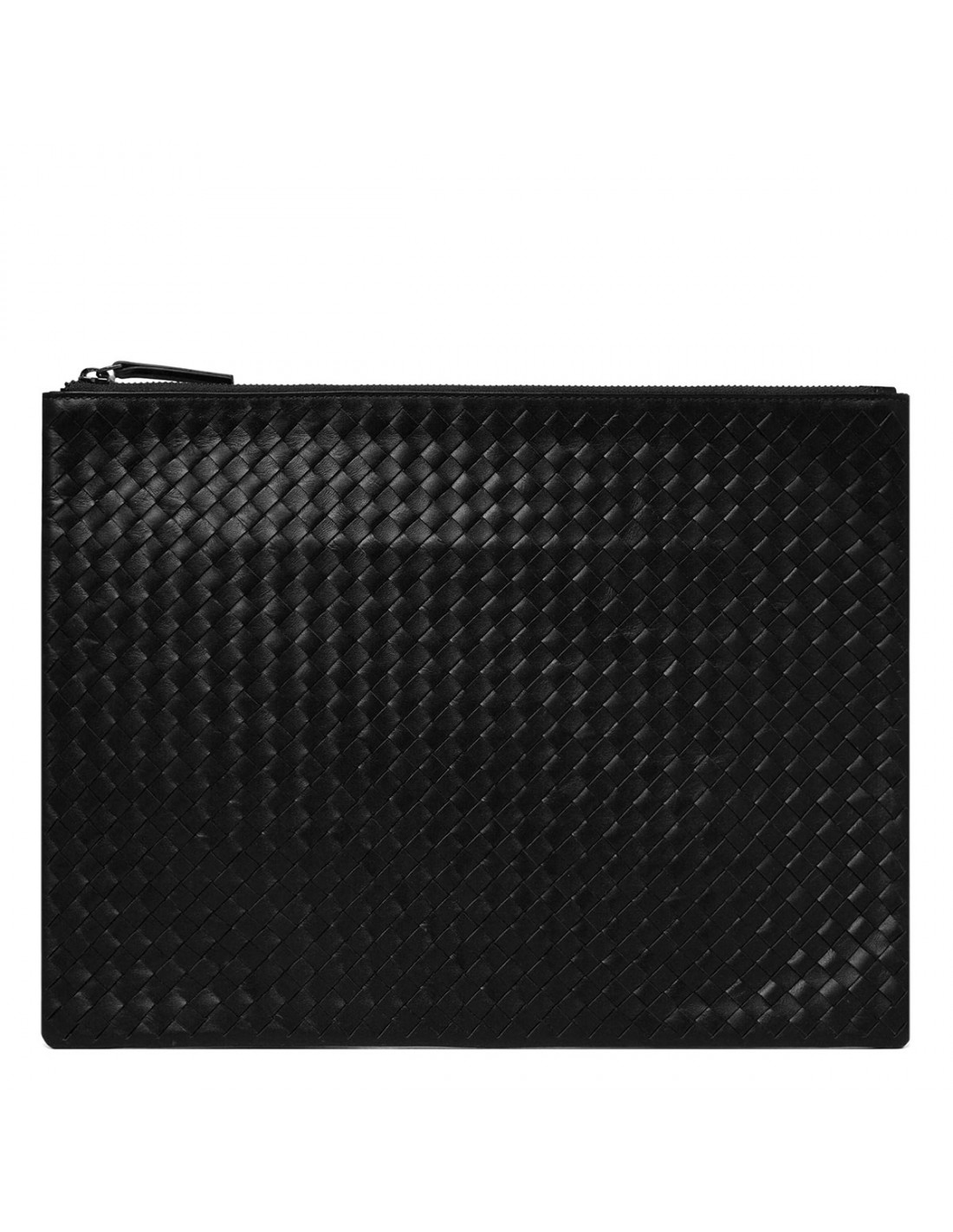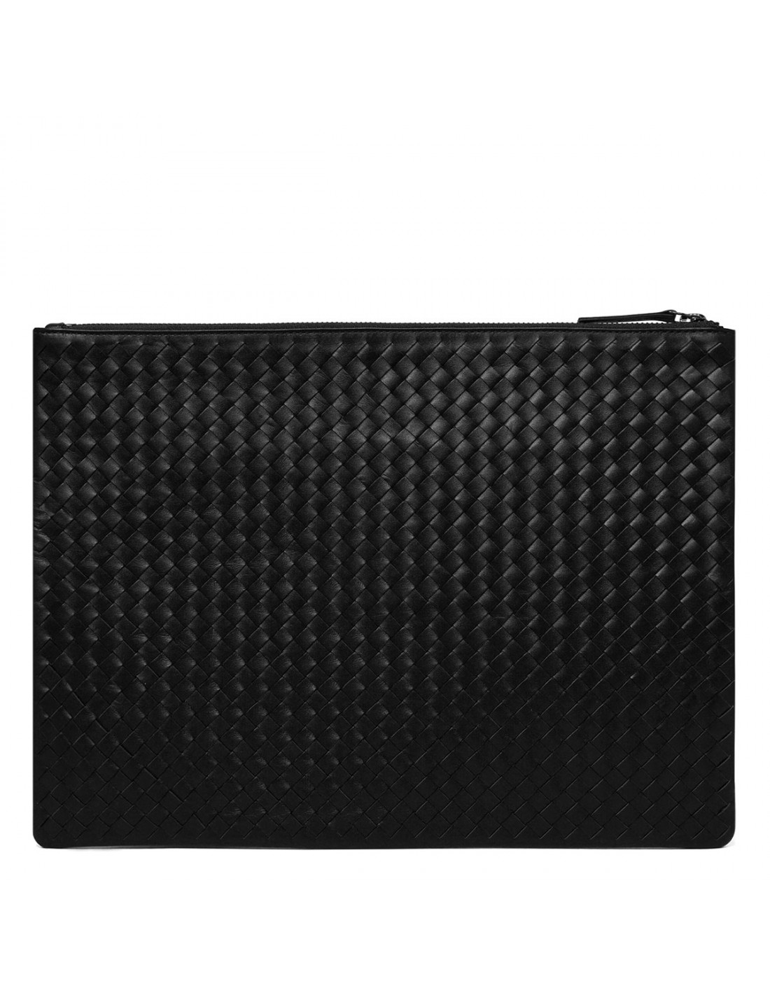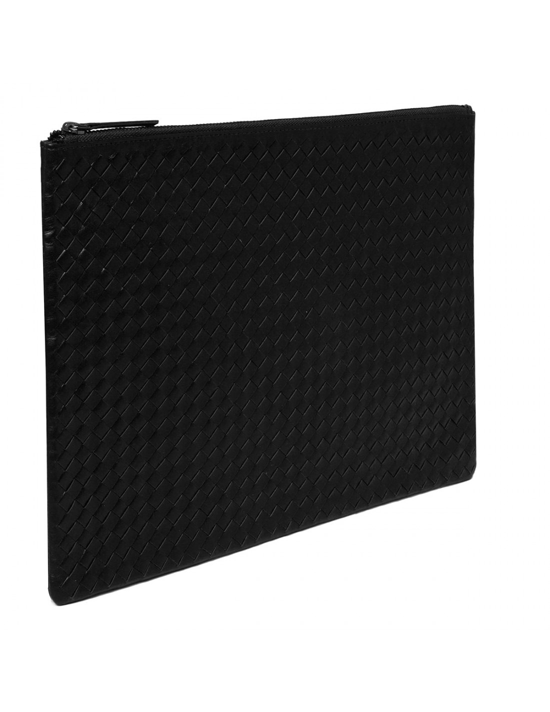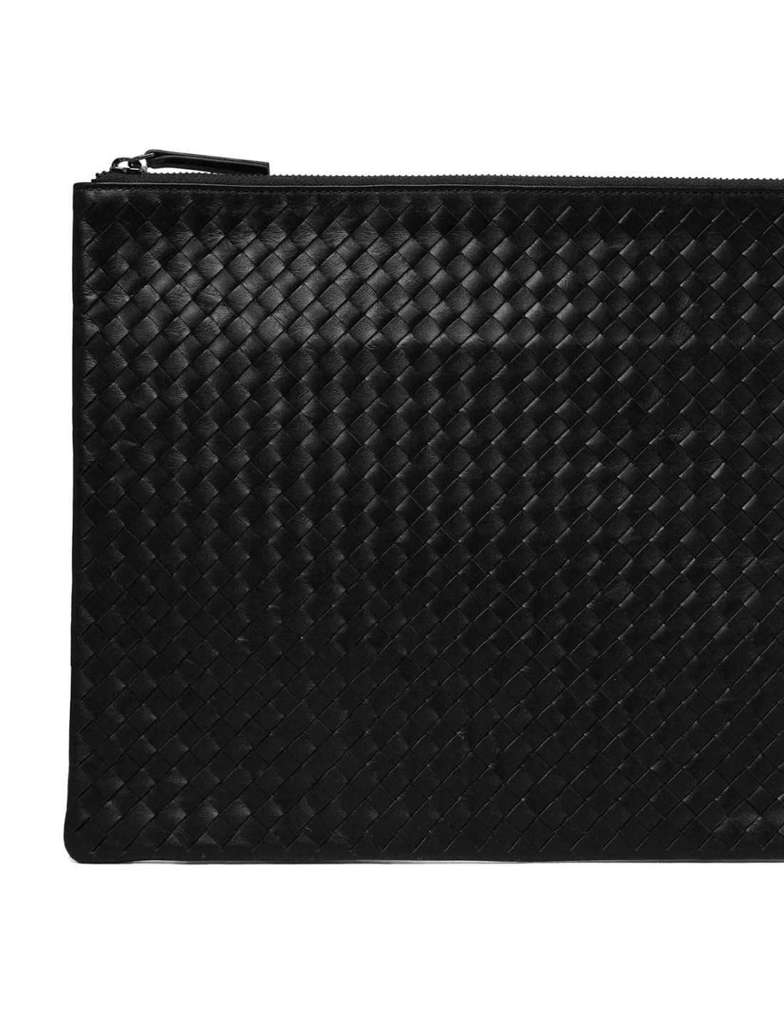 Black woven leather A4 pochette from Dragon Diffusion featuring classic weave, zip fastening along top, antiqued St. Christopher medal charm hand-sewn inside the bag.