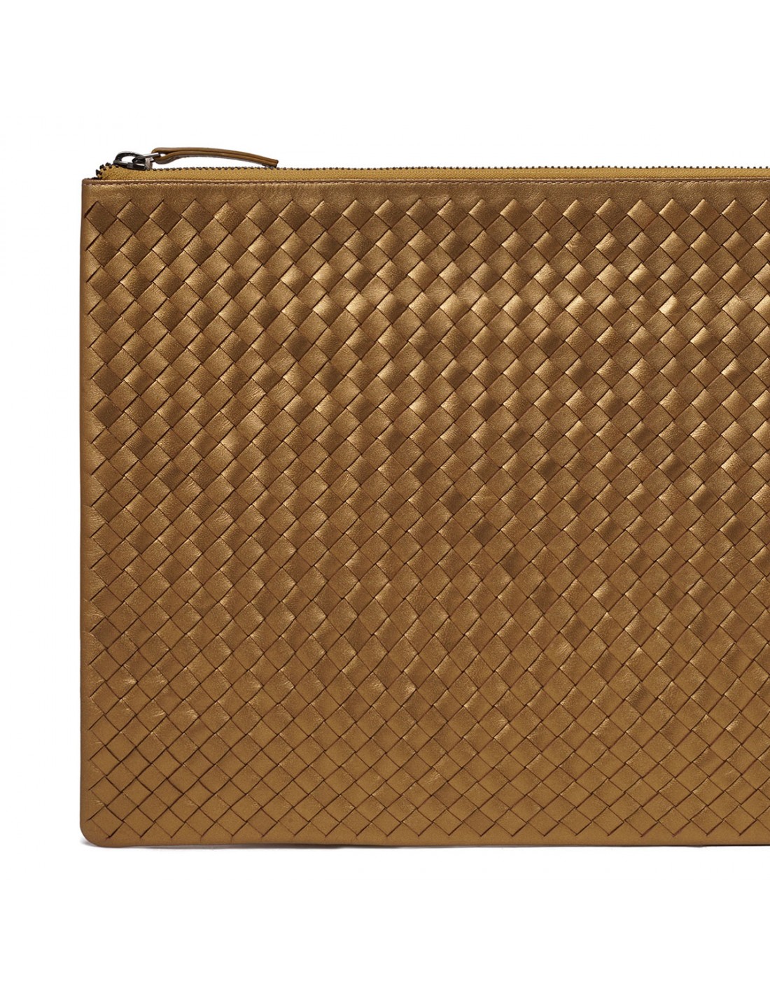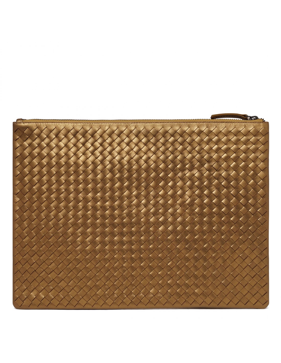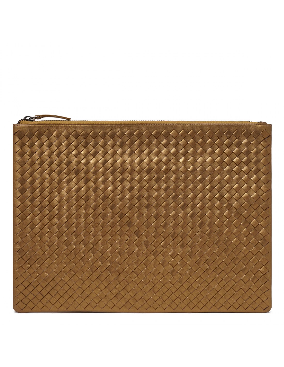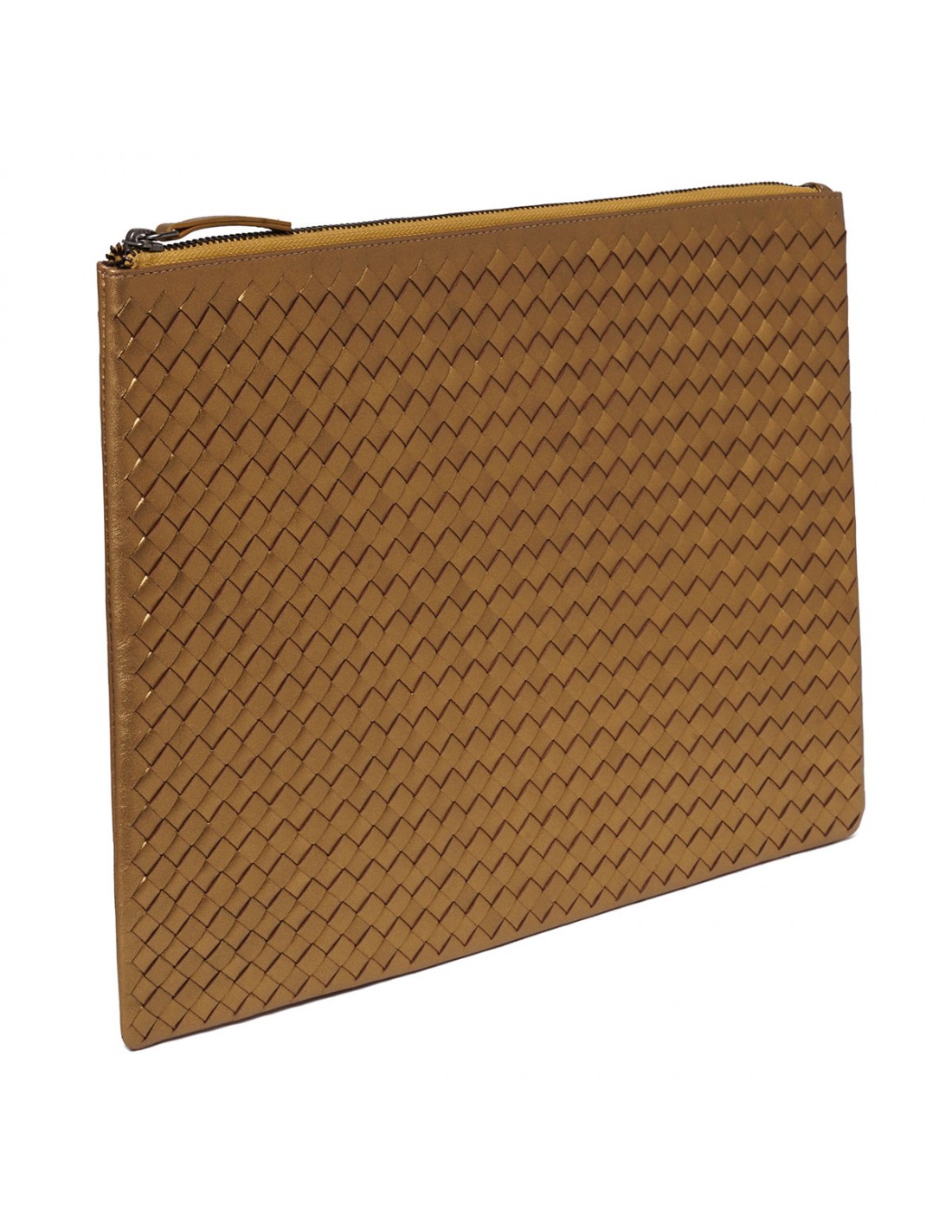 Gold woven leather A4 pochette from Dragon Diffusion featuring classic weave, zip fastening along top, antiqued St. Christopher medal charm hand-sewn inside the bag.