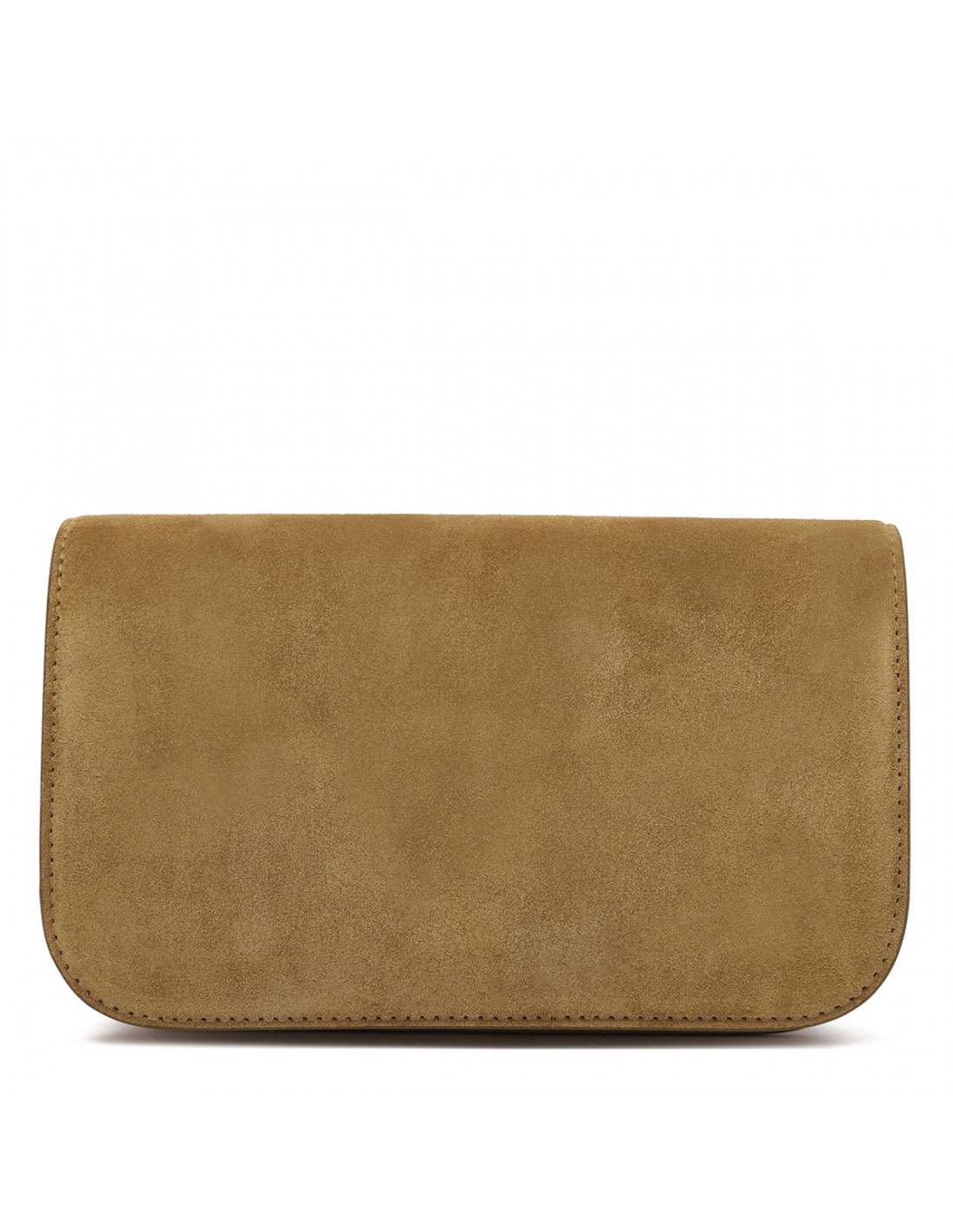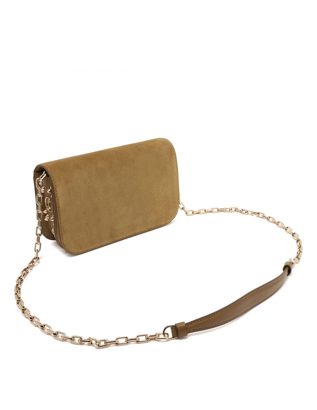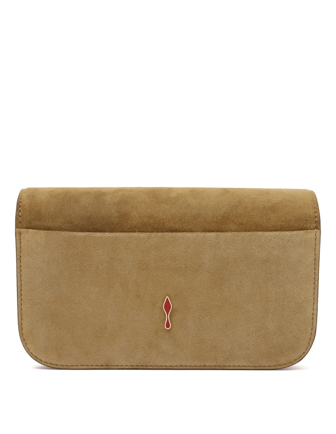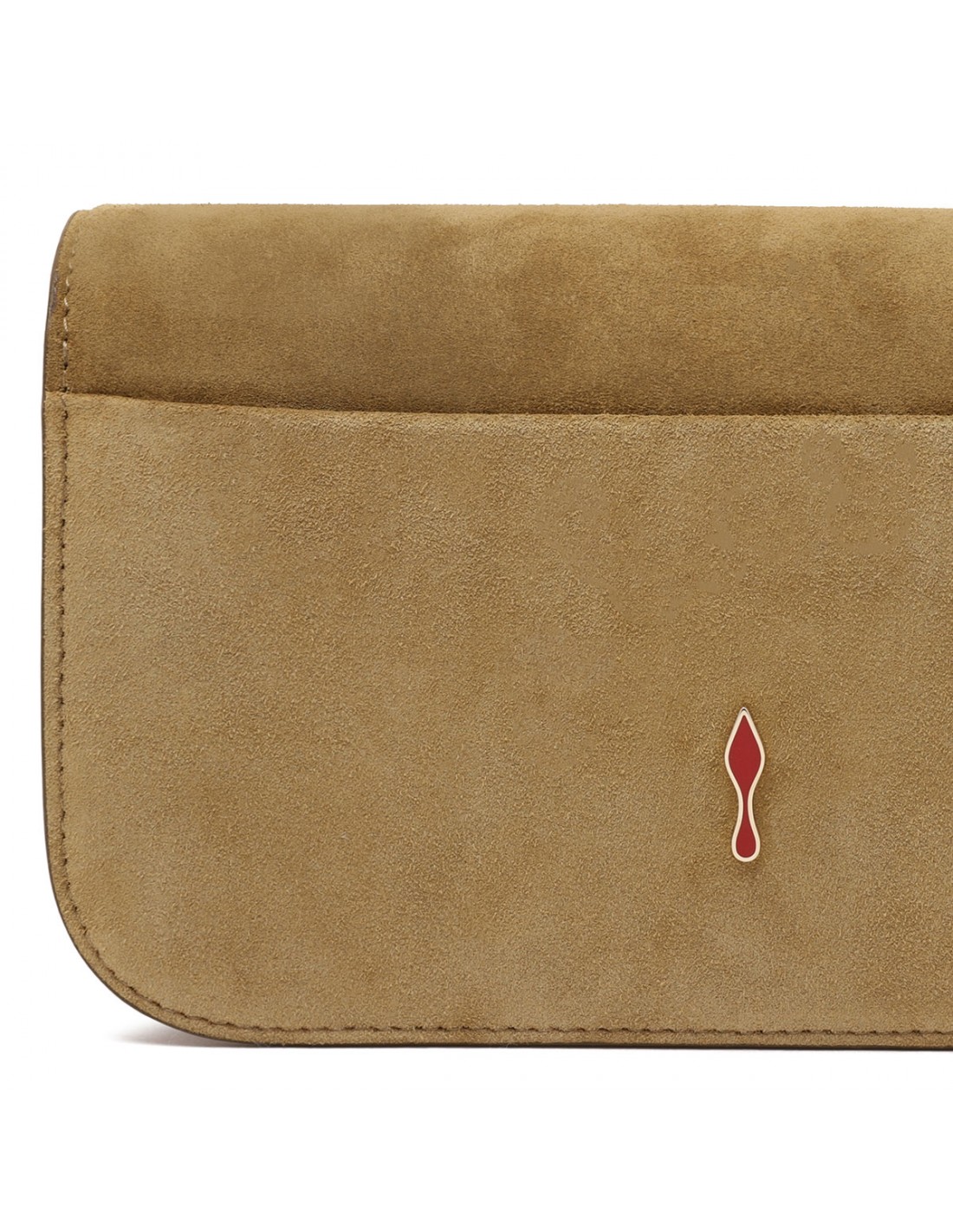 Bronze hue suede leather Paloma small clutch from Christian Louboutin featuring Loubinthesky spike on side, detachable leather-reinforced chain strap, front flap with magnetic fastening, three internal pockets and ten credit card slots.