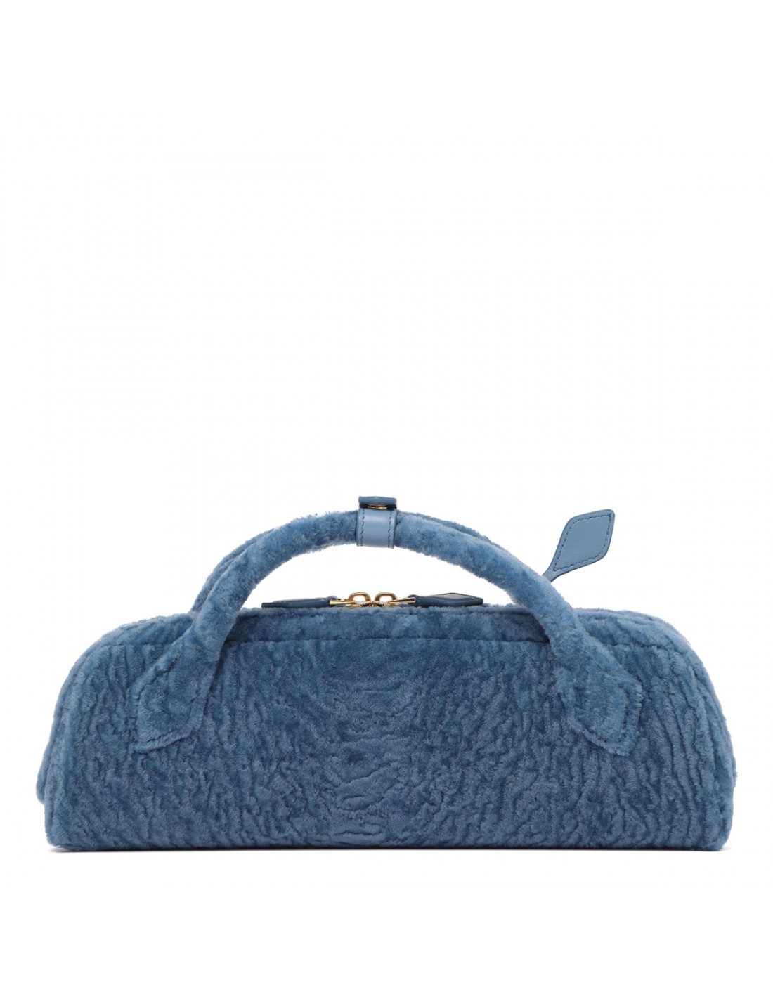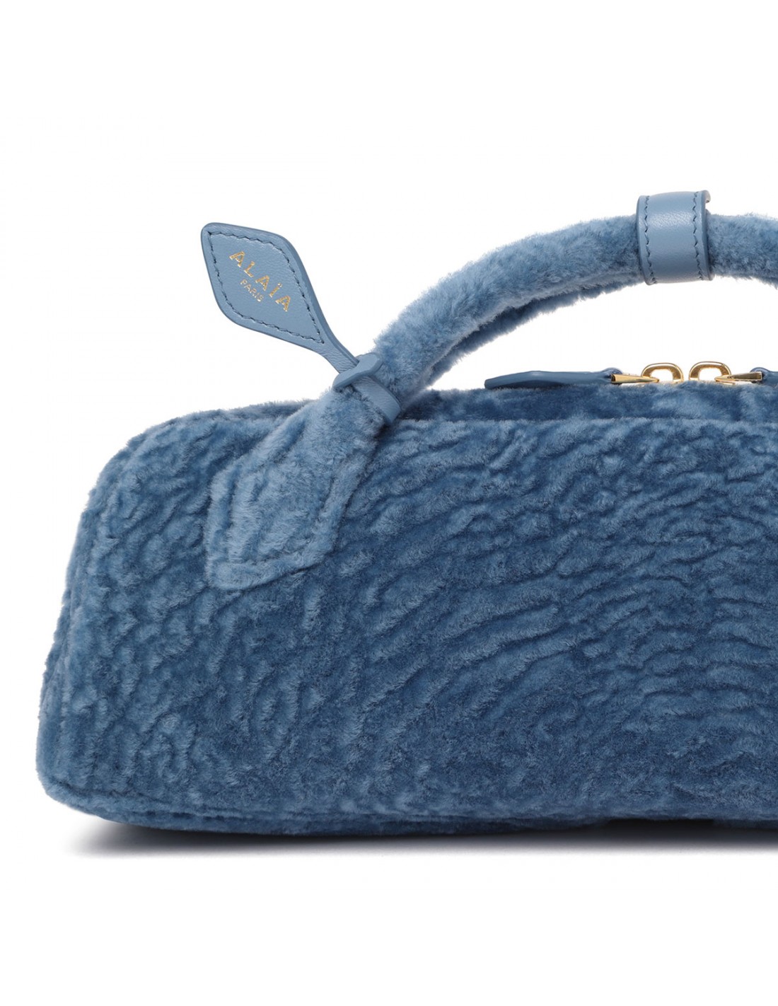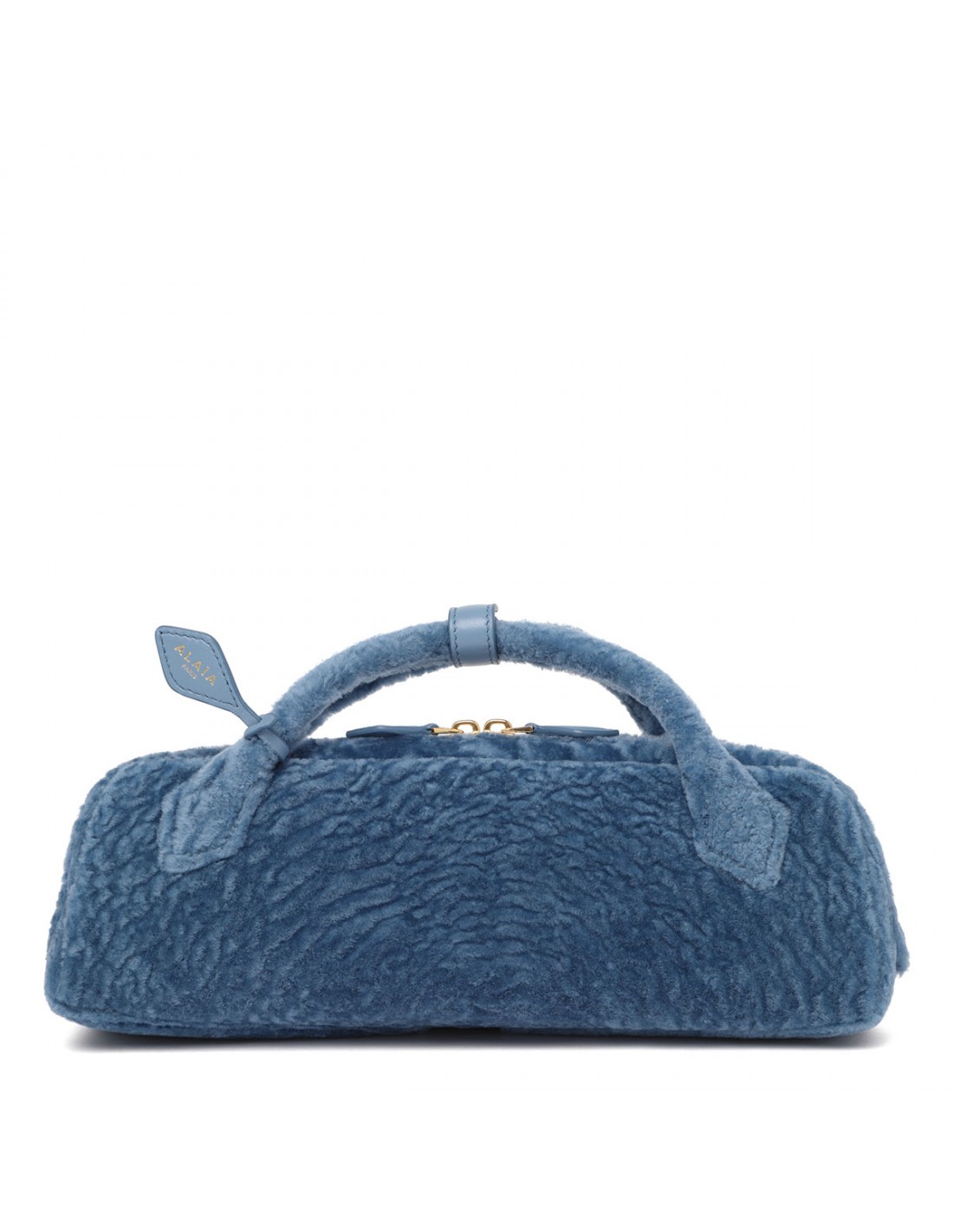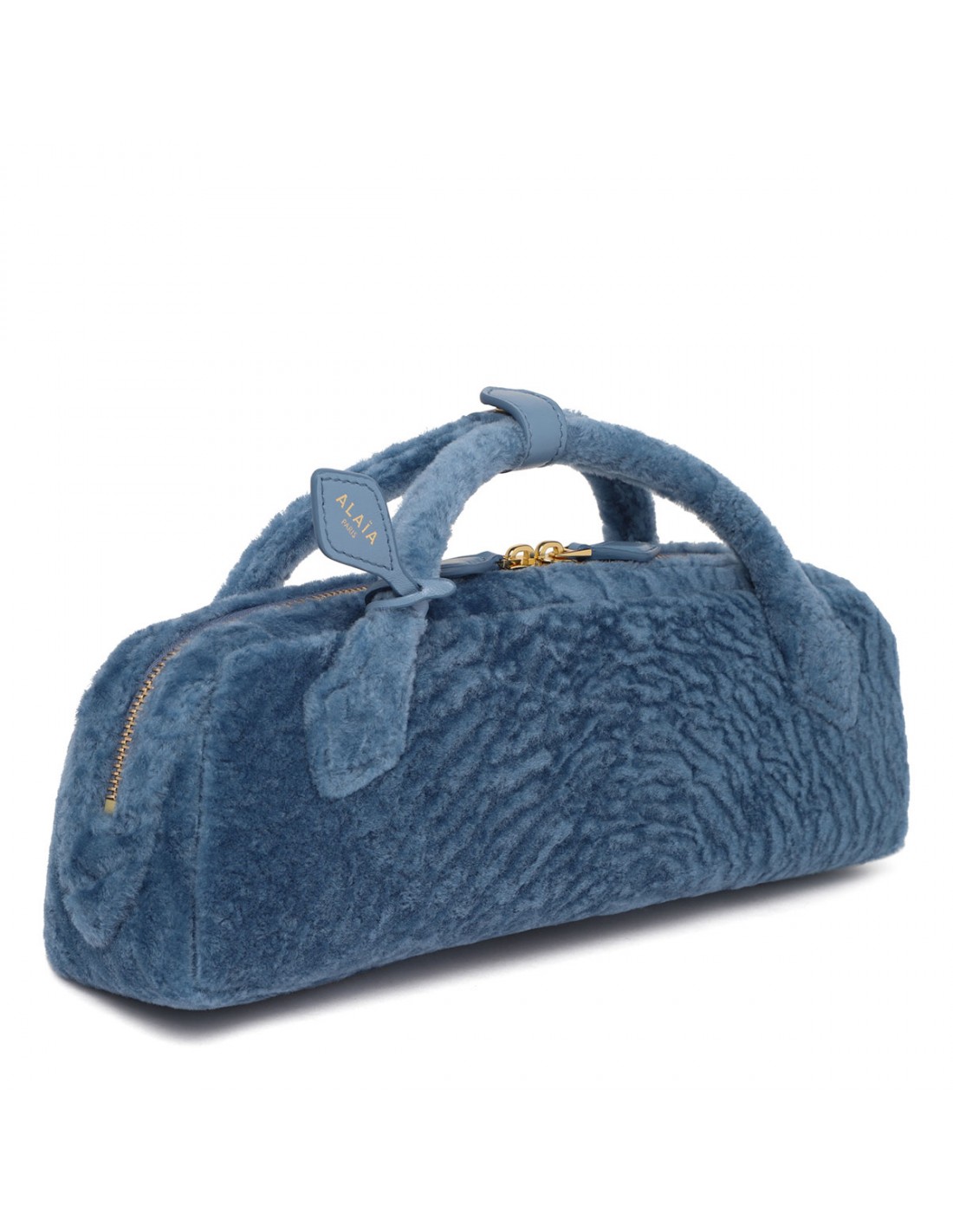 Blue vintage shaved shearling Le Teckel clutch bag from Alaia featuring elongated shape, tubular short handles with decorative ties, double zip fastening, small detachable mirror on internal pocket.