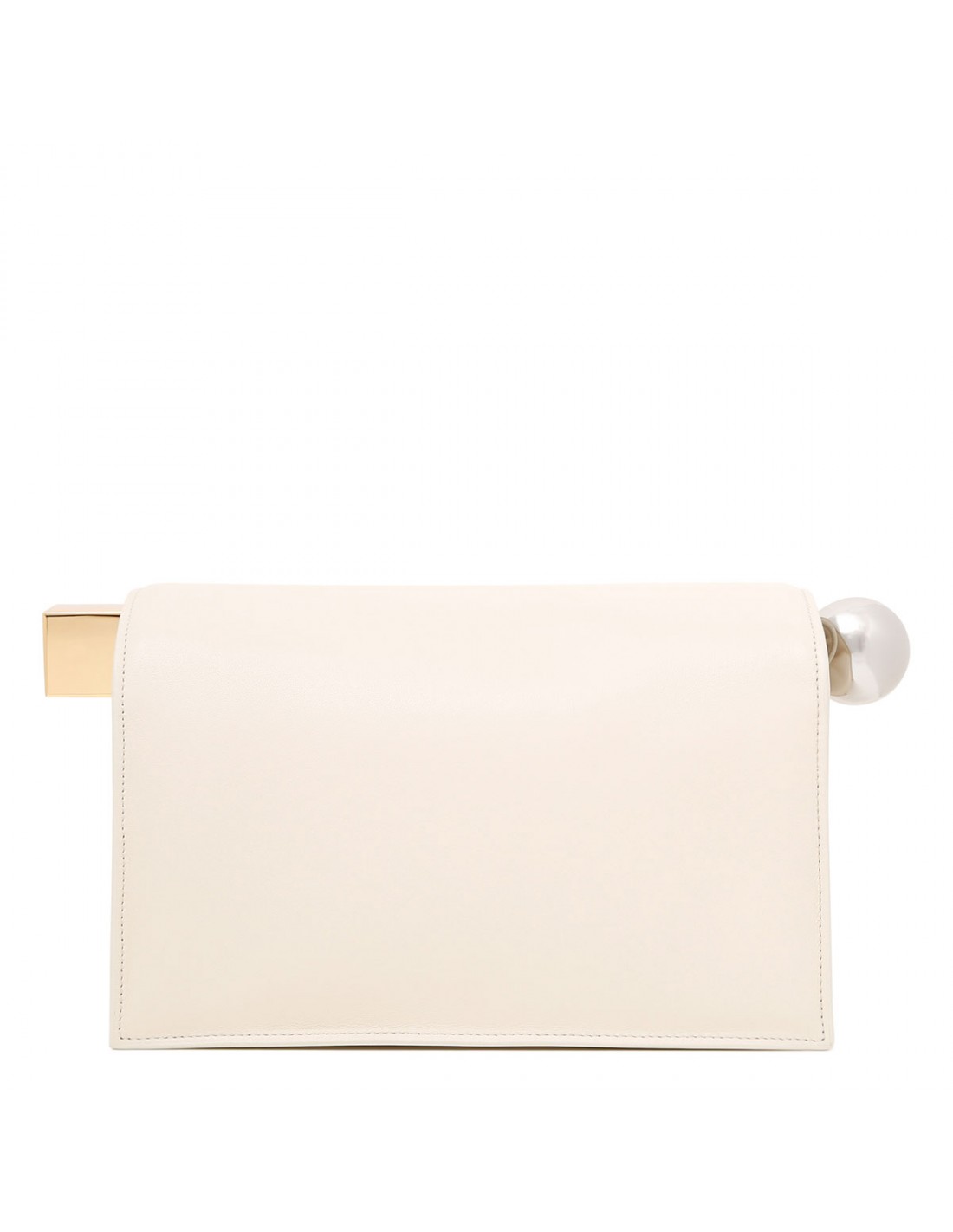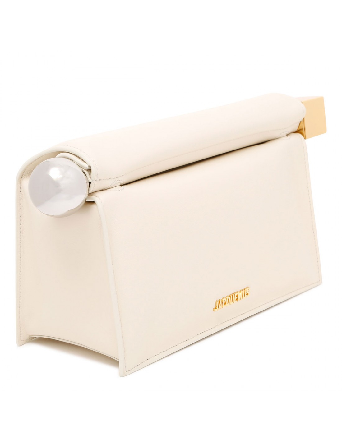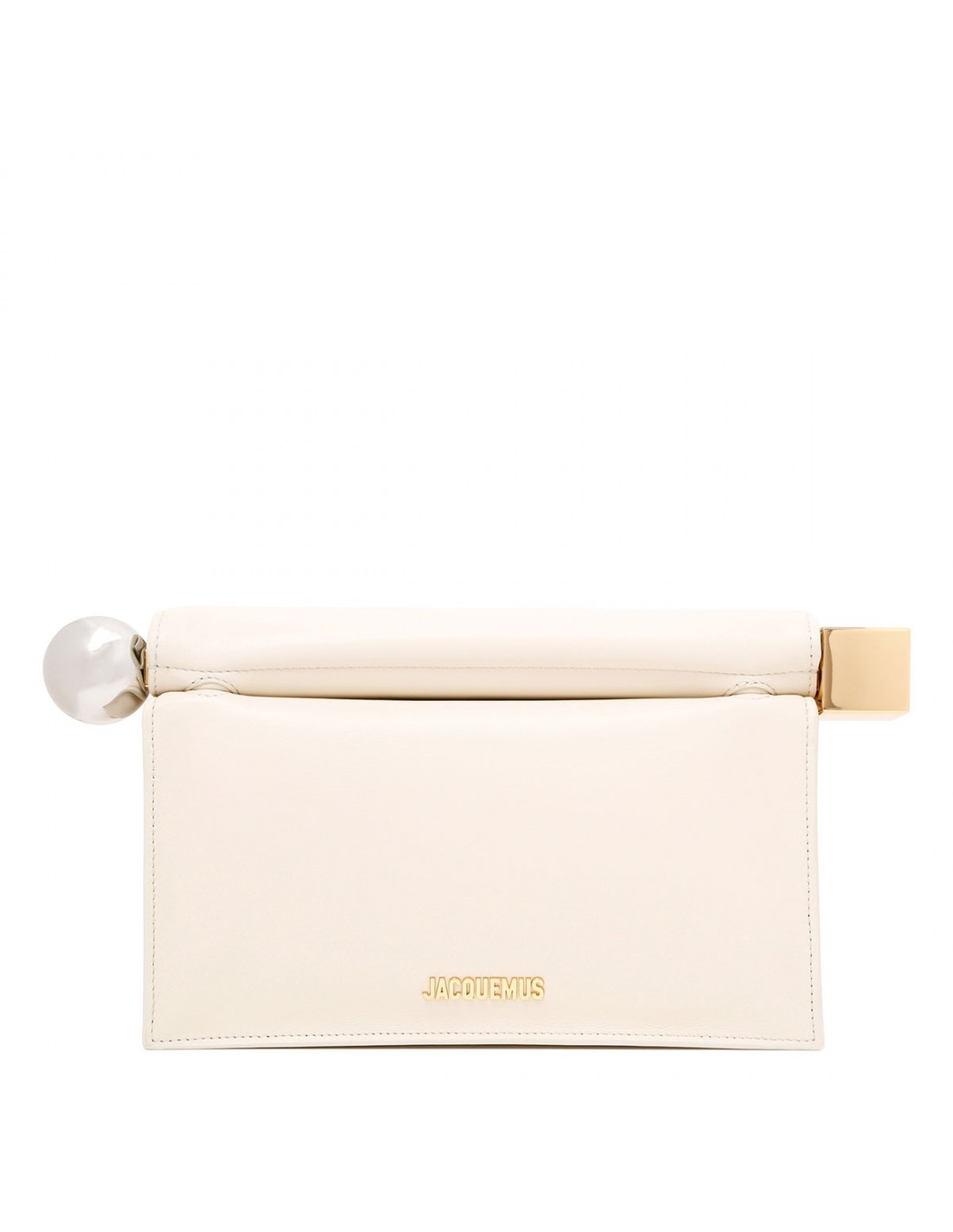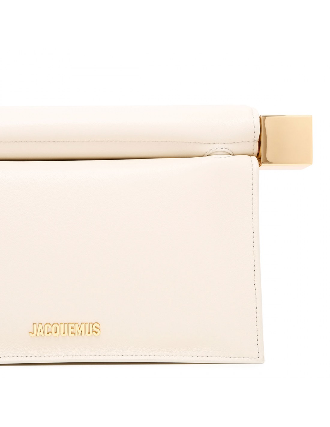 Light ivory nappa leather The Rond Carré folded clutch from Jacquemus featuring large silver metal circle and gold square closure endings, magnetic fastening, gold metal logo and hardware, cotton lining, internal card pocket. Rolls open to access interior.