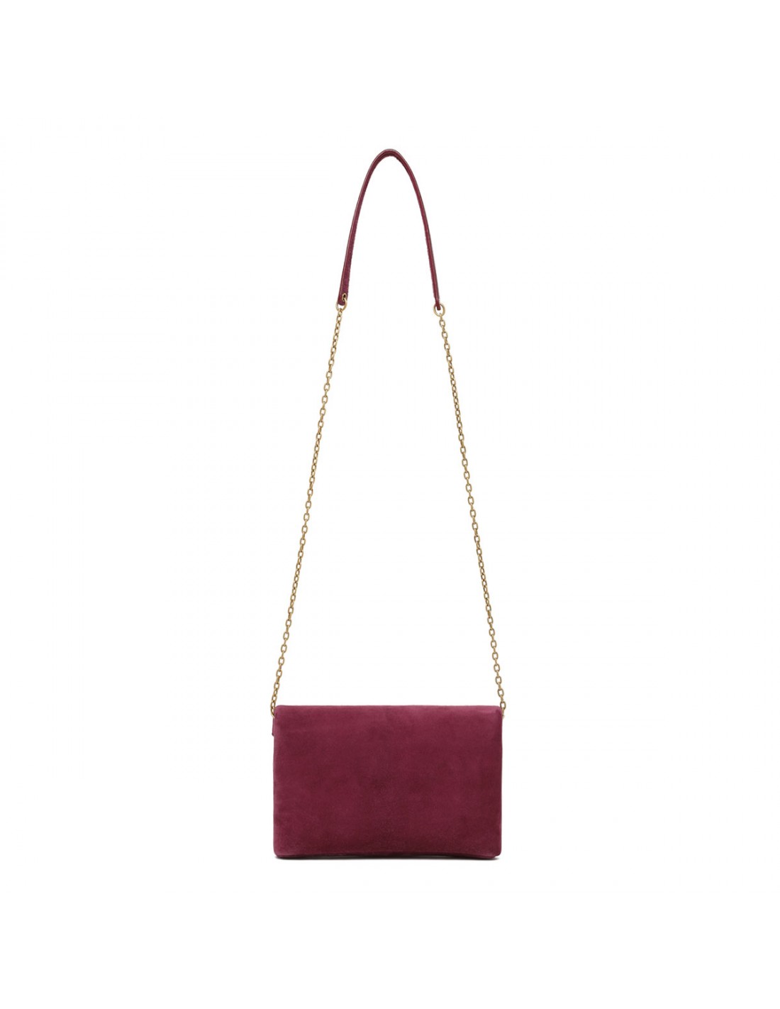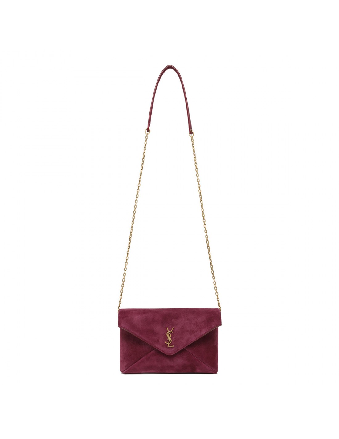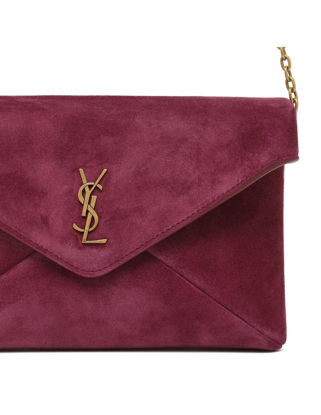 Deep fuchsia suede Cassandre small chain pouch from Saint Laurent featuring Cassandre decoration, stowable cable-chain strap, magnetic closure, bronze-tone hardware, leather lining and one card slot.