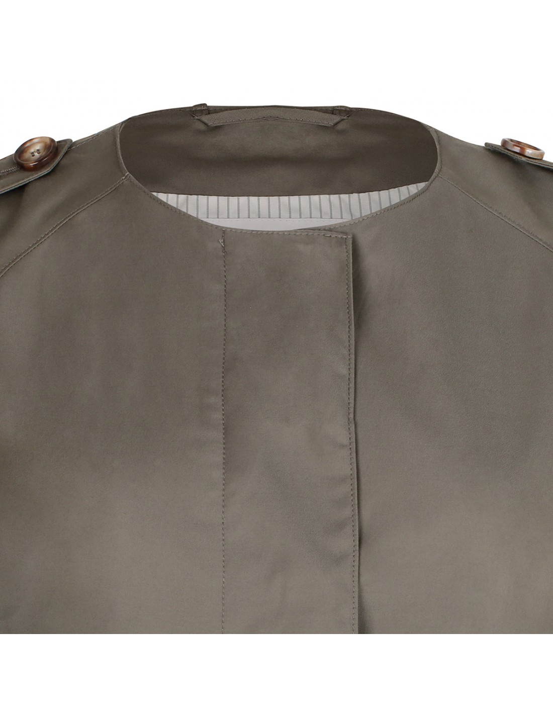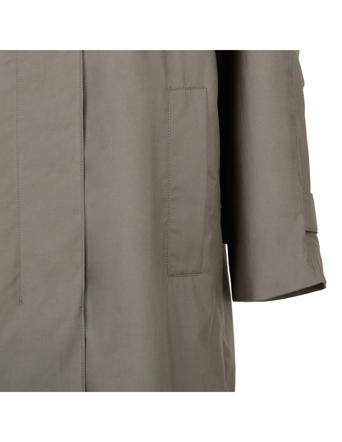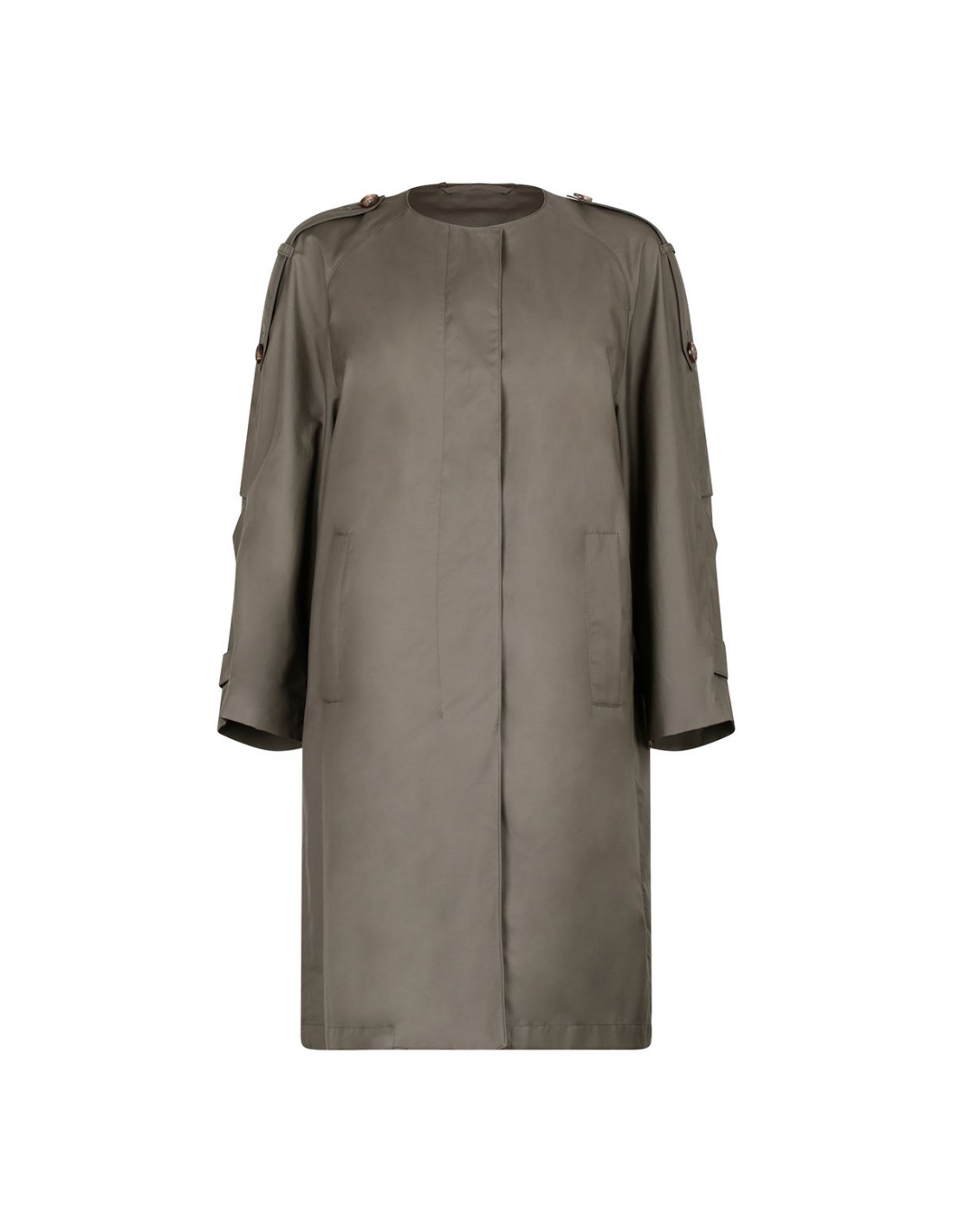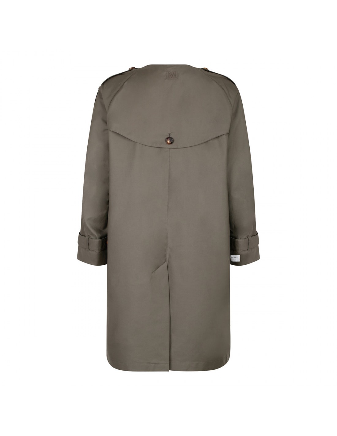 Clay hue water-repellent cotton Jasmine midi trench coat from Max Mara The Cube featuring  crew neck, adjustable tab at cuffs, long raglan sleeves, side pockets, shoulder epaulettes, back vent, logoed rain cape detail on back, single-breasted silhouette, concealed button closure. Half-lined in taffeta fabric.