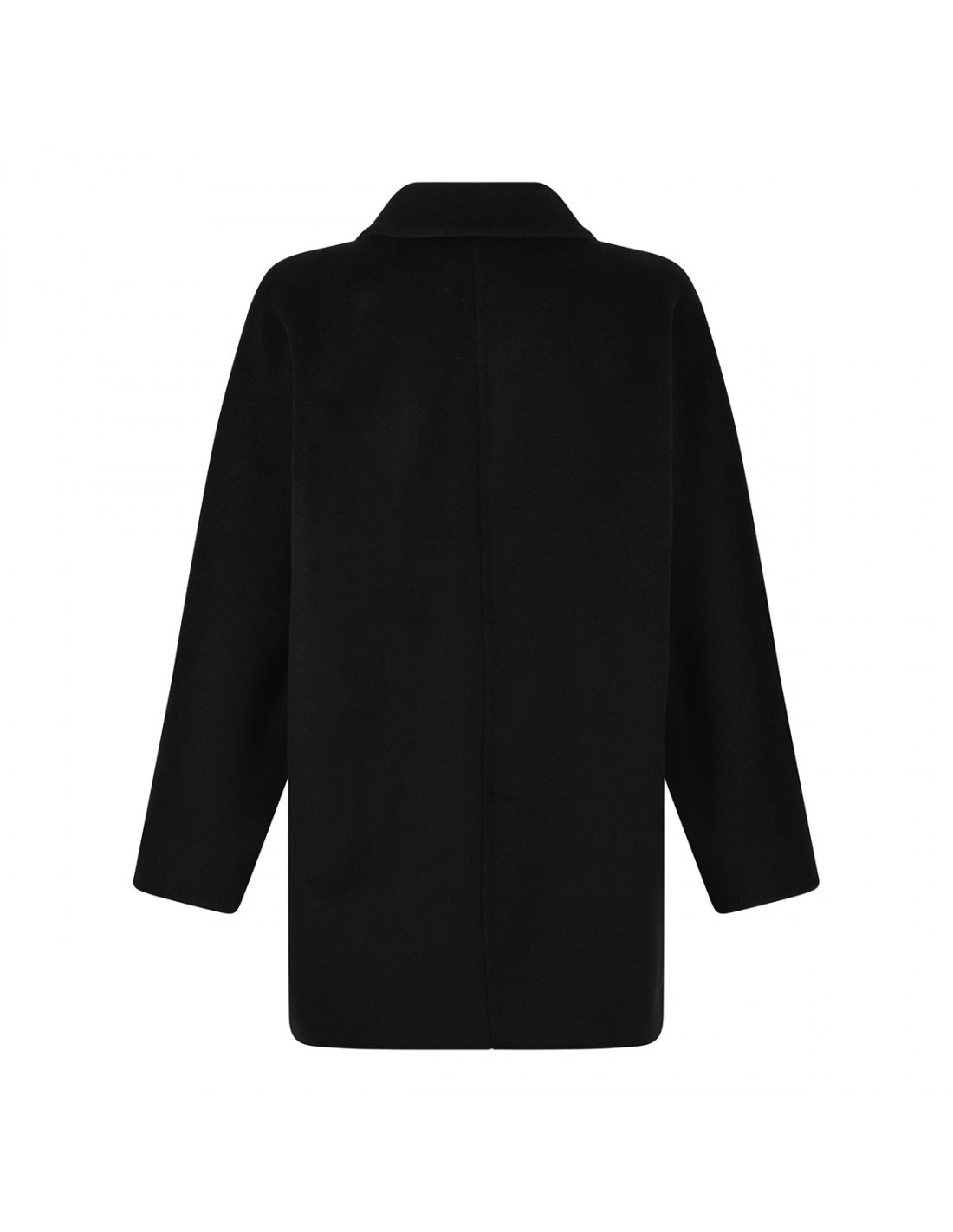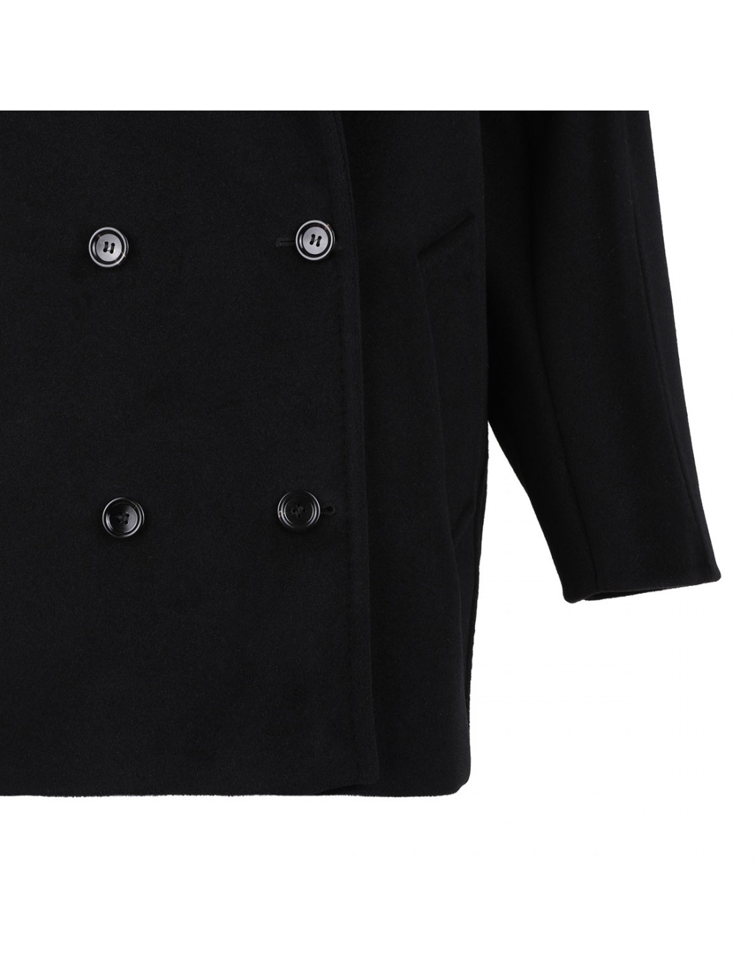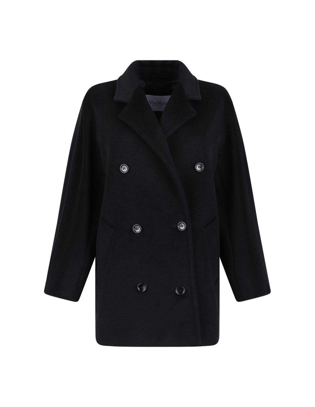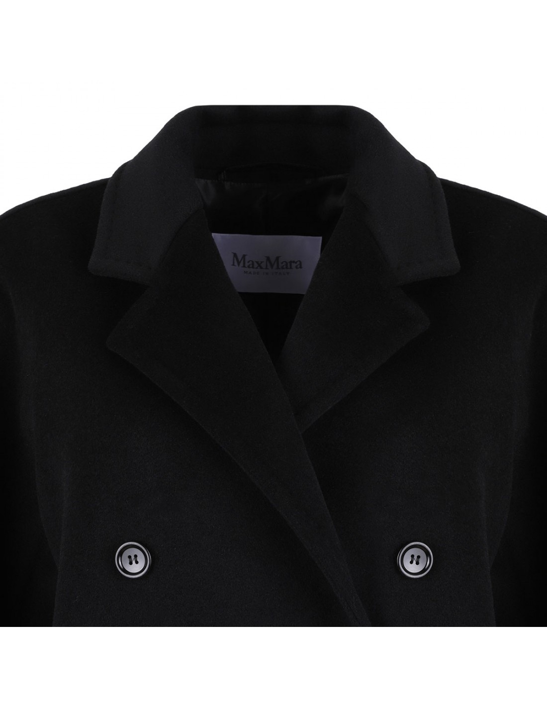 Black wool and cashmere blend Rebus 101801 short Icon coat from Max Mara featuring above-the-knee length, pick stitch, oversize fit, lapel collar, long roll-back kimono sleeves, double-breasted silhouette, button fastening, side pockets.