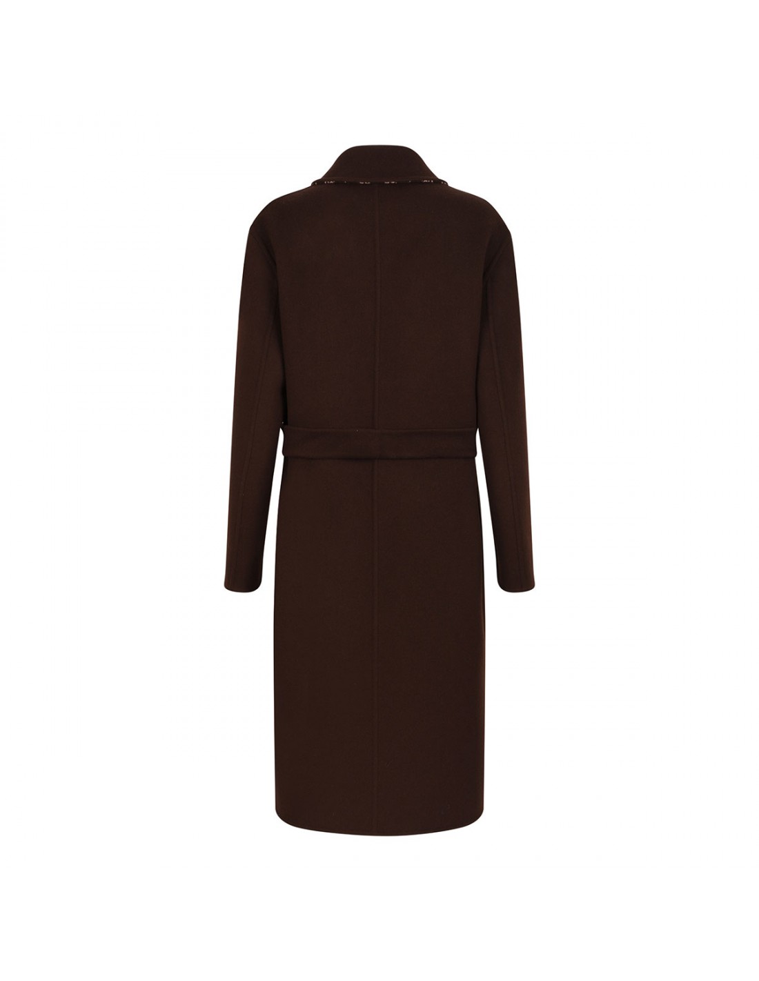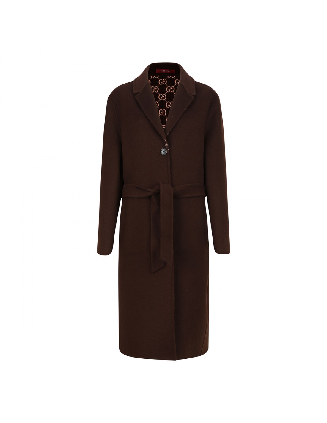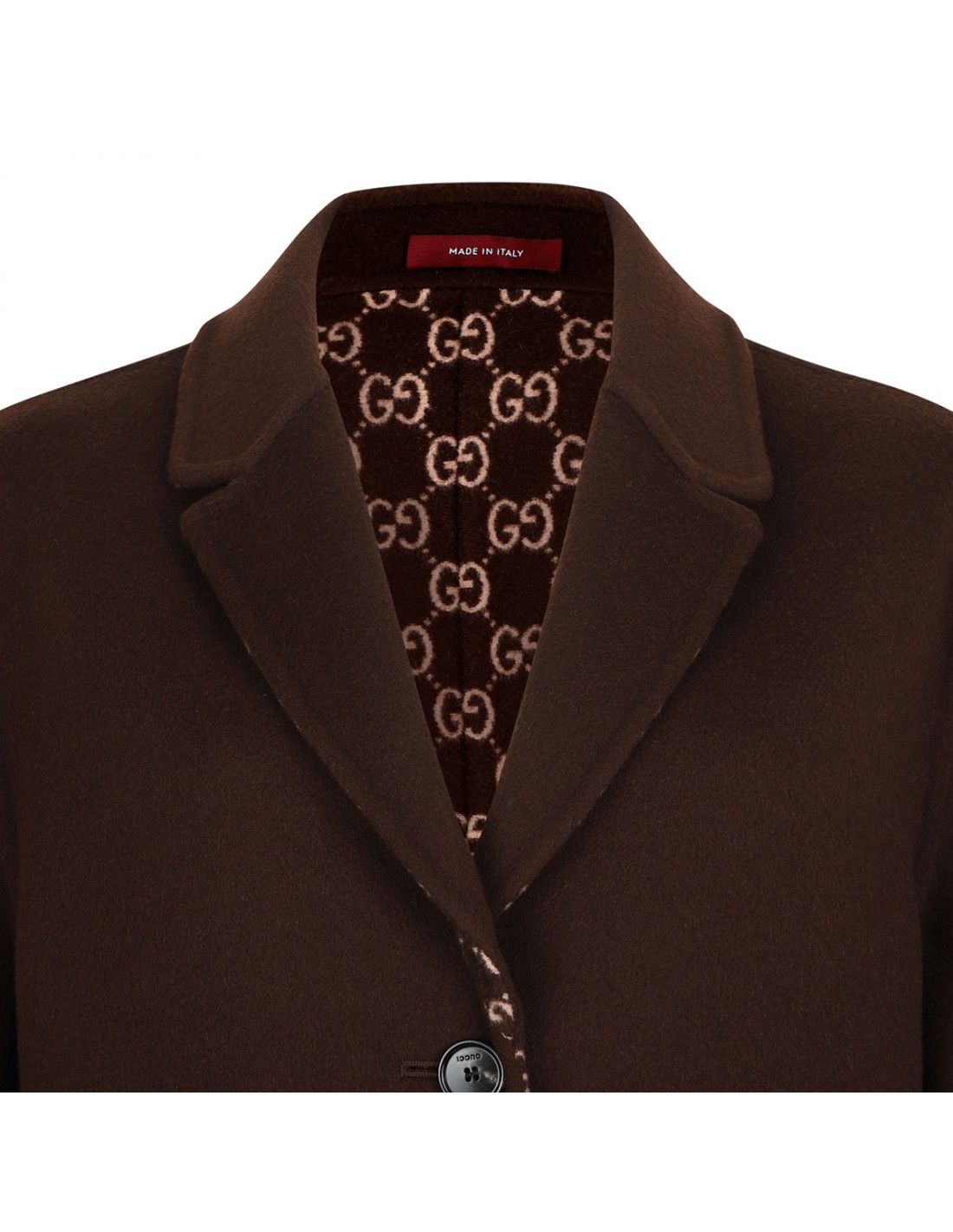 Reversible coat from Gucci featuring brown silk wool on one side, brown and light pink GG silk wool on other side, notch lapel, two side pockets, button fastening on front. Unlined.