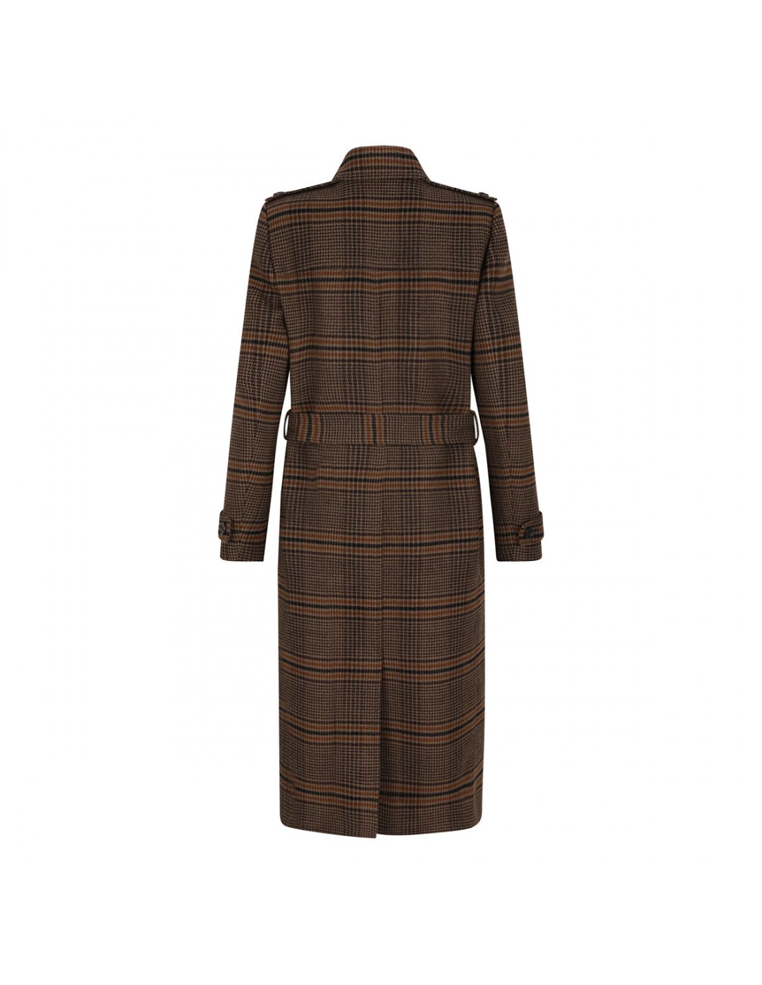 Brown, beige and red wool long coat from Saint Laurent featuring Prince of Wales motif, pointed collar, buttoned shoulders epaulets, buttoned tab cuffs, front button closure, front buttoned flap pockets, padded shoulders, vent at back and silk lining.