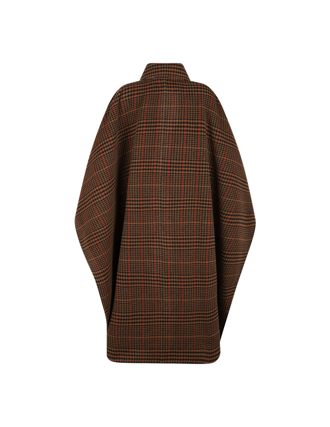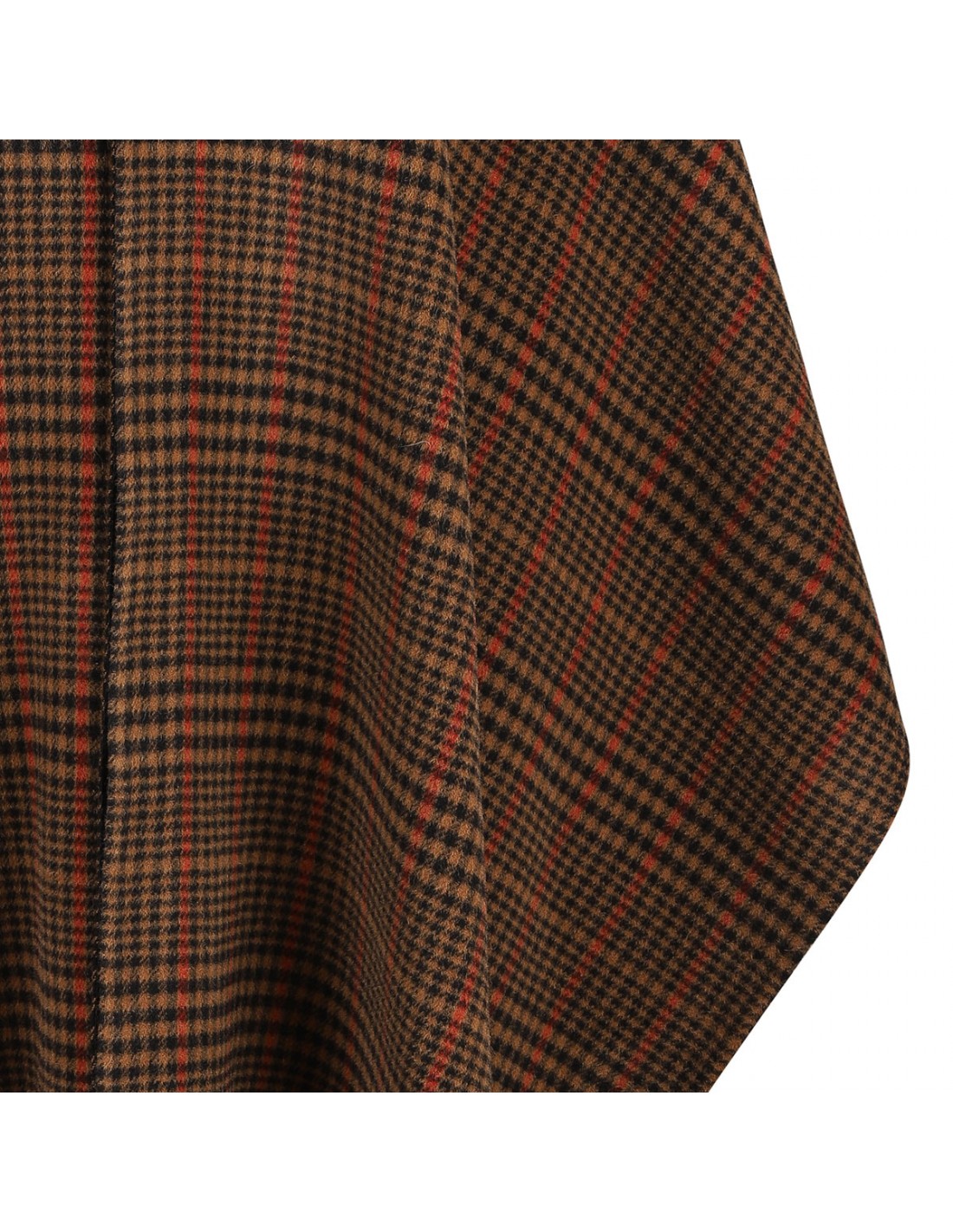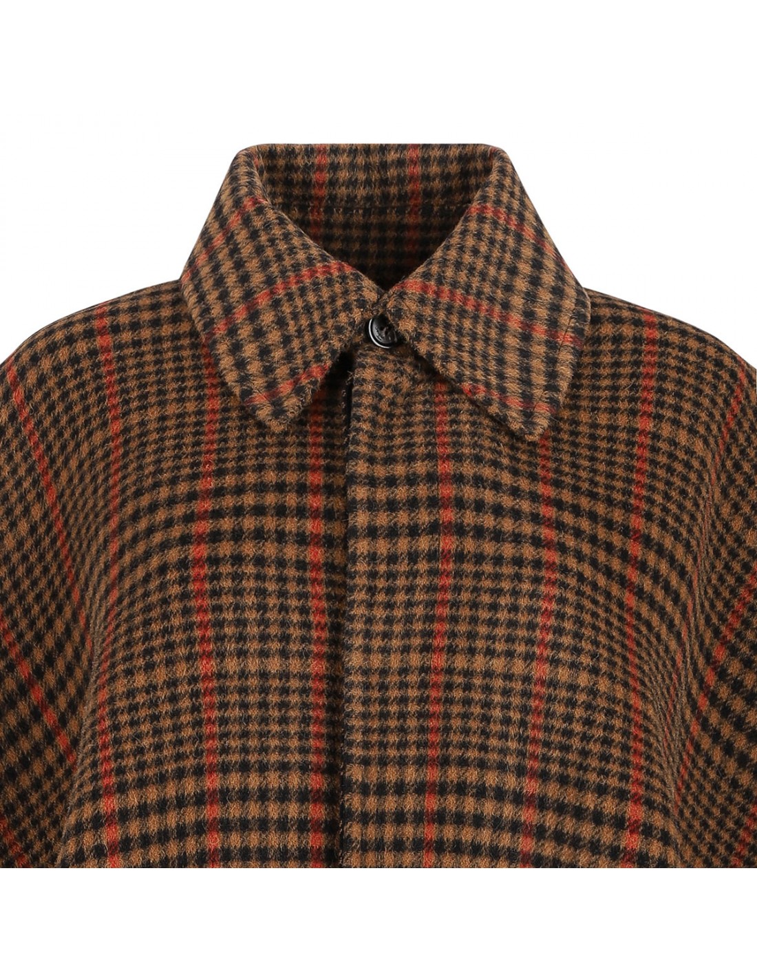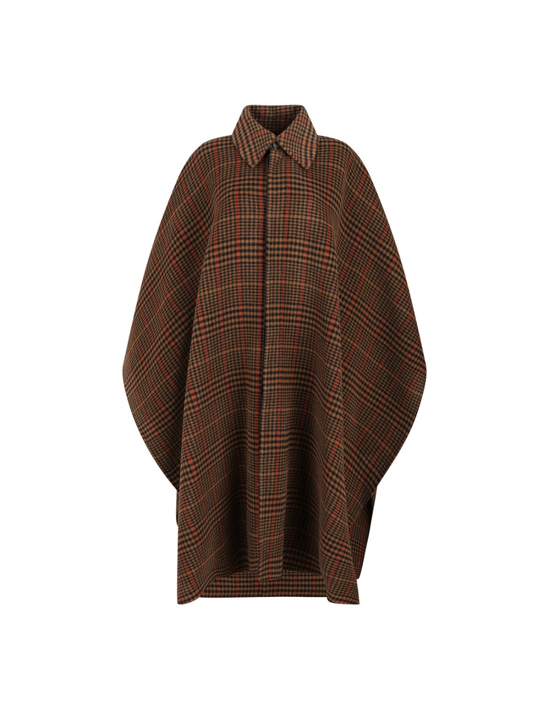 Caramel, black and red brushed wool and llama double-face cape from Saint Laurent featuring plaid motif, pointed collar, cape sleeves and concealed front button closure.