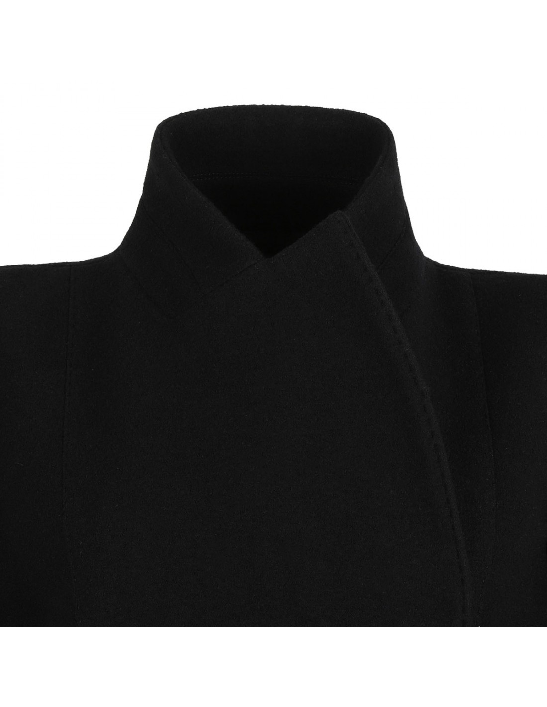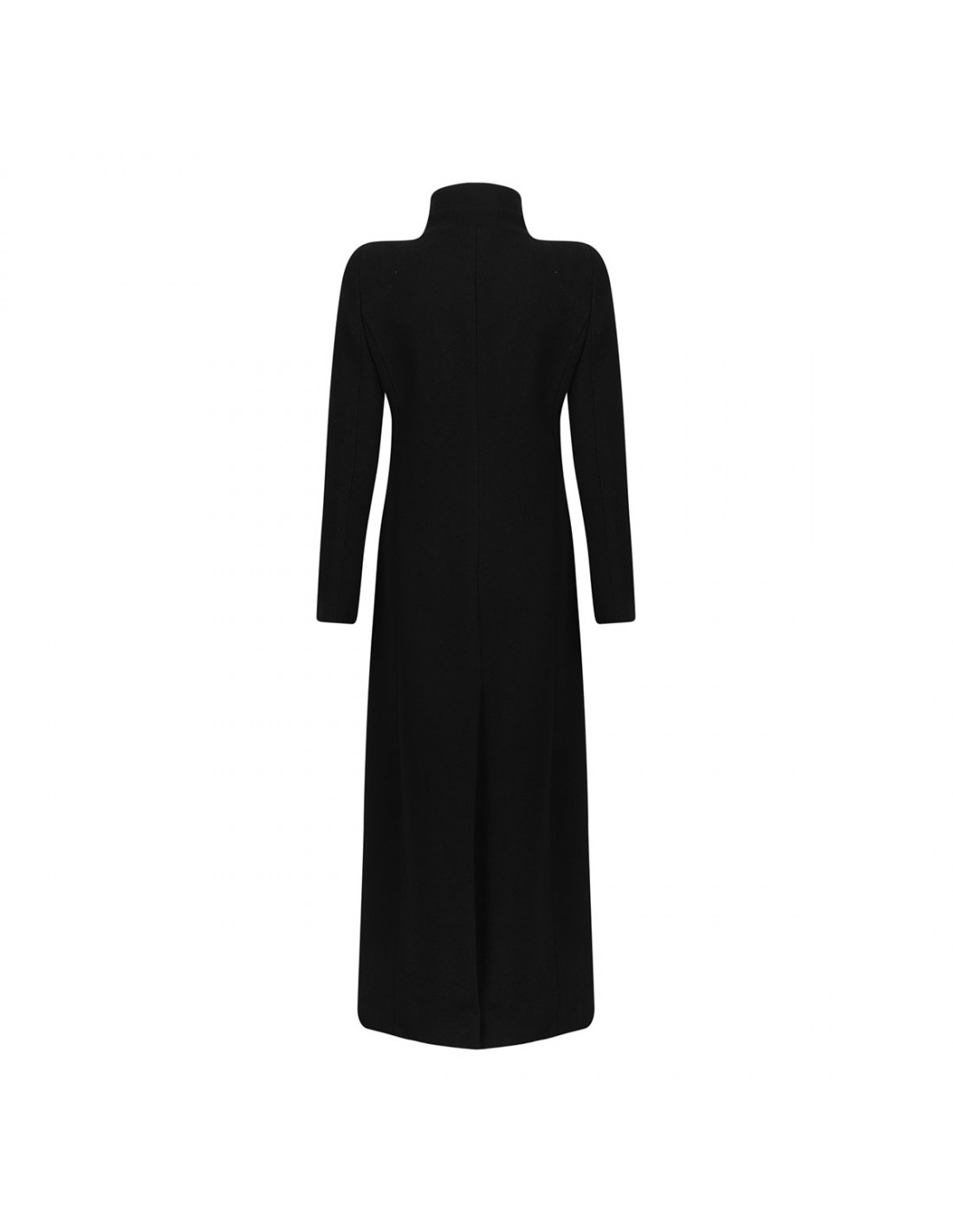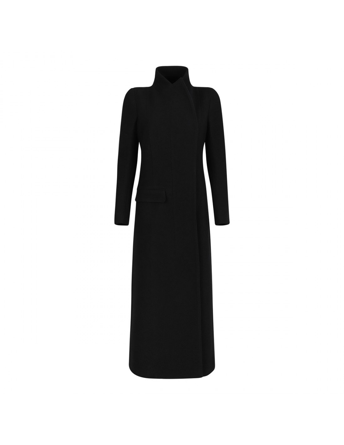 Black virgin wool long coat from Tom Ford featuring high protective collar, concealed asymmetric fastening, side flap pockets.