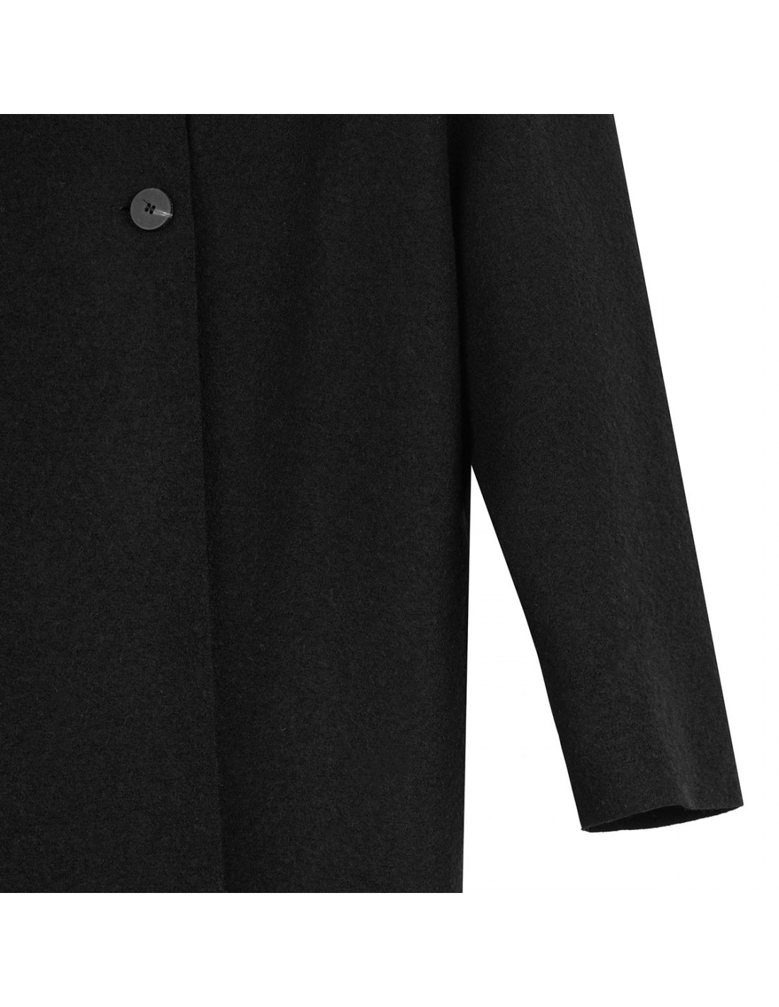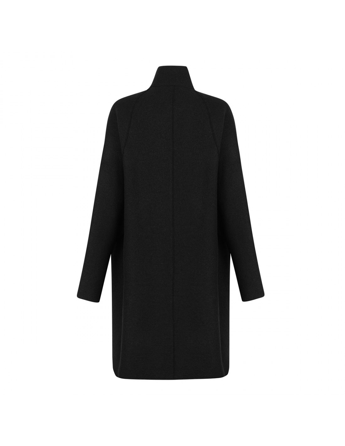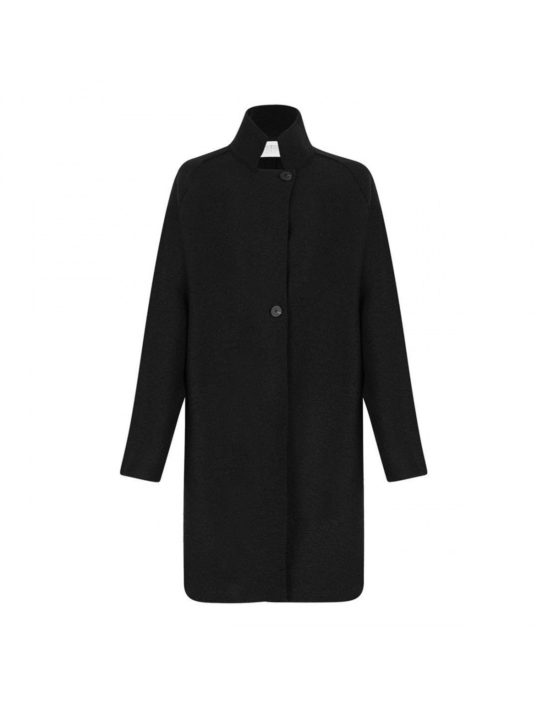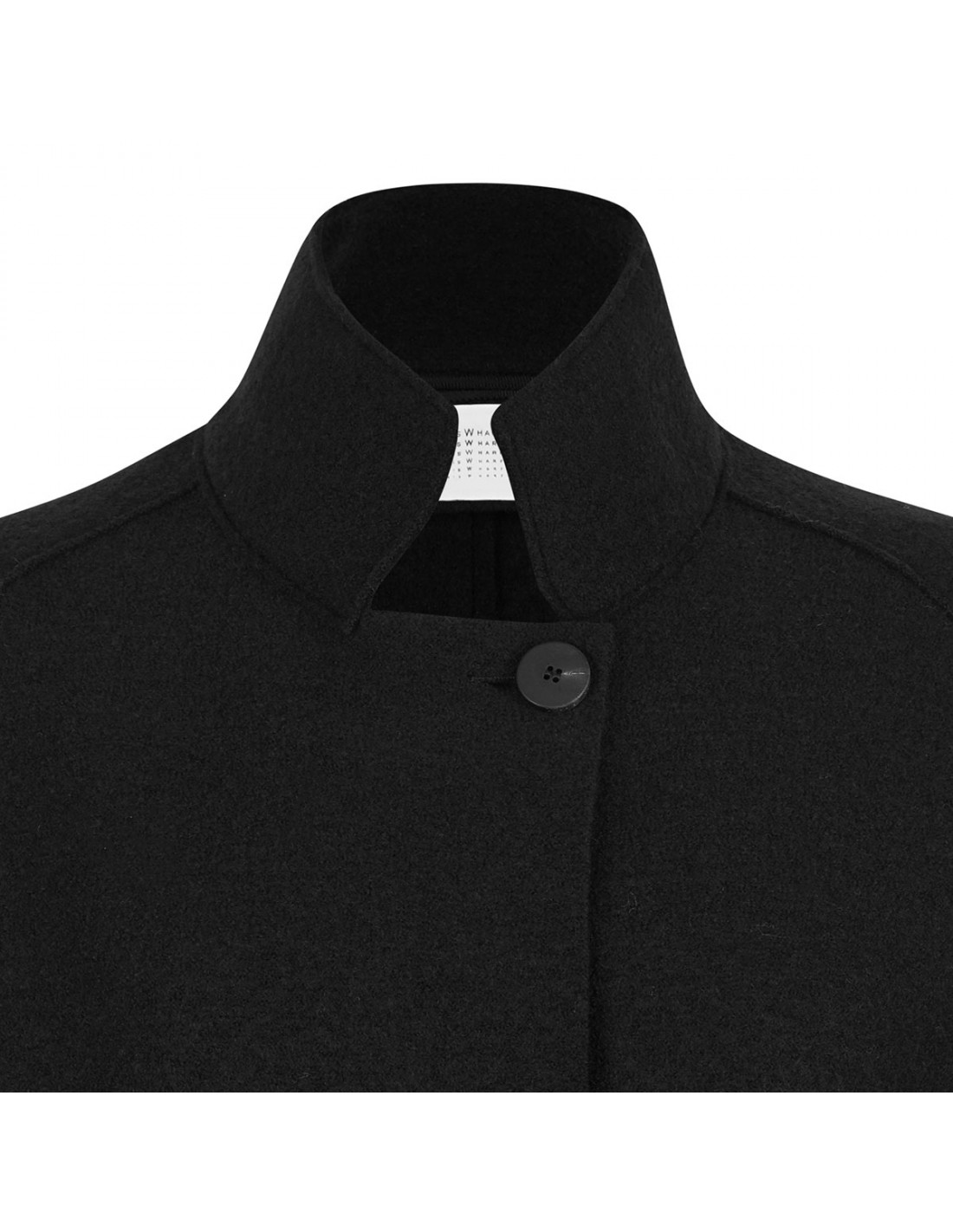 Black knitted felted wool cape from Harris Wharf London featuring long raglan sleeves, stand up collar, two button fastening, side pockets, raw-edge finishing.